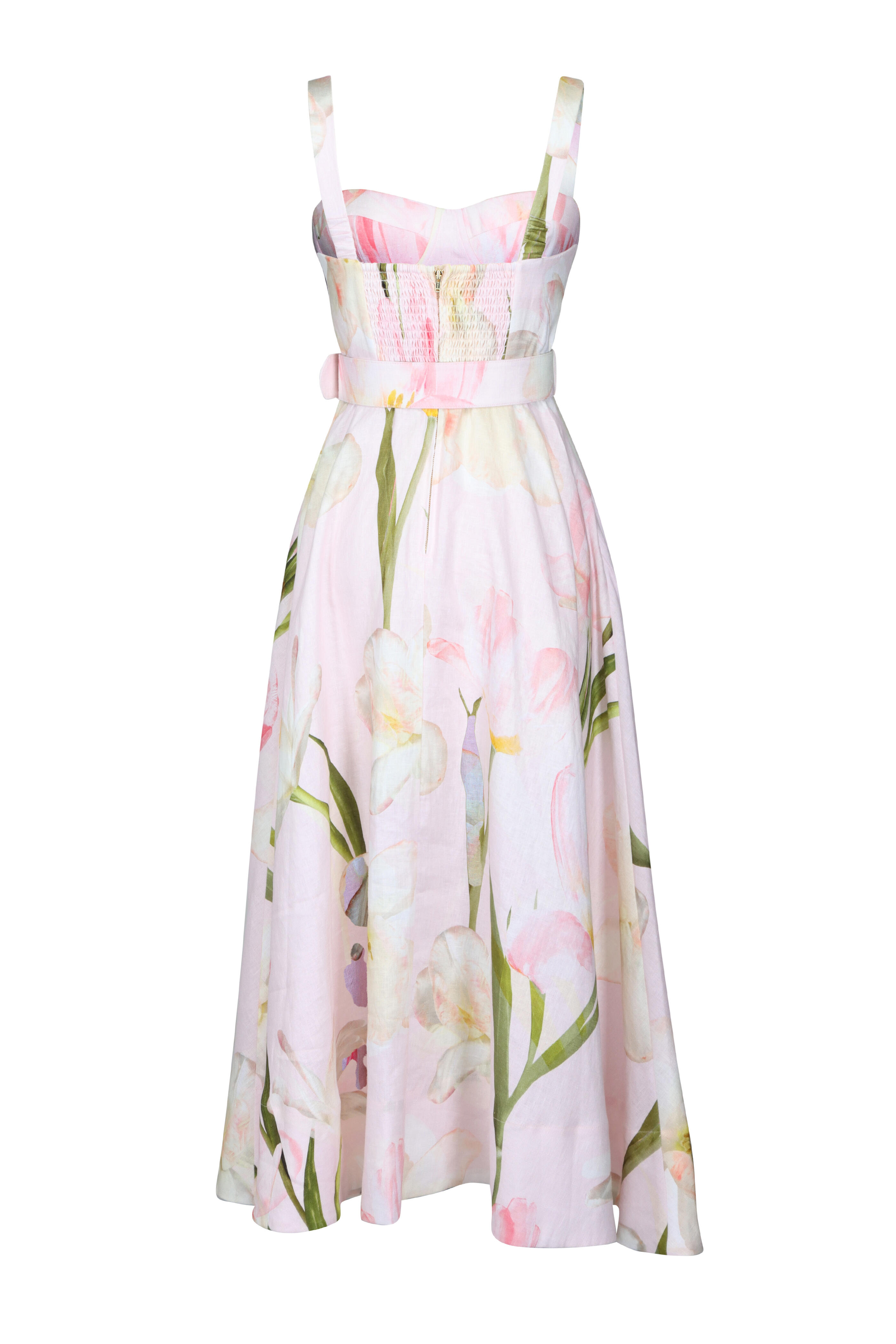 Sweetheart neckline. Bustier top with elastic at the back of the straps. Metal underwire at bra cups. Center back zip and hook-and-eye. Removable belt with self covered square buckle. Functional side seam pockets. Imported. Midi length. 100% Linen. Dry clean.