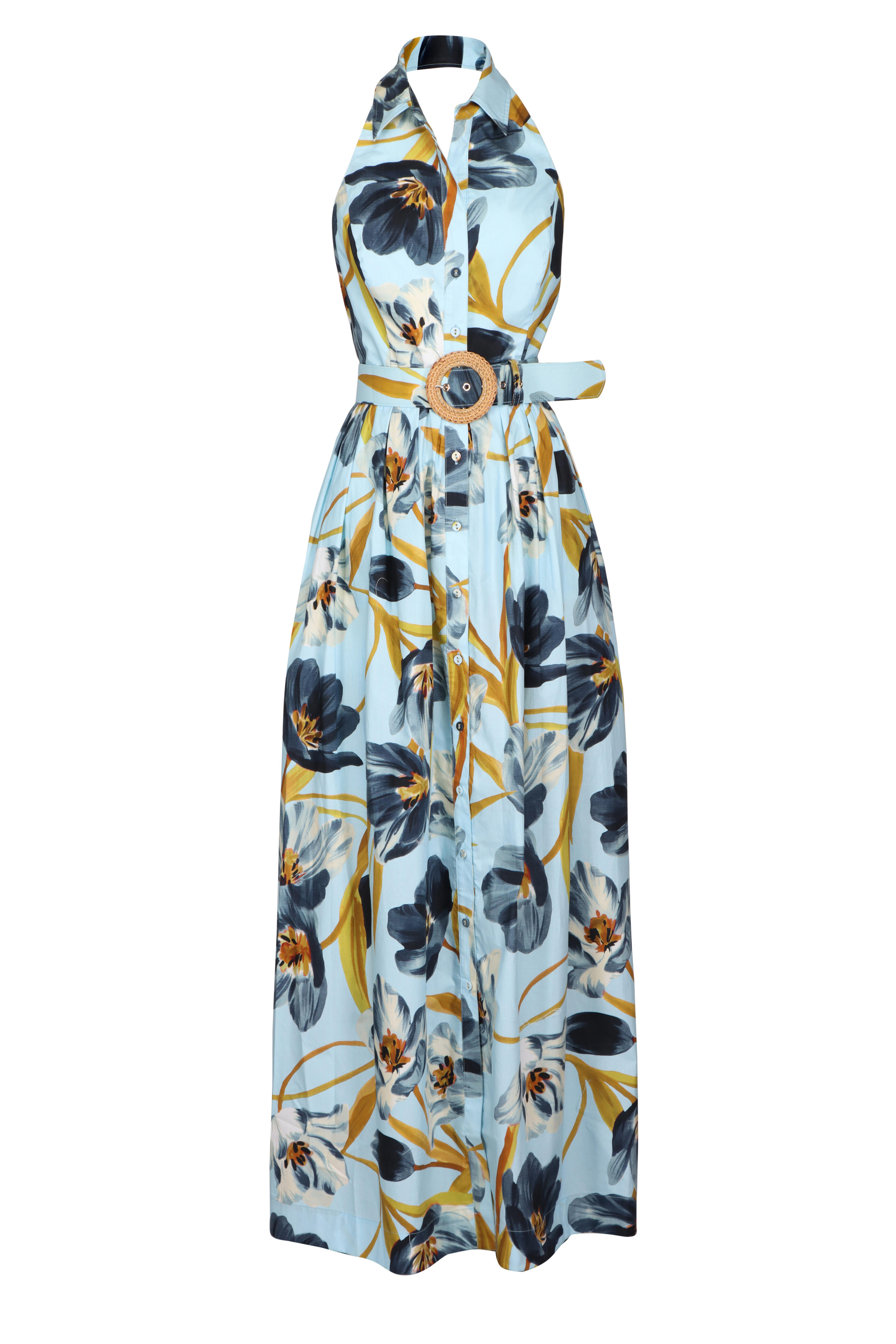 Spread collar. Front button down; halter neck. Adjustable belt. Side seam pockets at shirred skirt. Smocking at center back. Imported. 100% Cotton Poplin. Dry clean.