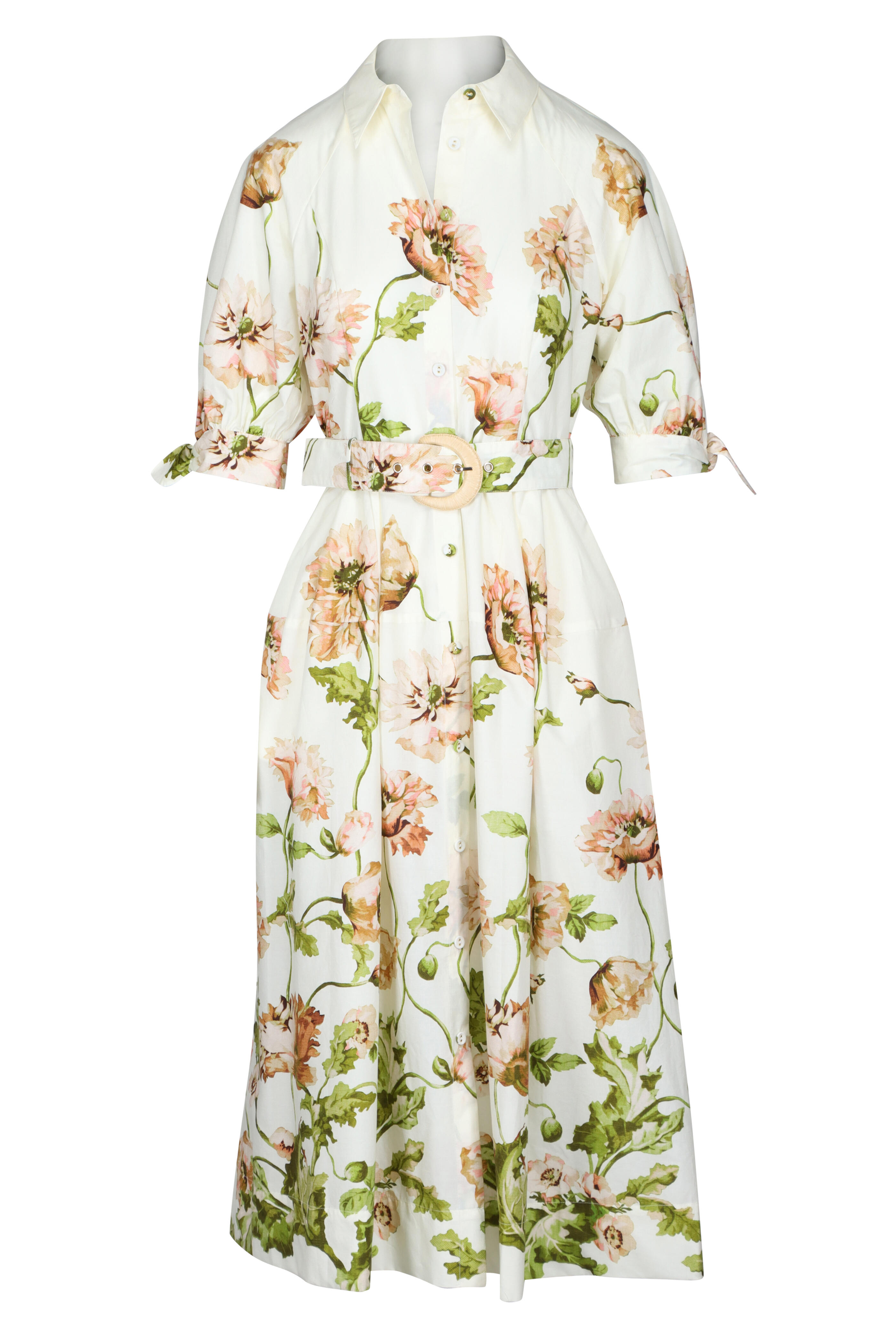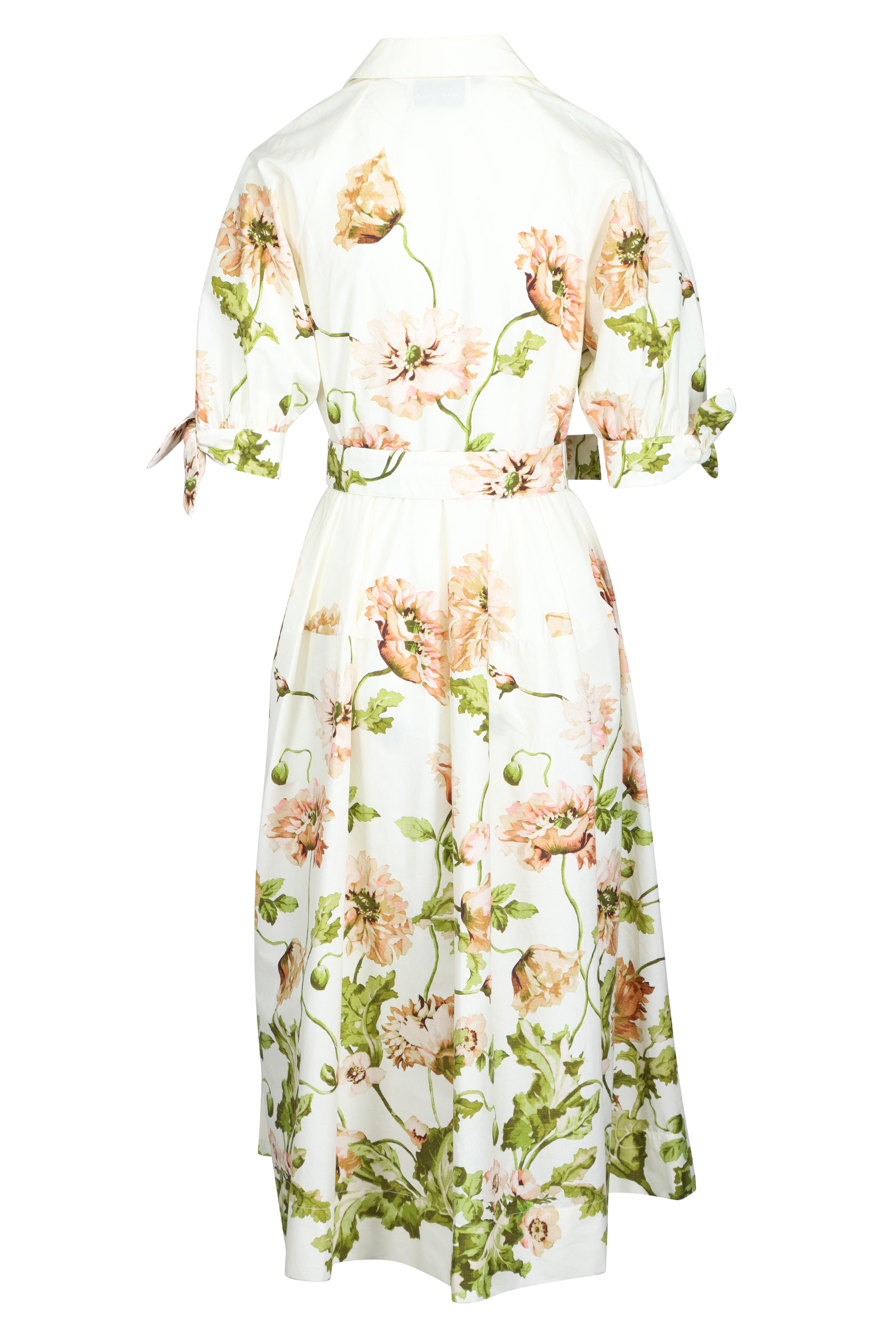 Collar at neckline with functional center front placket. Raglan armhole. Bows at sleeves that tie. Self covered belt with raffia buckle. Functional side seam pockets. Imported. 100% Cotton poplin. Dry clean.