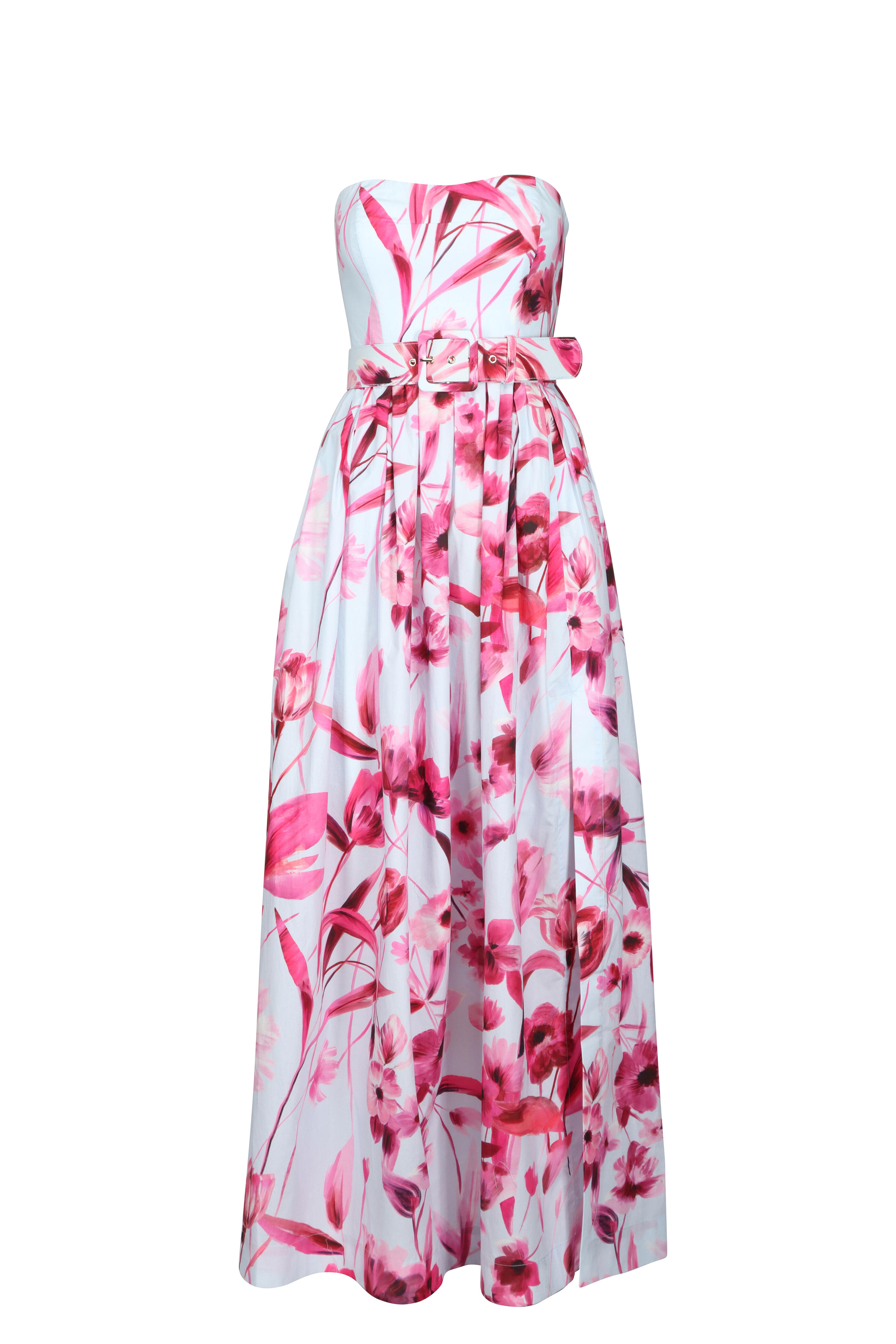 Strapless bustier top with a sweetheart neckline. Boned bodice. Center back zipper opening with hook-and-eye. Tucks and pleats at waist. Bodice has boning at side-seams and princess seams. Slit in the skirt on wearers left. Imported. Maxi length. 100% Cotton Poplin. Dry clean.