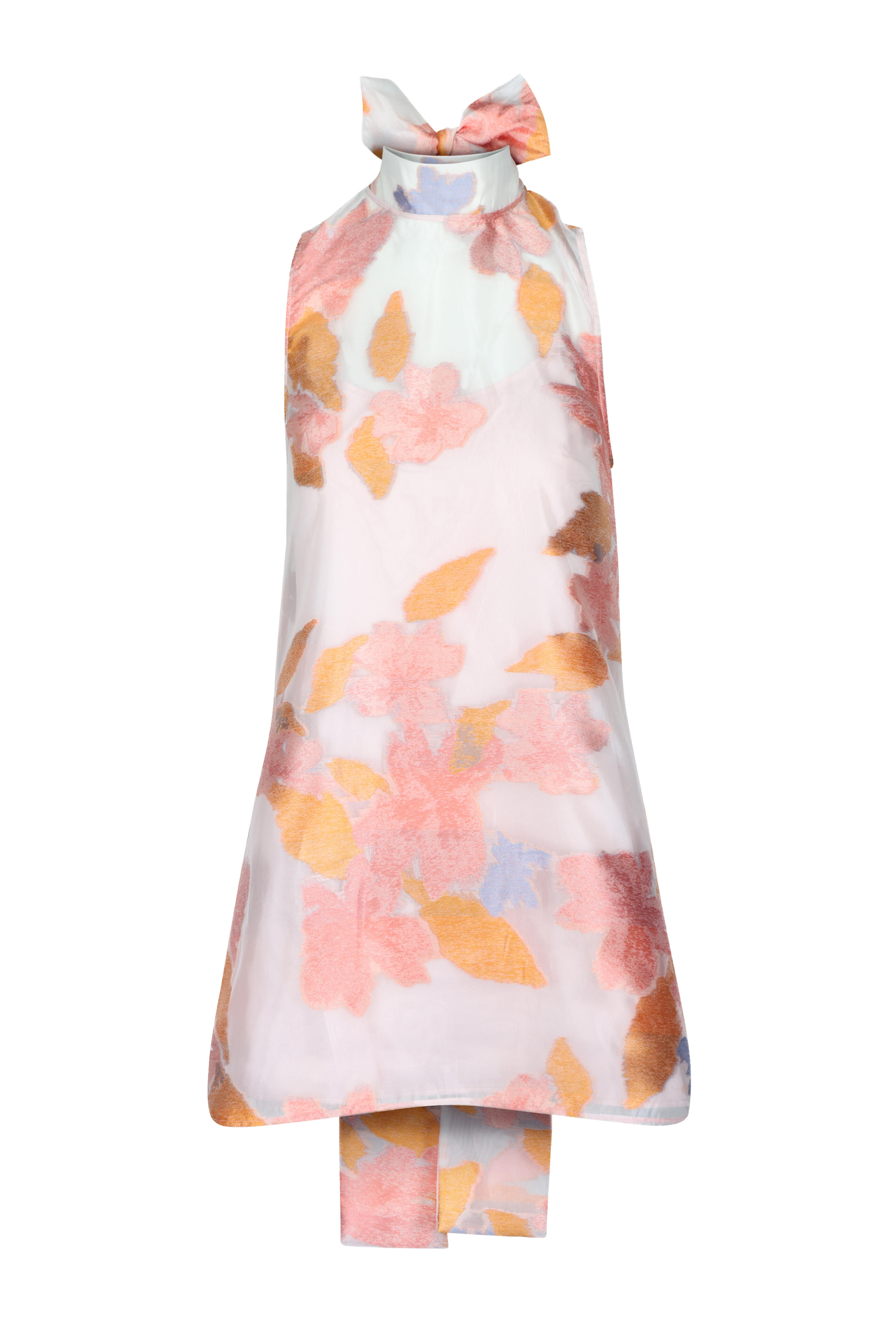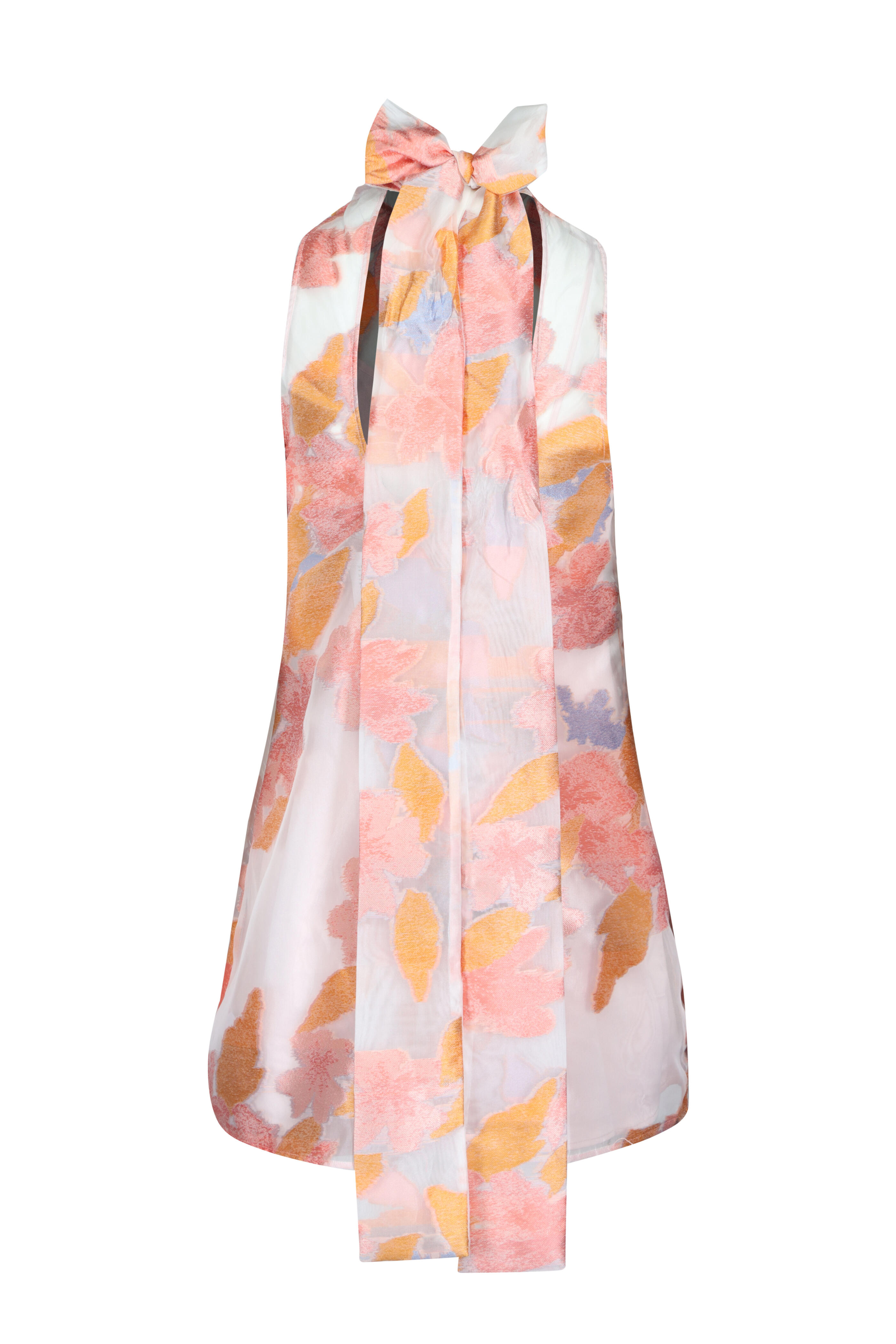 High neck. Tie at neck back. Sleeveless. Slip lining. Imported. 80% polyester, 20% nylon; lining: 95% polyester, 5% elastane. Dry clean.
