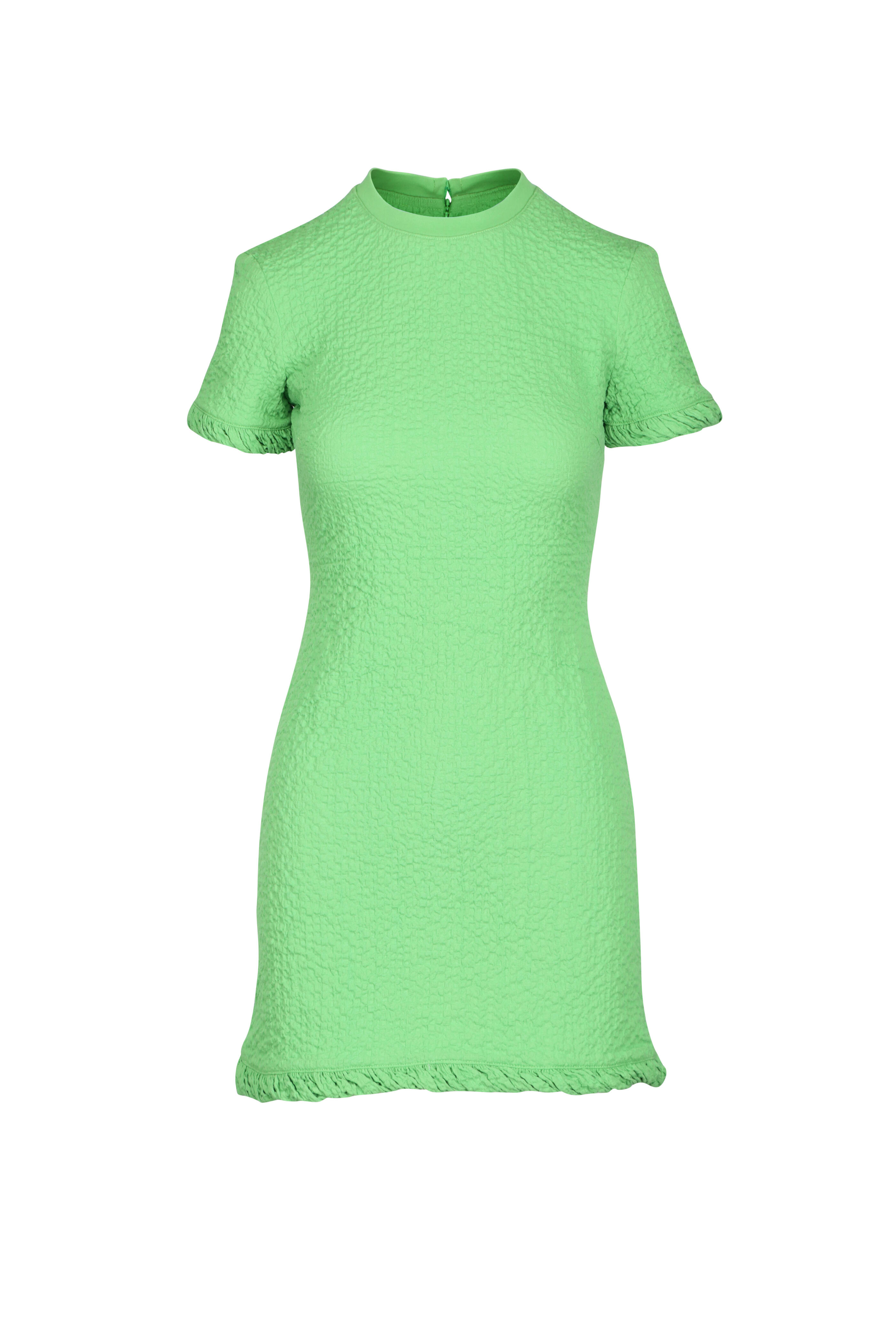 Ribbed crewneck. Short sleeves. Darts at bust. Gathered cuffs and hem. Imported. 33" length. 99% cotton, 1% elastane. Dry clean.