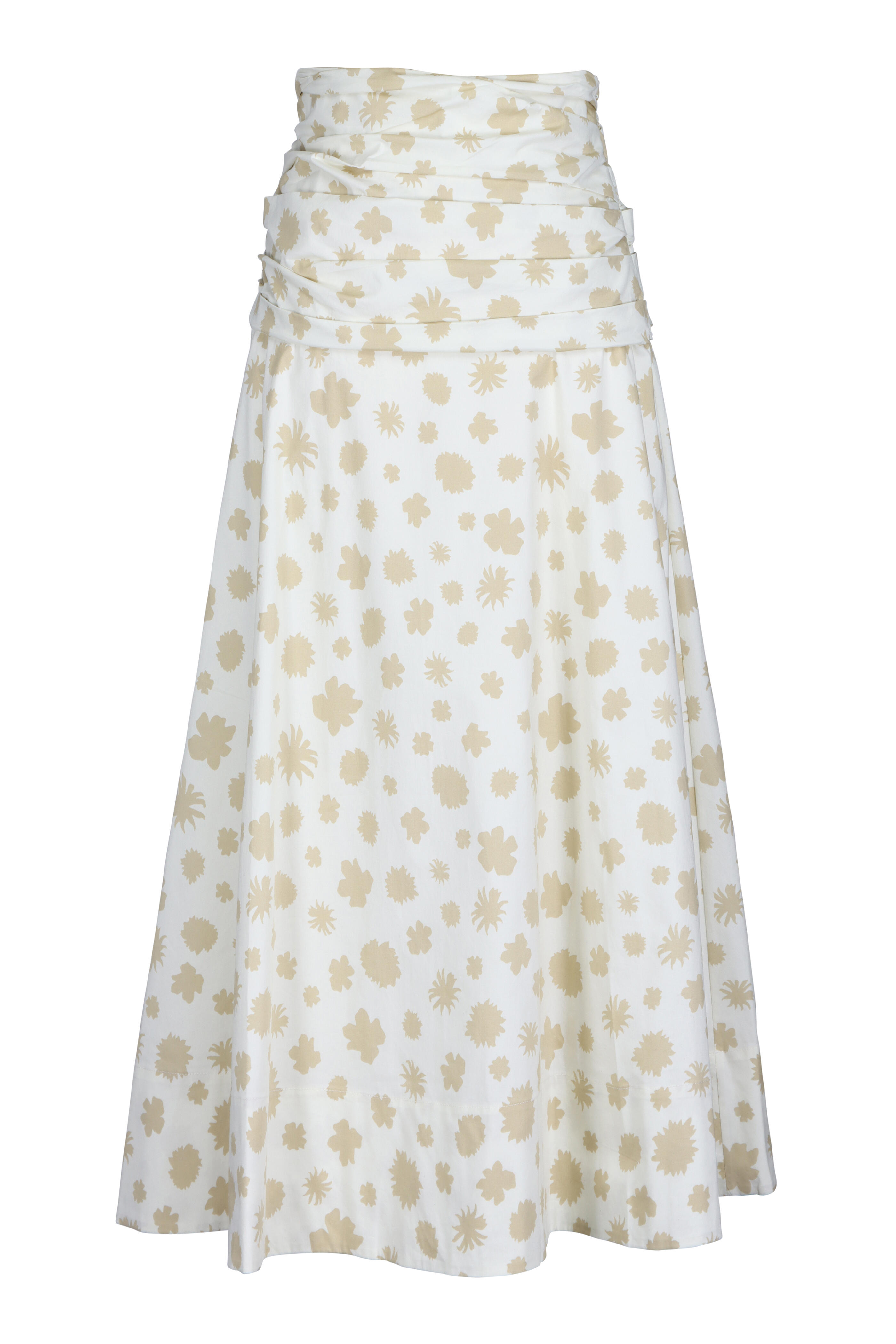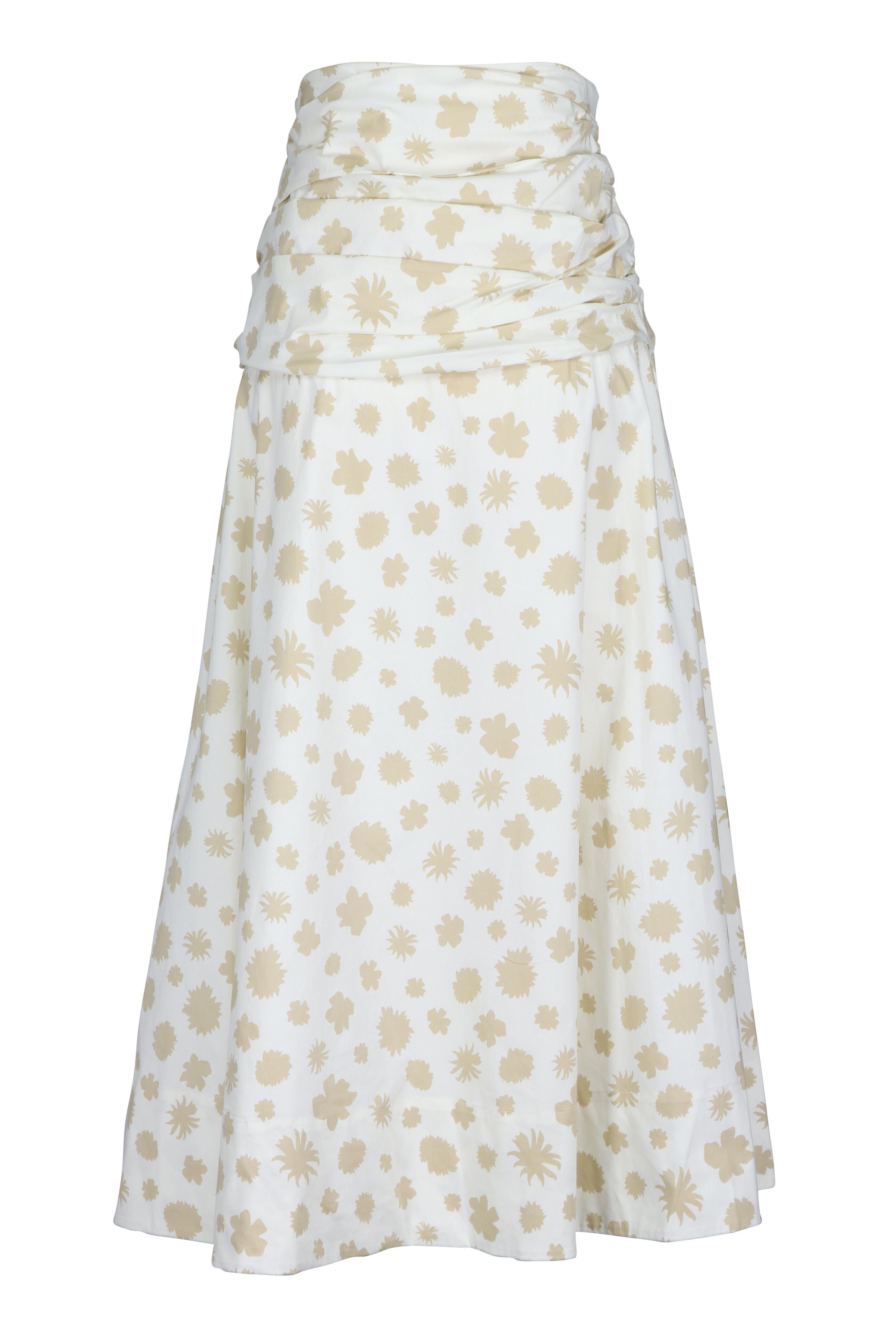 Mid-rise. A-line silhouette. Rouching at the waist. Imported. 98% Cotton 2% Elastane. Machine wash cold.