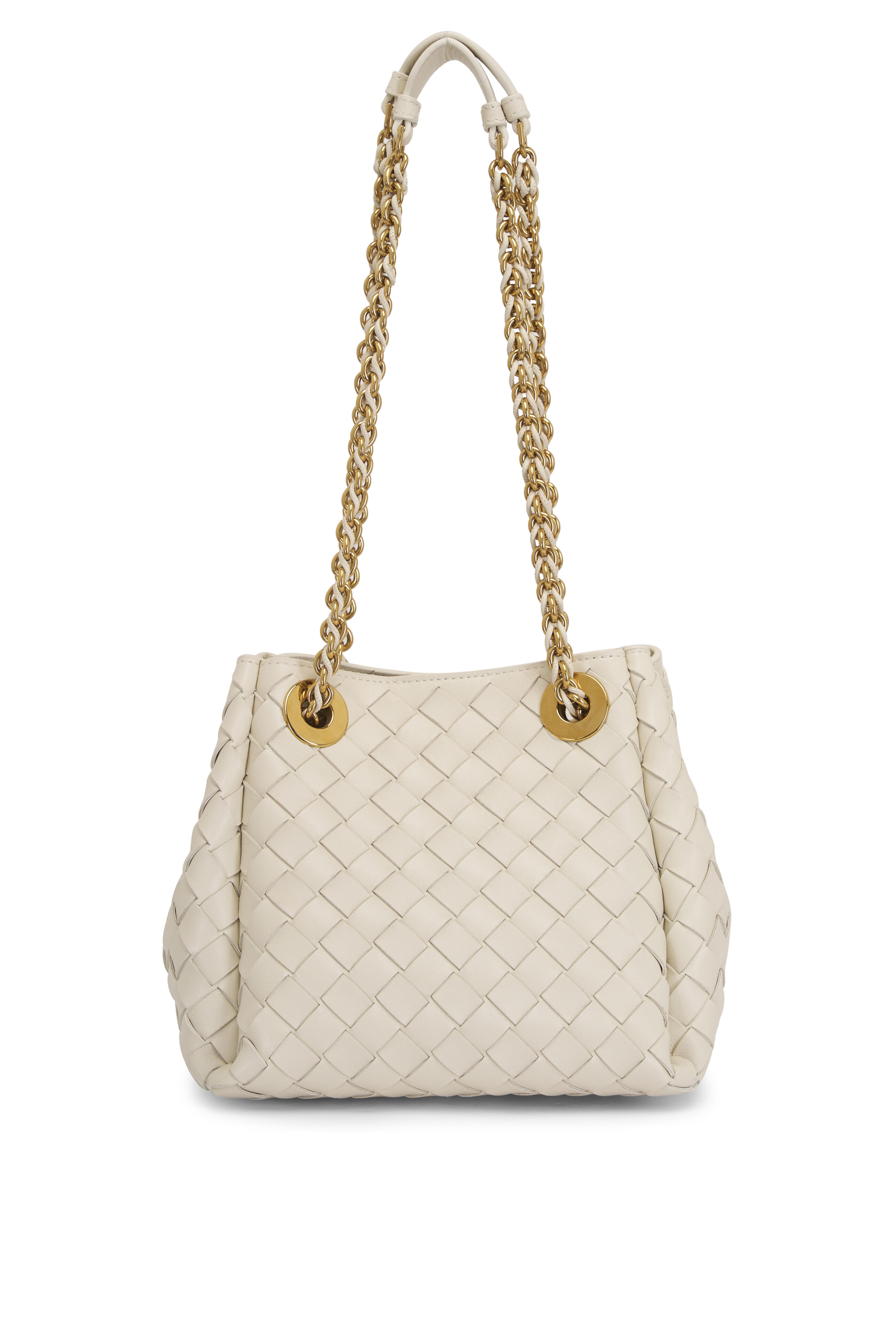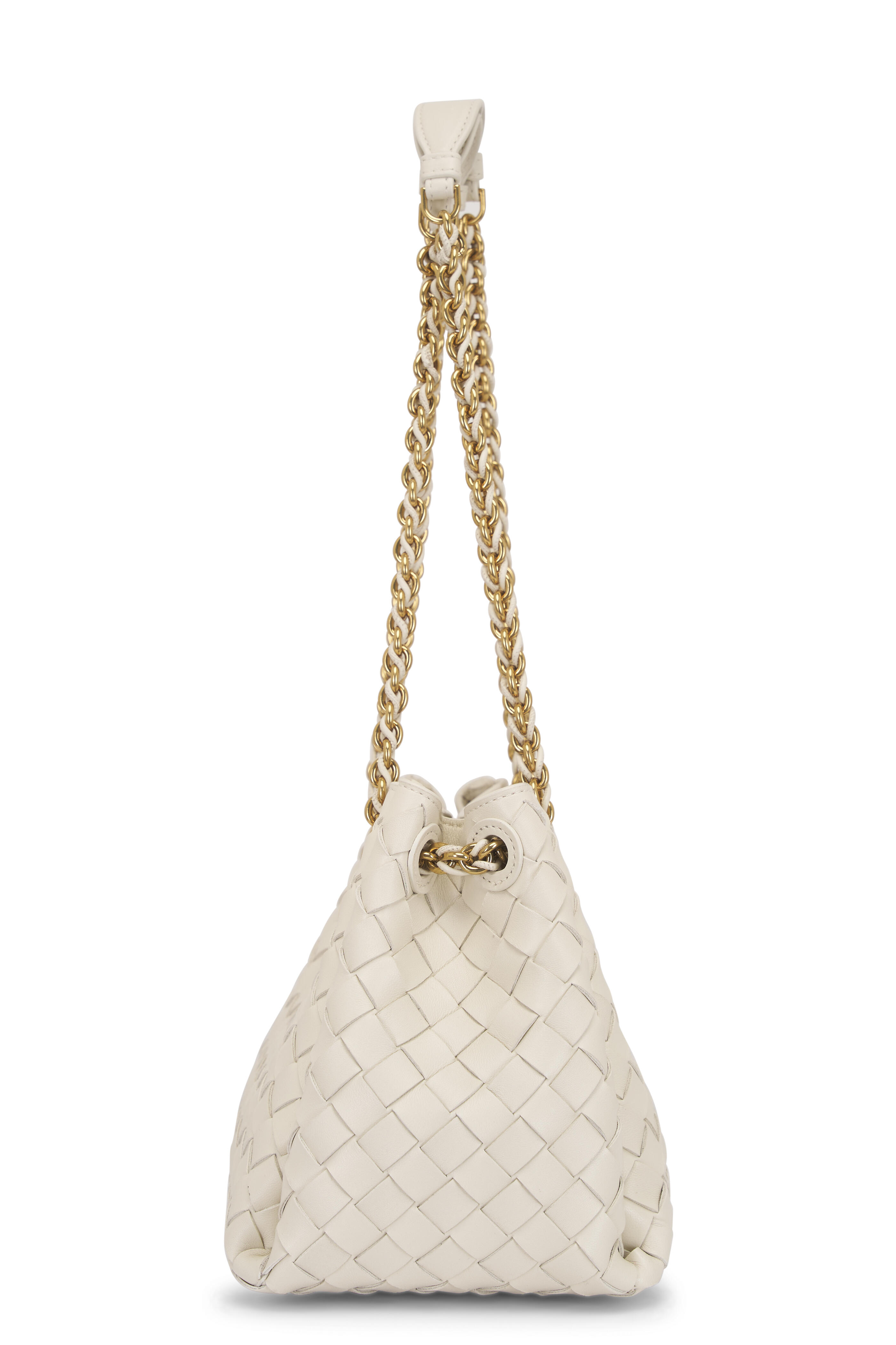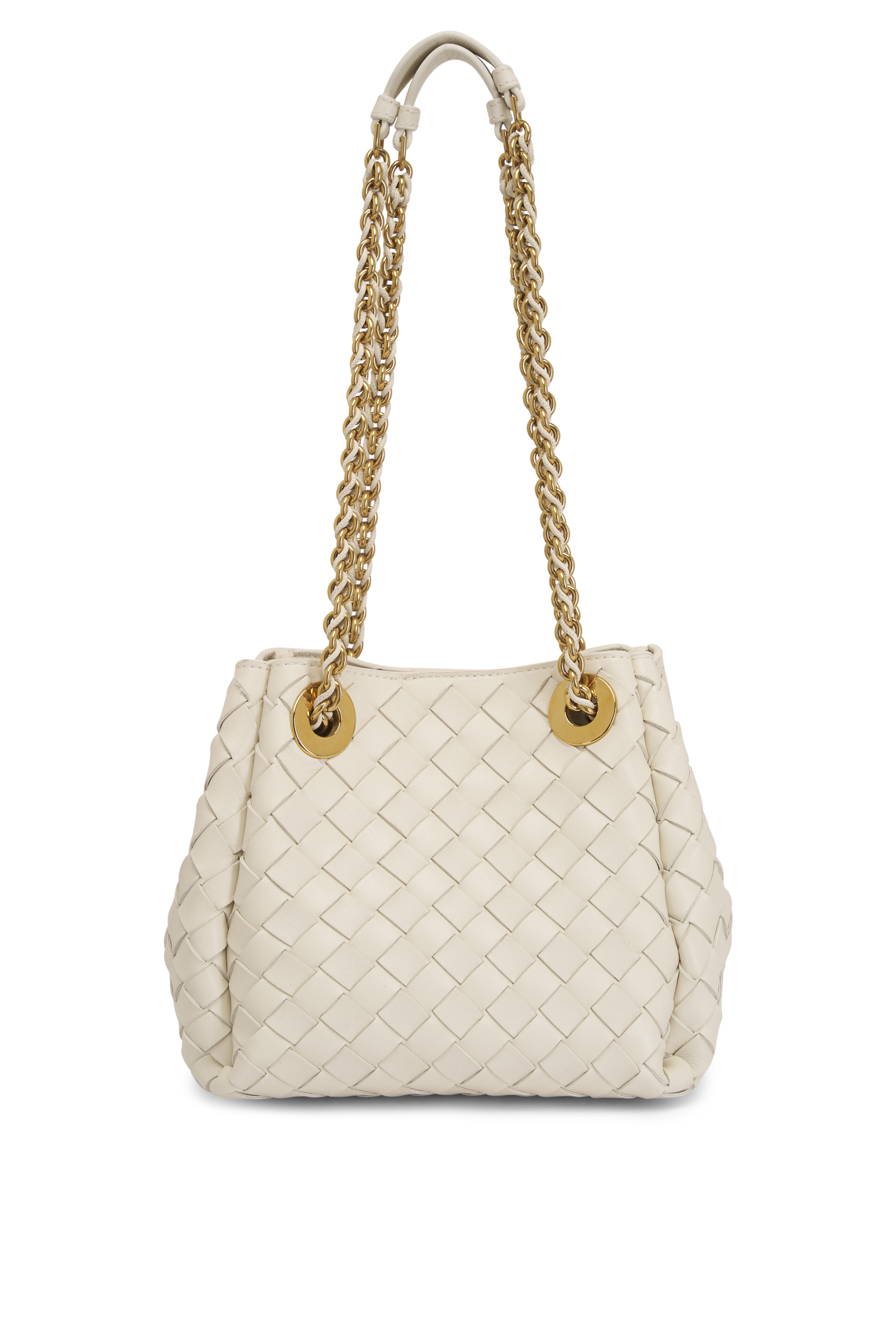 Intrecciato lambskin leather. Magnetic tab closure. Sliding crossbody chain strap. Single open compartment. Lambskin bonded Intrecciato lining. Brass finish hardware. Made in Italy. Height: 6.5”. Width: 7.9”. Depth: 6.7”. Handle drop: 7.9”. Strap drop: 20.5”.