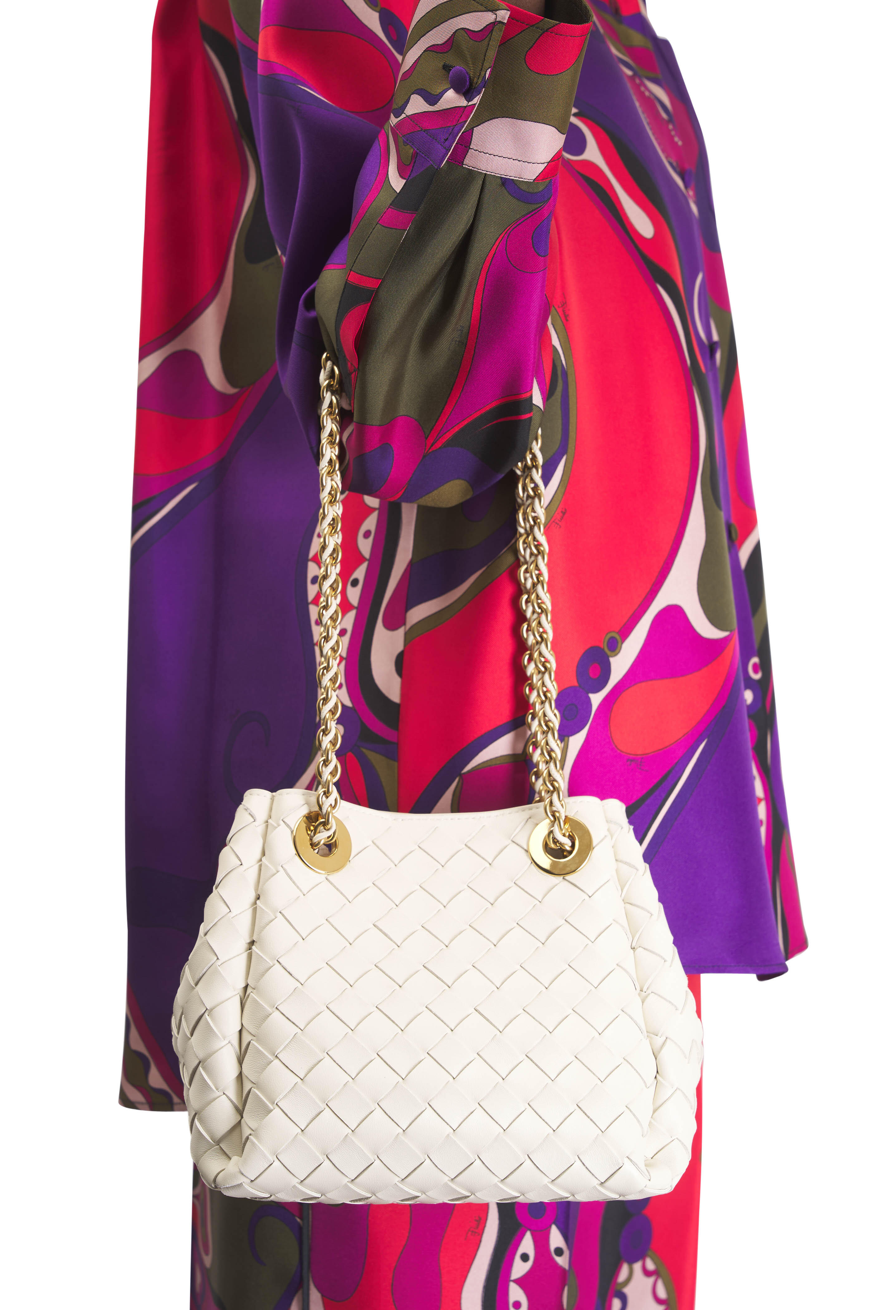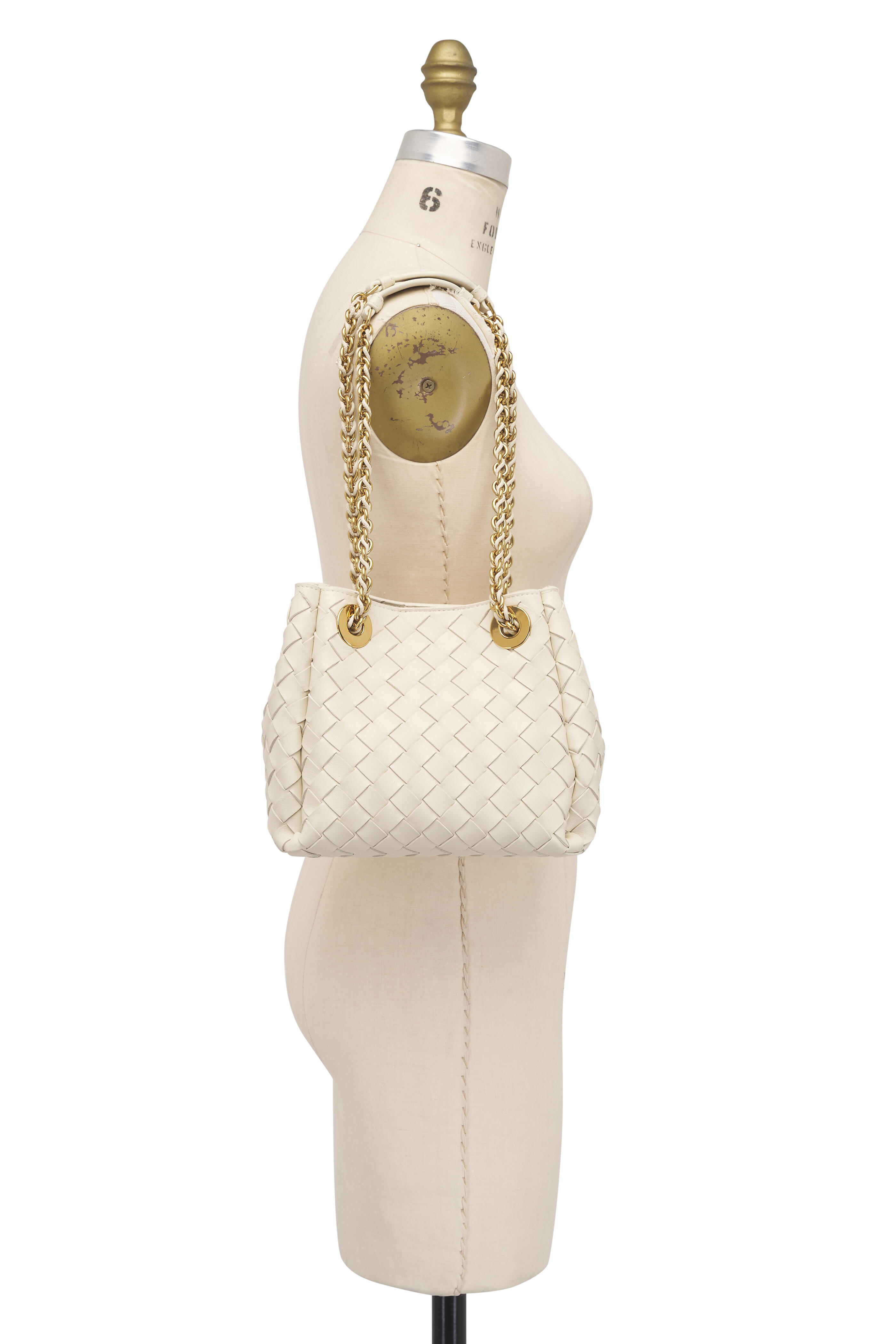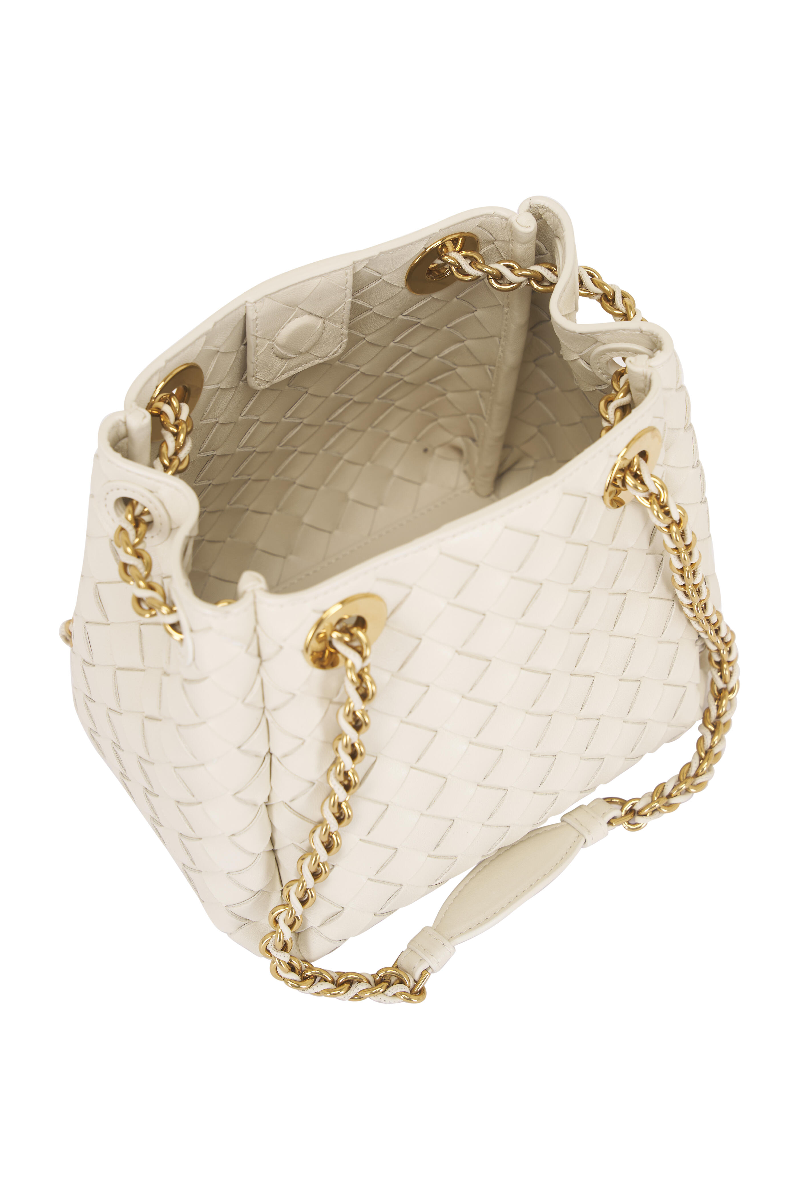 Intrecciato lambskin leather. Magnetic tab closure. Sliding crossbody chain strap. Single open compartment. Lambskin bonded Intrecciato lining. Brass finish hardware. Made in Italy. Height: 6.5”. Width: 7.9”. Depth: 6.7”. Handle drop: 7.9”. Strap drop: 20.5”.