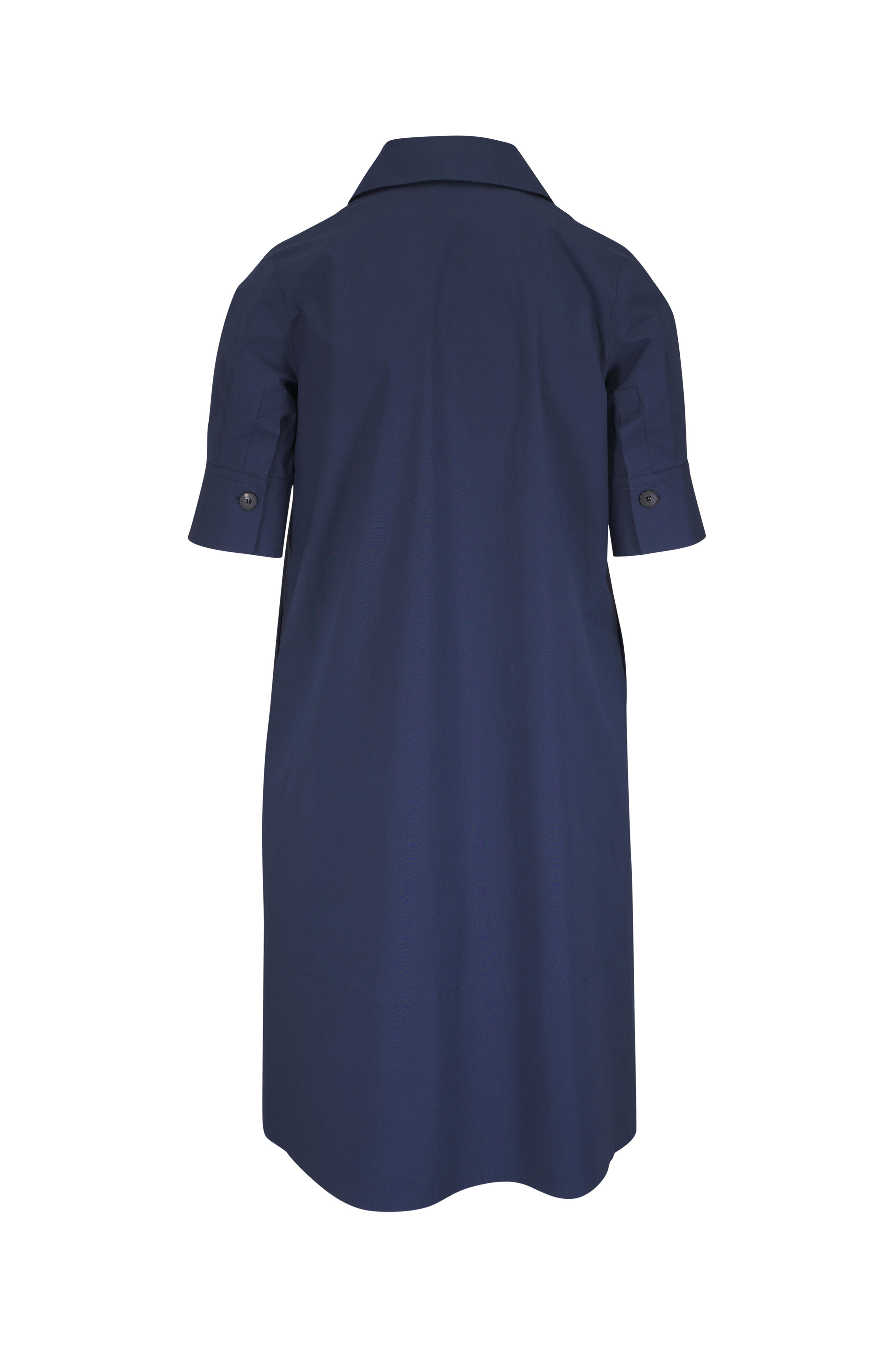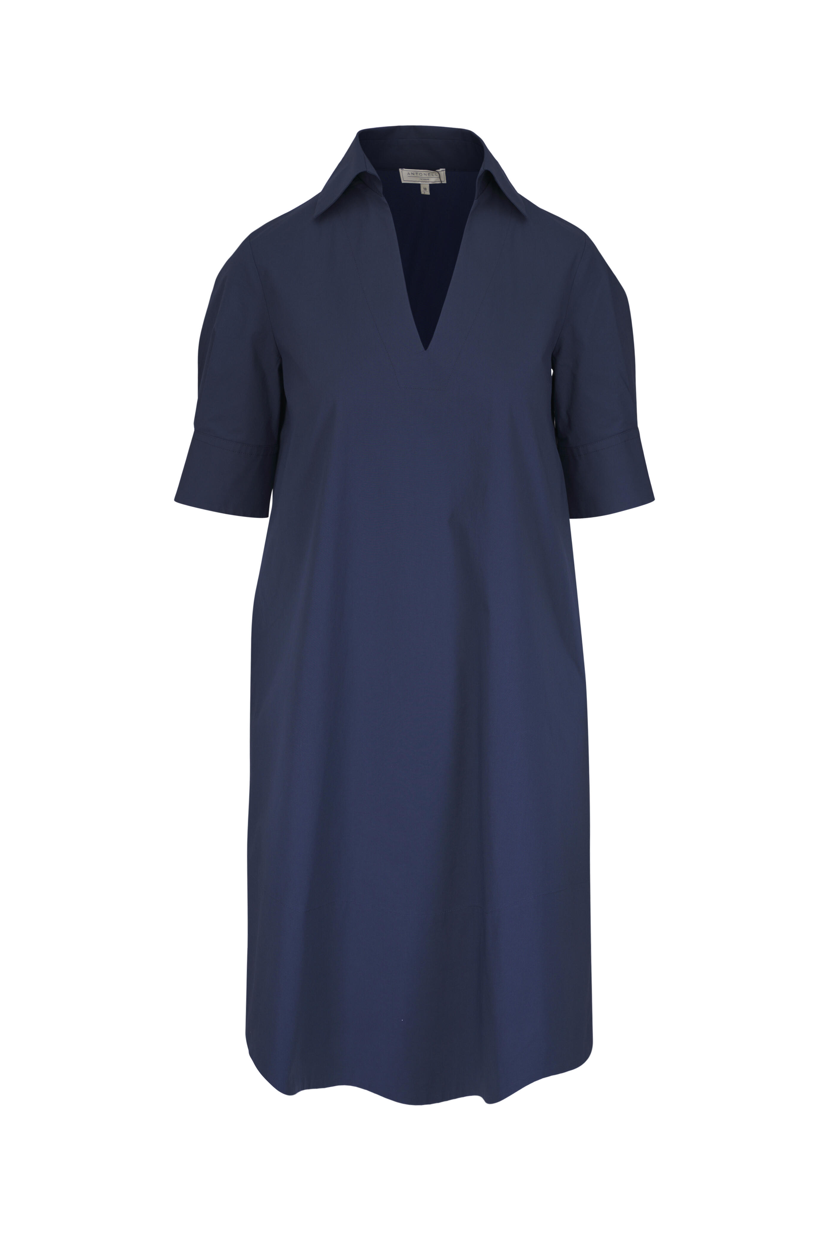 Spread collar. V-neckline. Short sleeves. Single button square cuffs. Made in Italy. 36" shoulder to hem. 95% cotton, 5% elastane. Dry clean.
