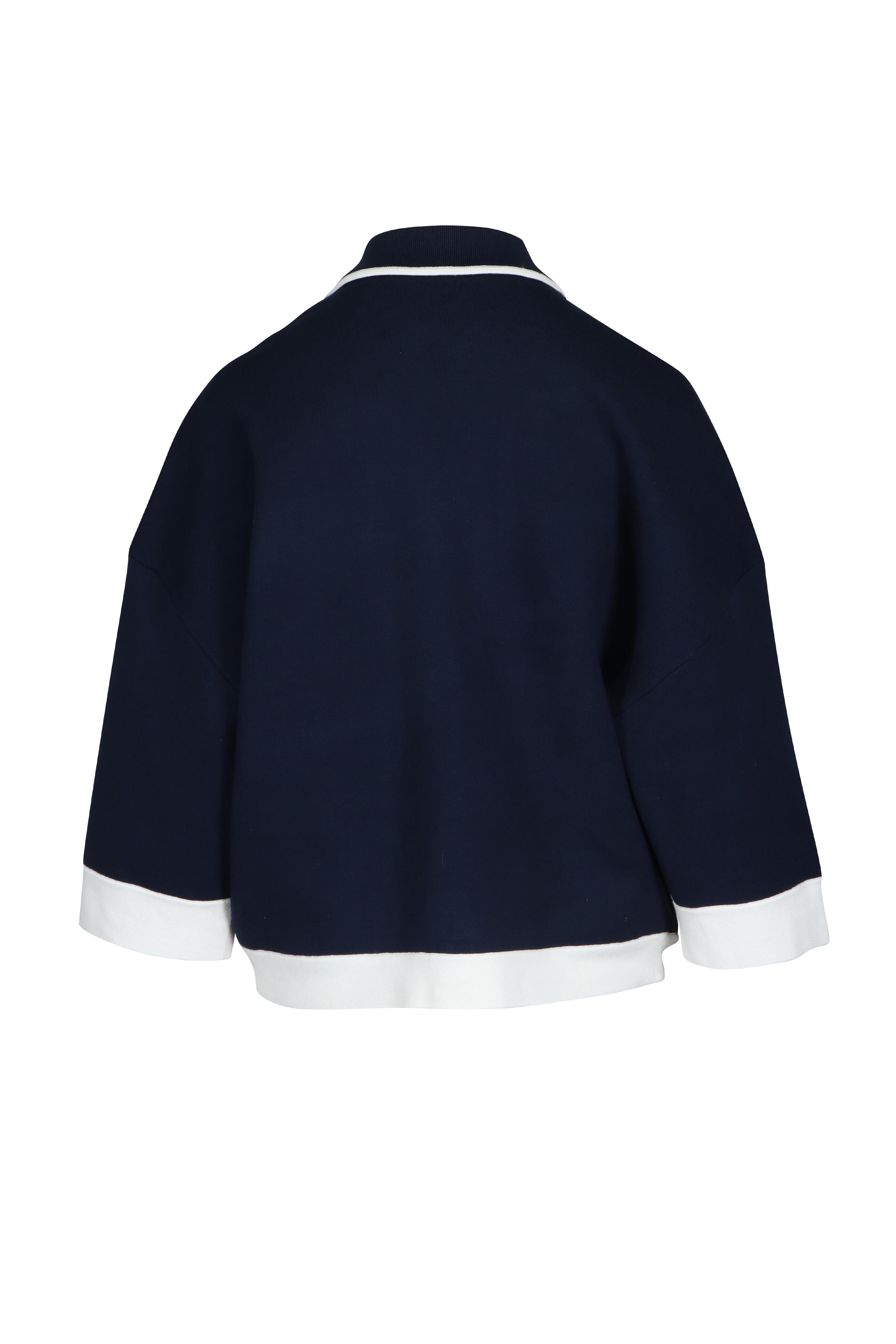 Spread collar. Dropped shoulders. 3/4 sleeves. Flower-shaped snap buttons. Flap pockets. Contrasting trims. Fine knit. Imported. Designed for a relaxed fit. 46% Viscose, 28% polyester, 20% polyester recycled, 6% polyamide. Dry clean.