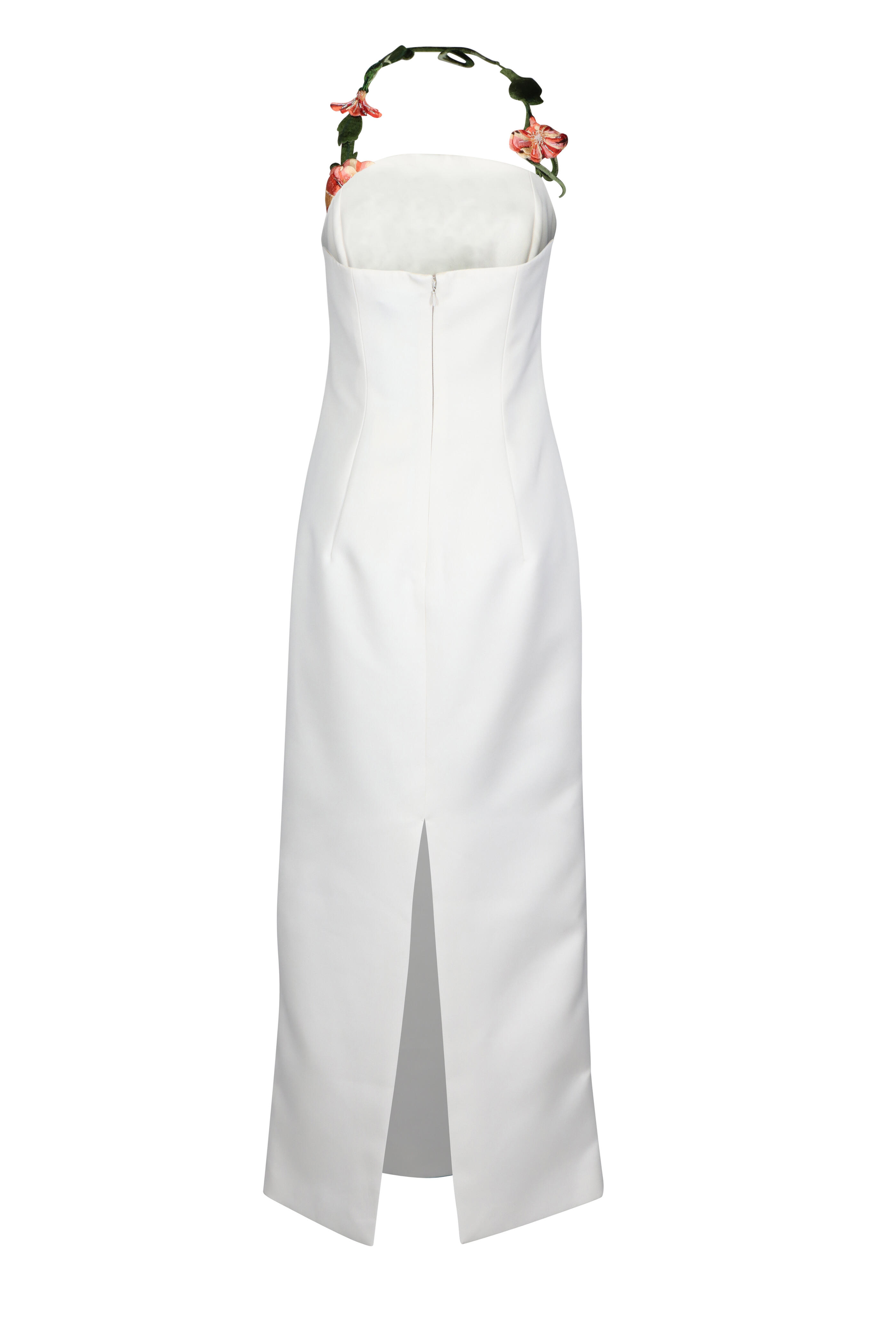 Detachable halter vine strap. Invisible back zip closure. Back center split. Floral appliqué detailing with hand sewn beading embellishments. Imported. Fits true to size.. 100% Polyester. Dry clean only.
