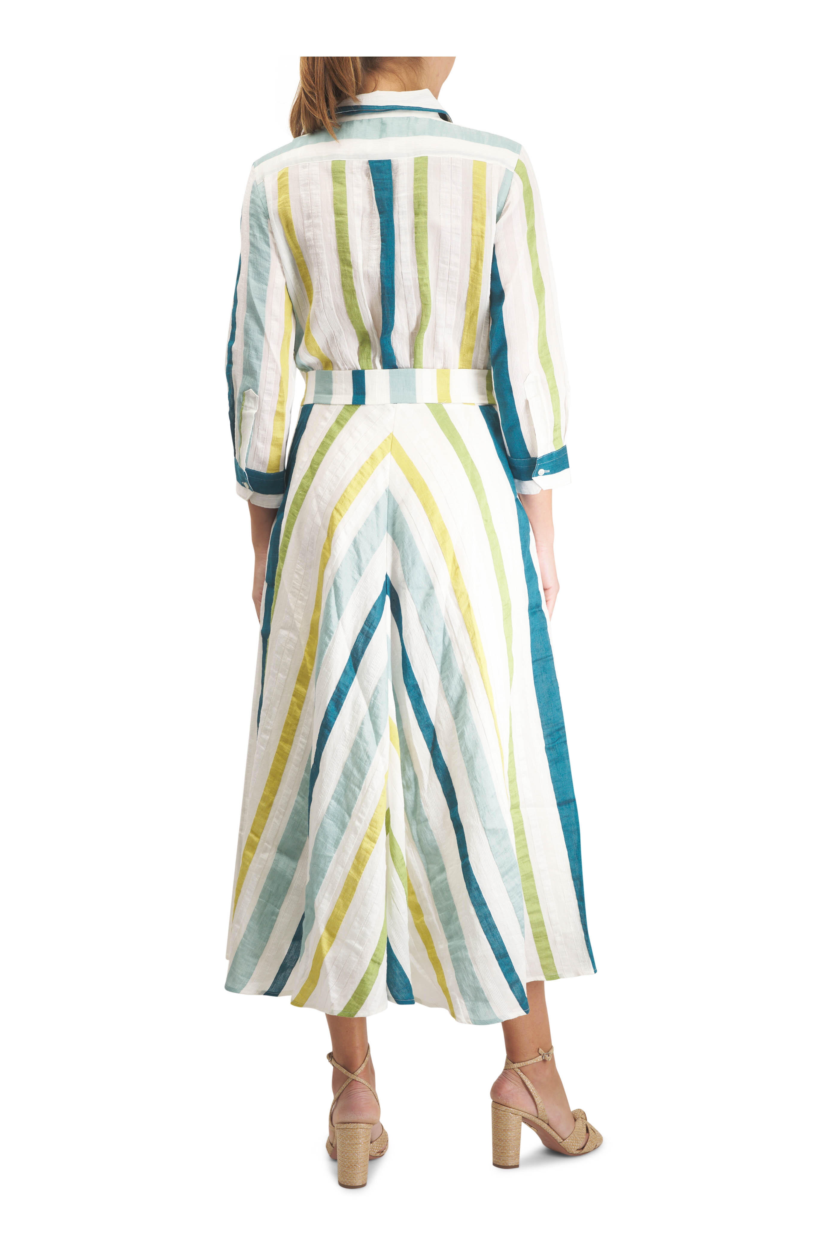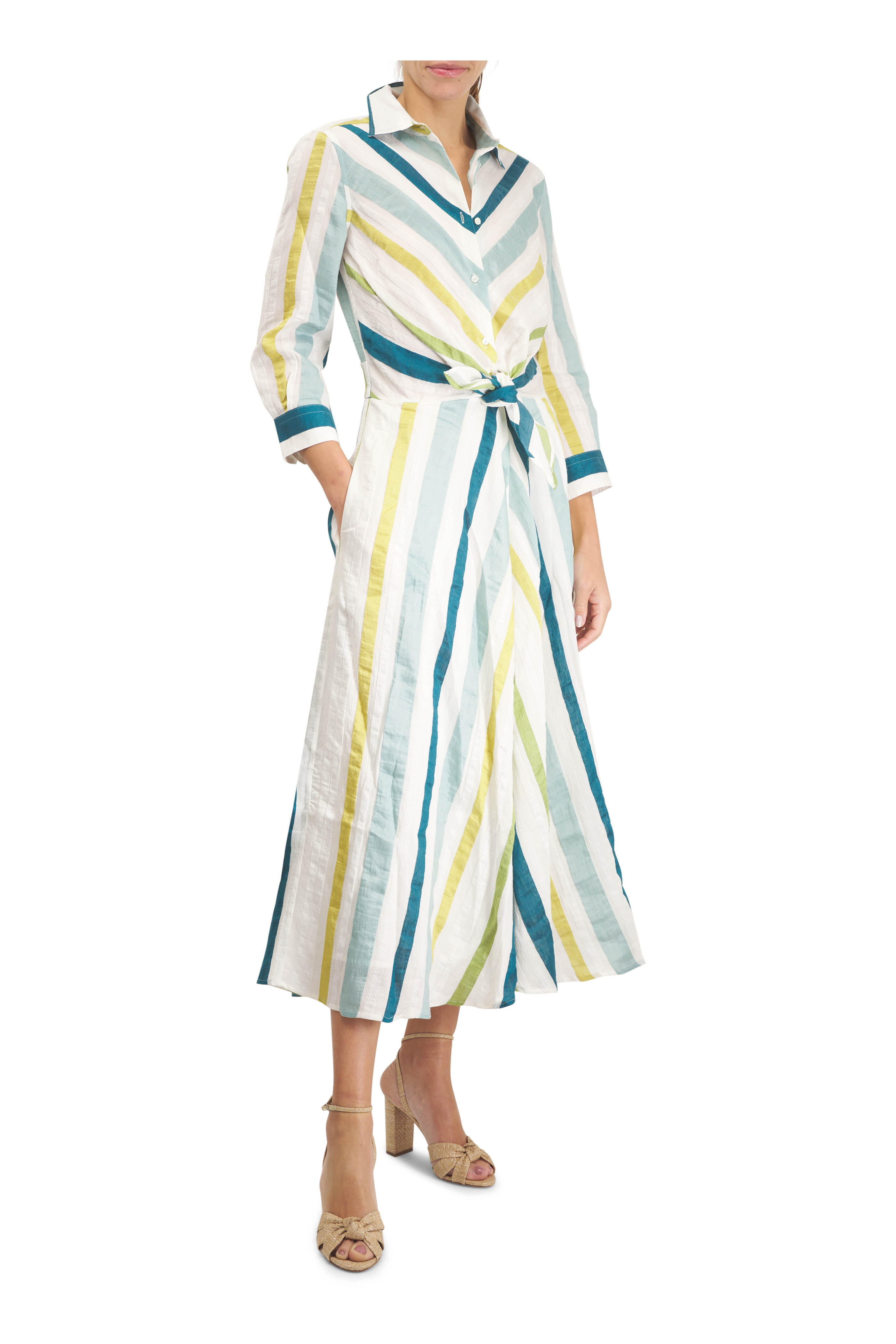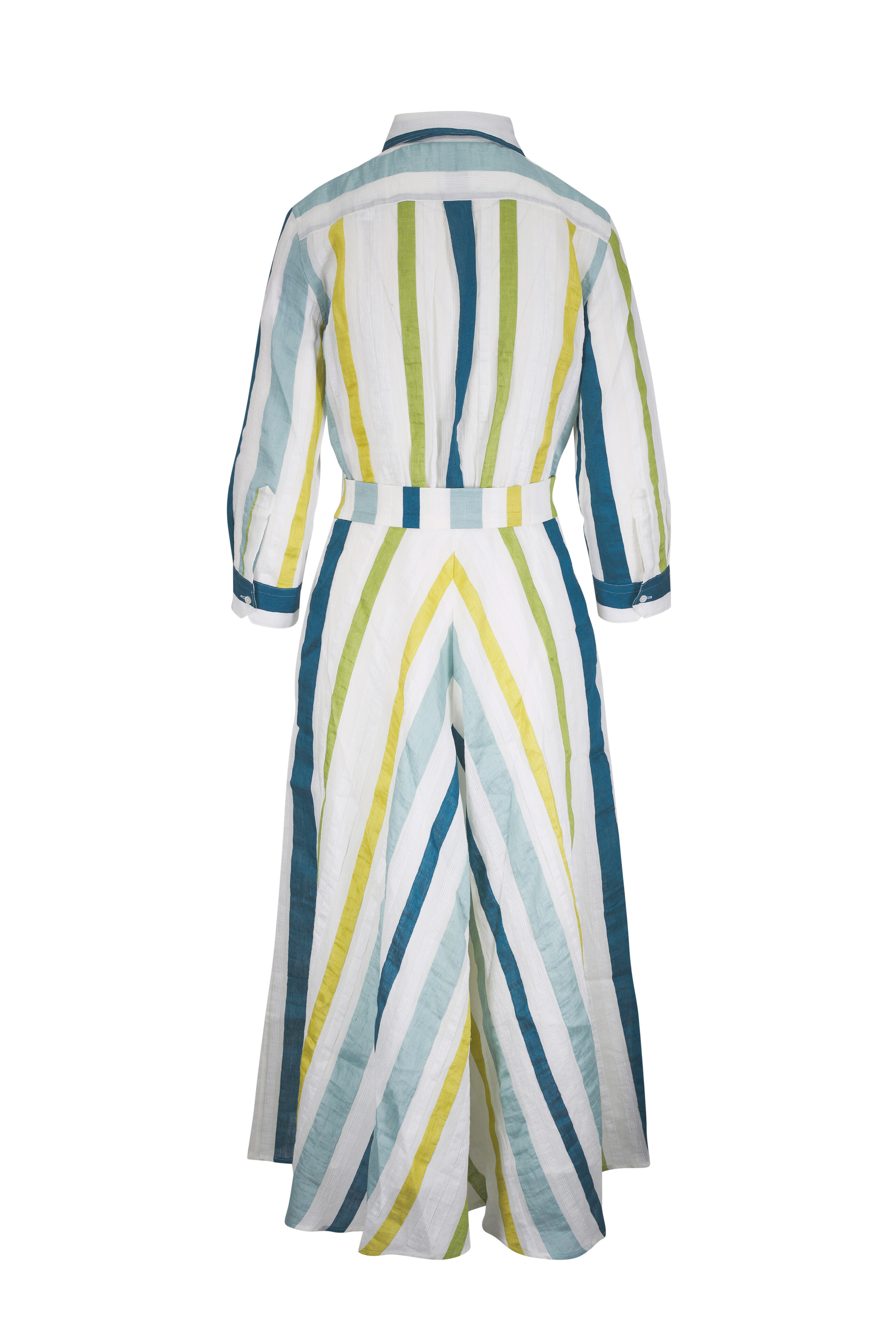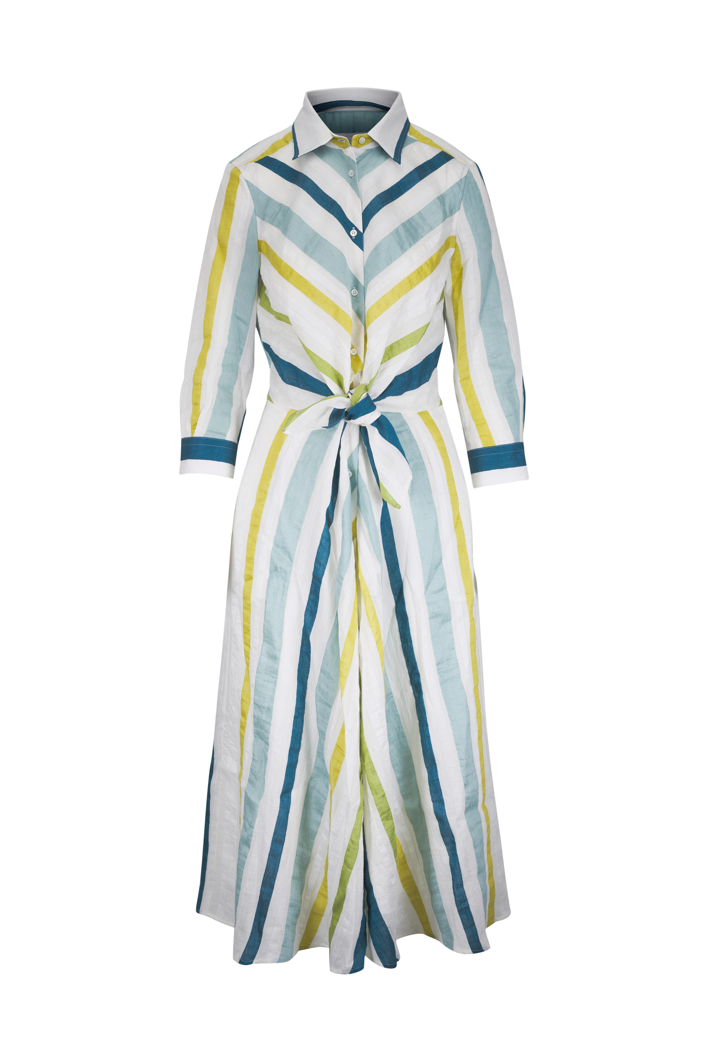 Spread collar. Front button placket. Front tie detail. Side slip pockets. Single button mitered cuffs. Made in Italy. 52" shoulder to hem. 64% linen, 23% cotton, 13% polyamide. Dry clean.