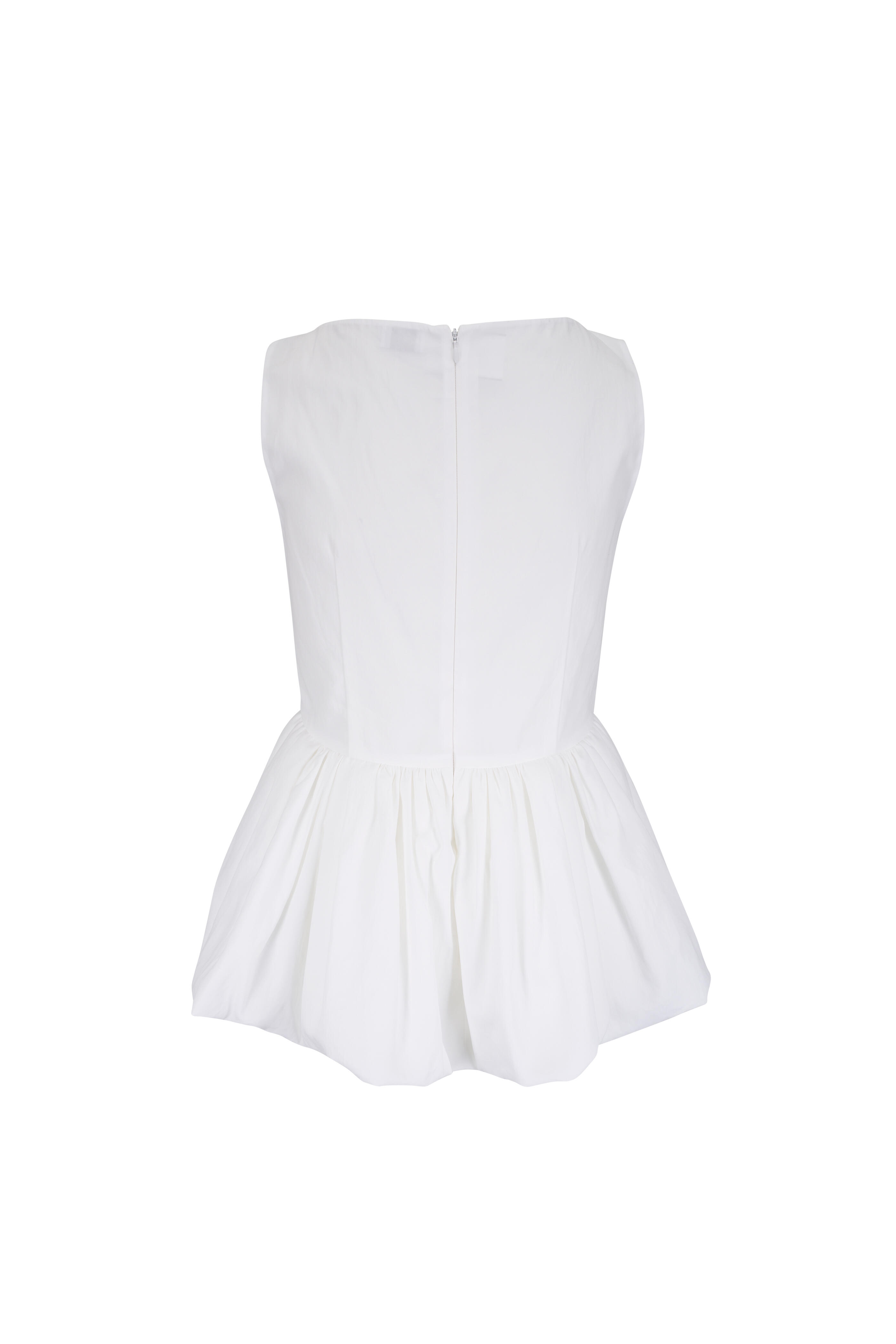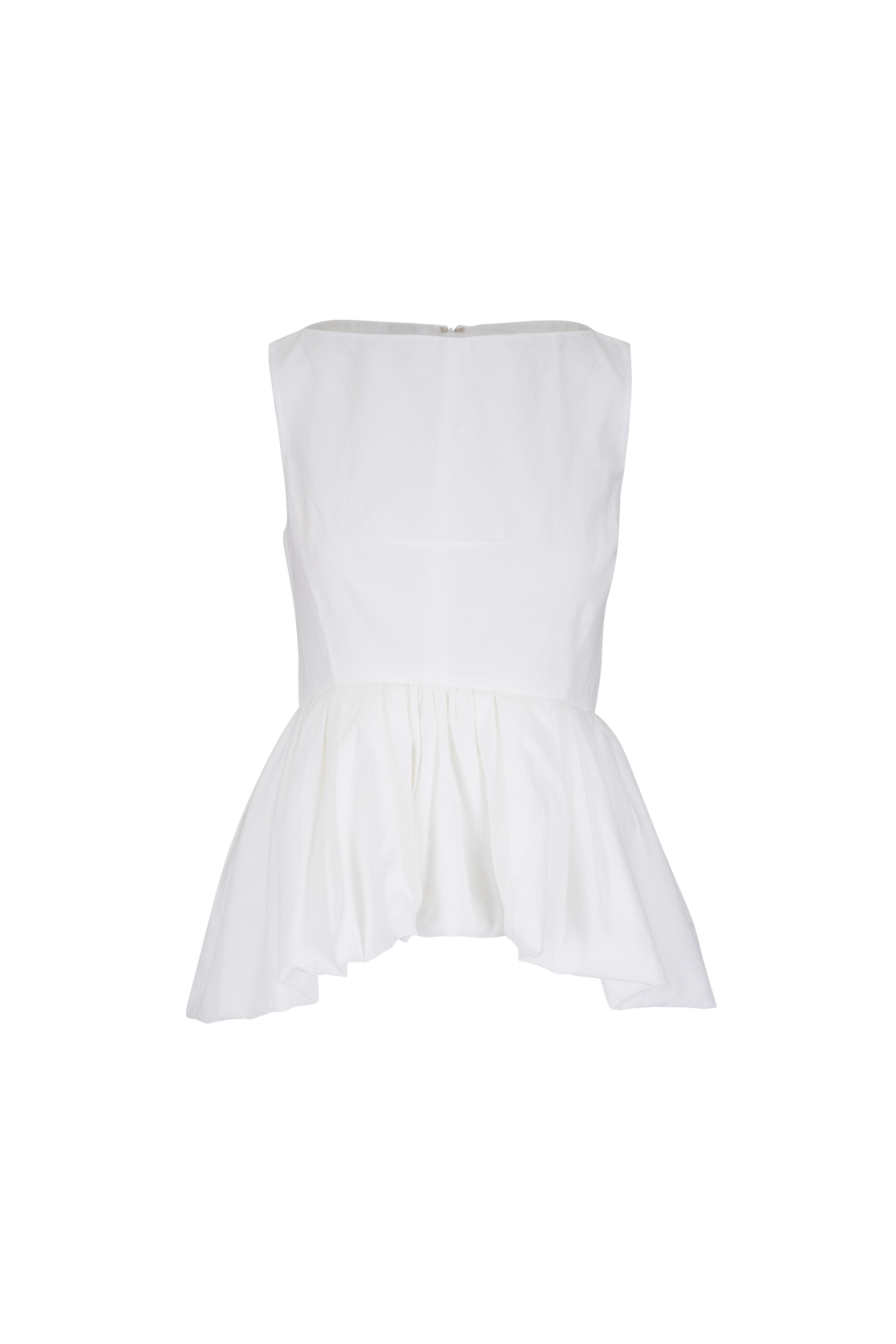 Bateau neckline. Concealed back zip. Tulle filled peplum hem. Imported. 100% cotton. Dry clean.