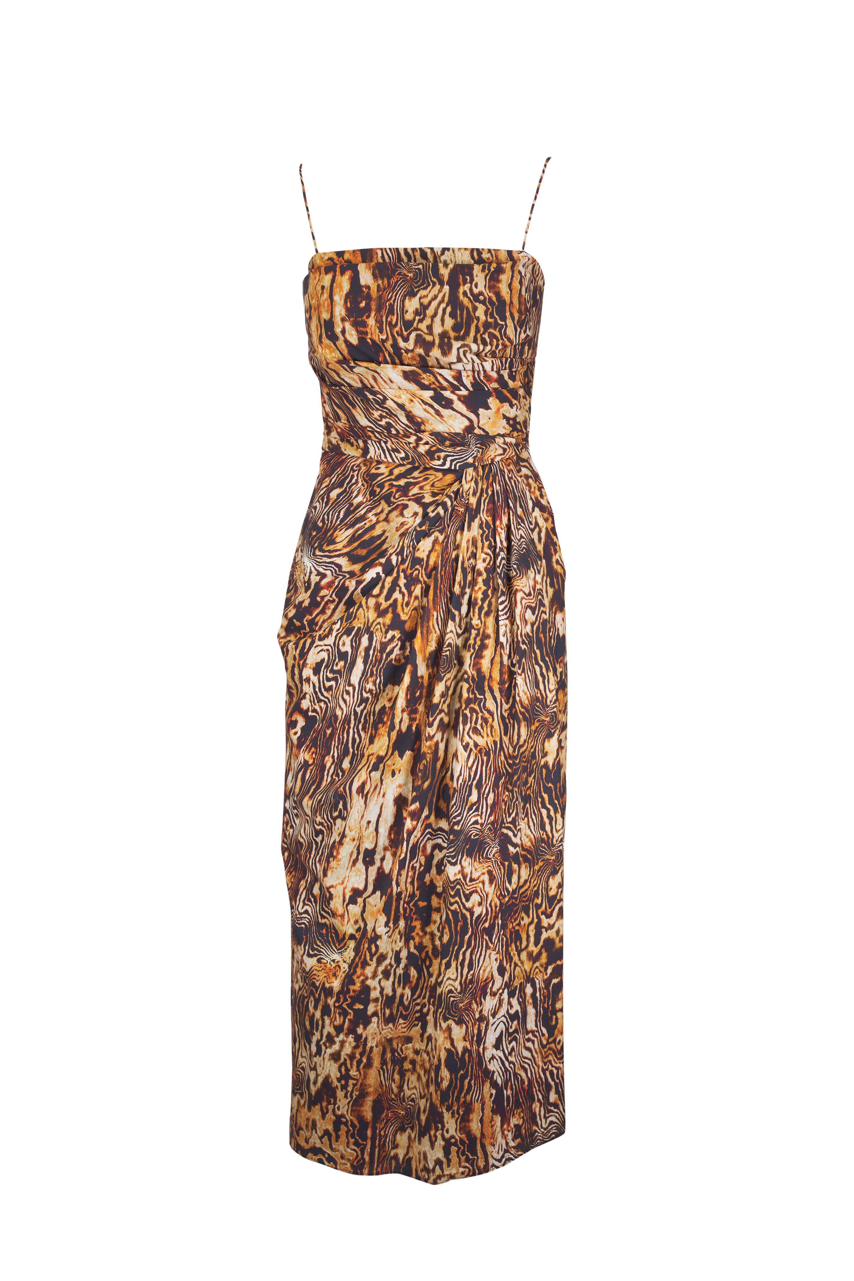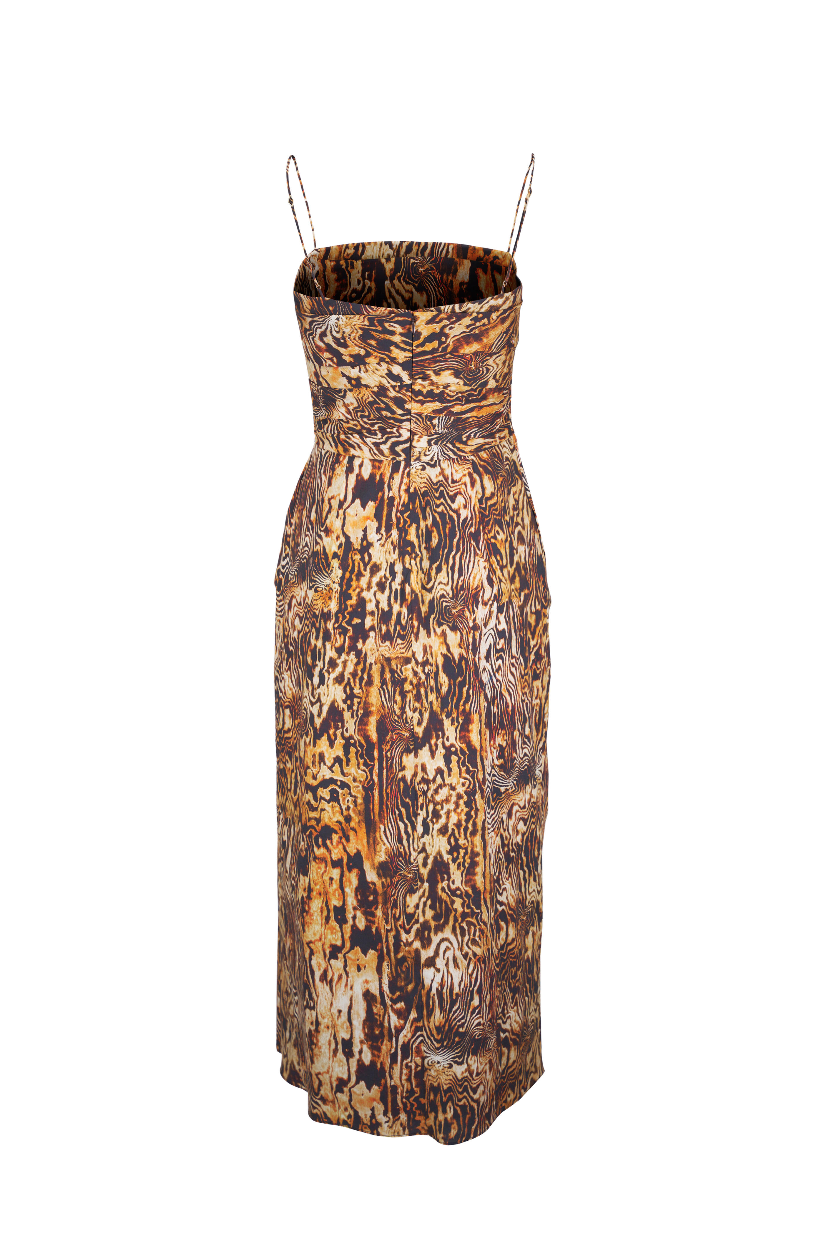 Square neckline. Concealed back zip. Adjustable spaghetti straps. Made in the USA. Midi length. 96% cotton, 4% elastane; lining: 100% silk. Dry clean.