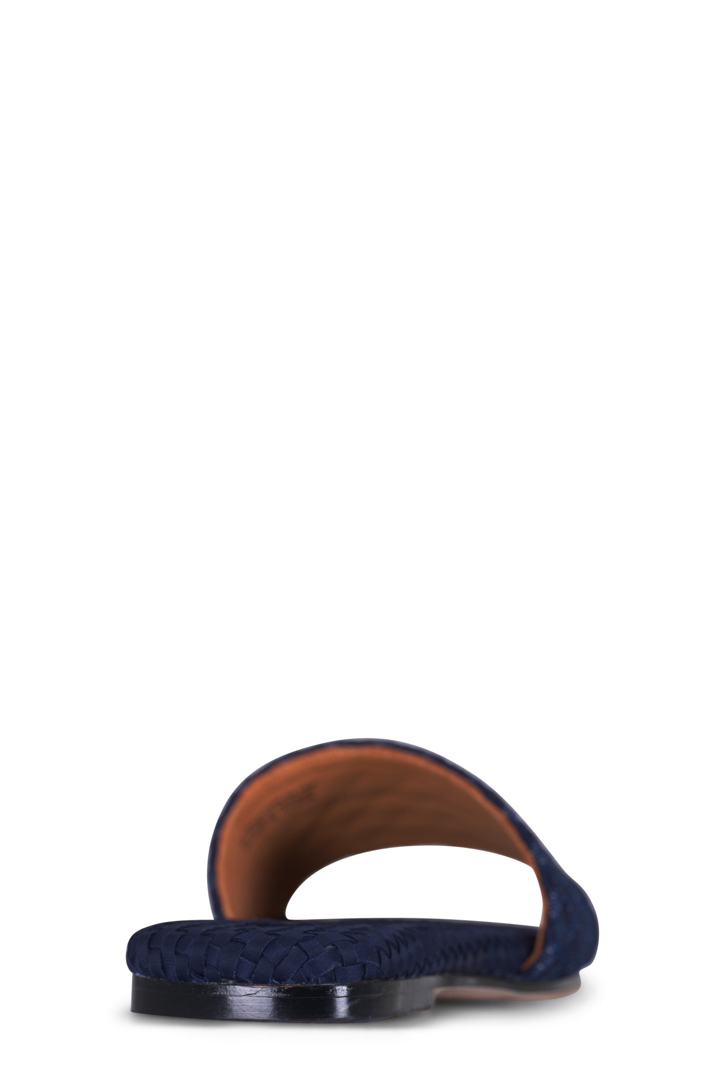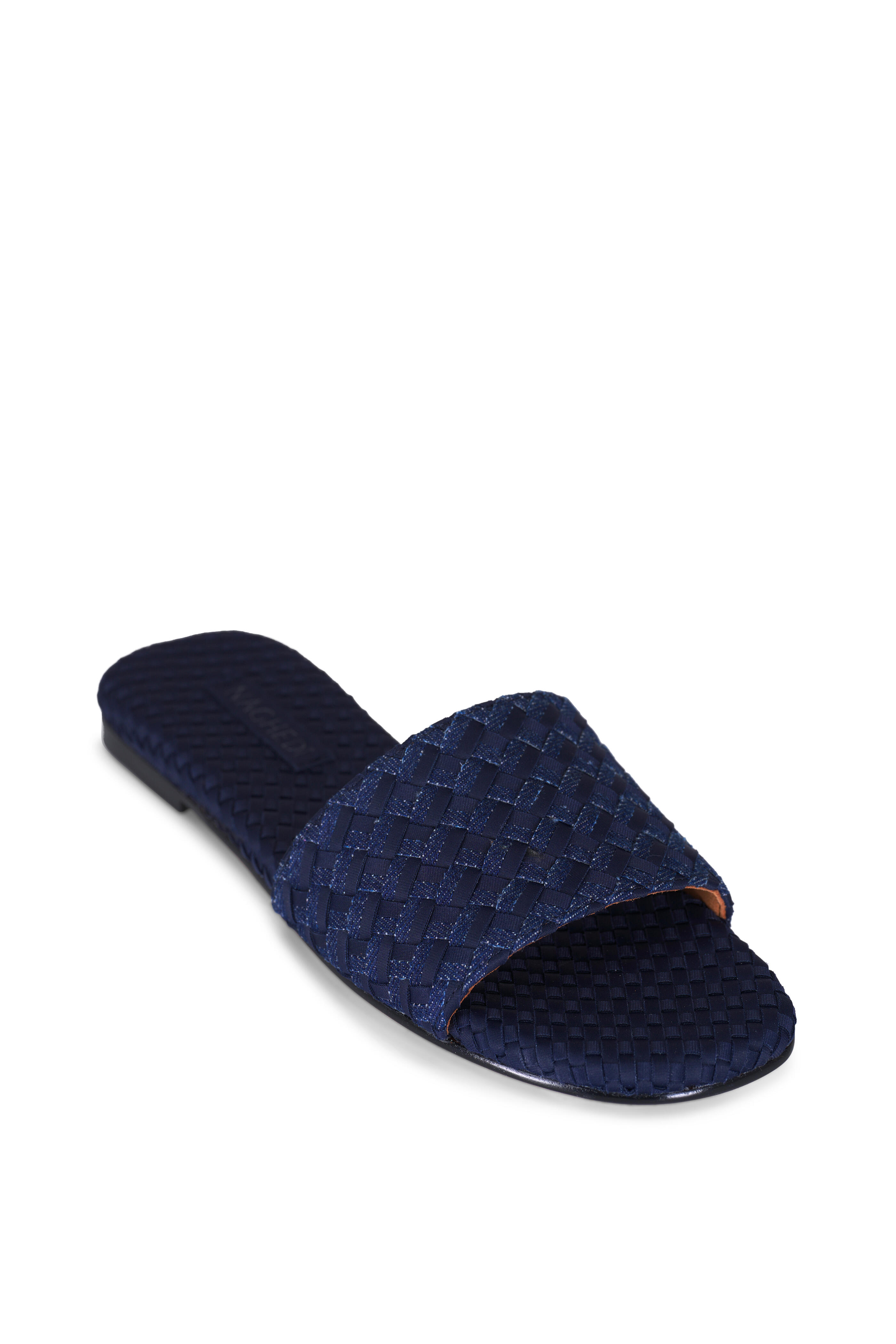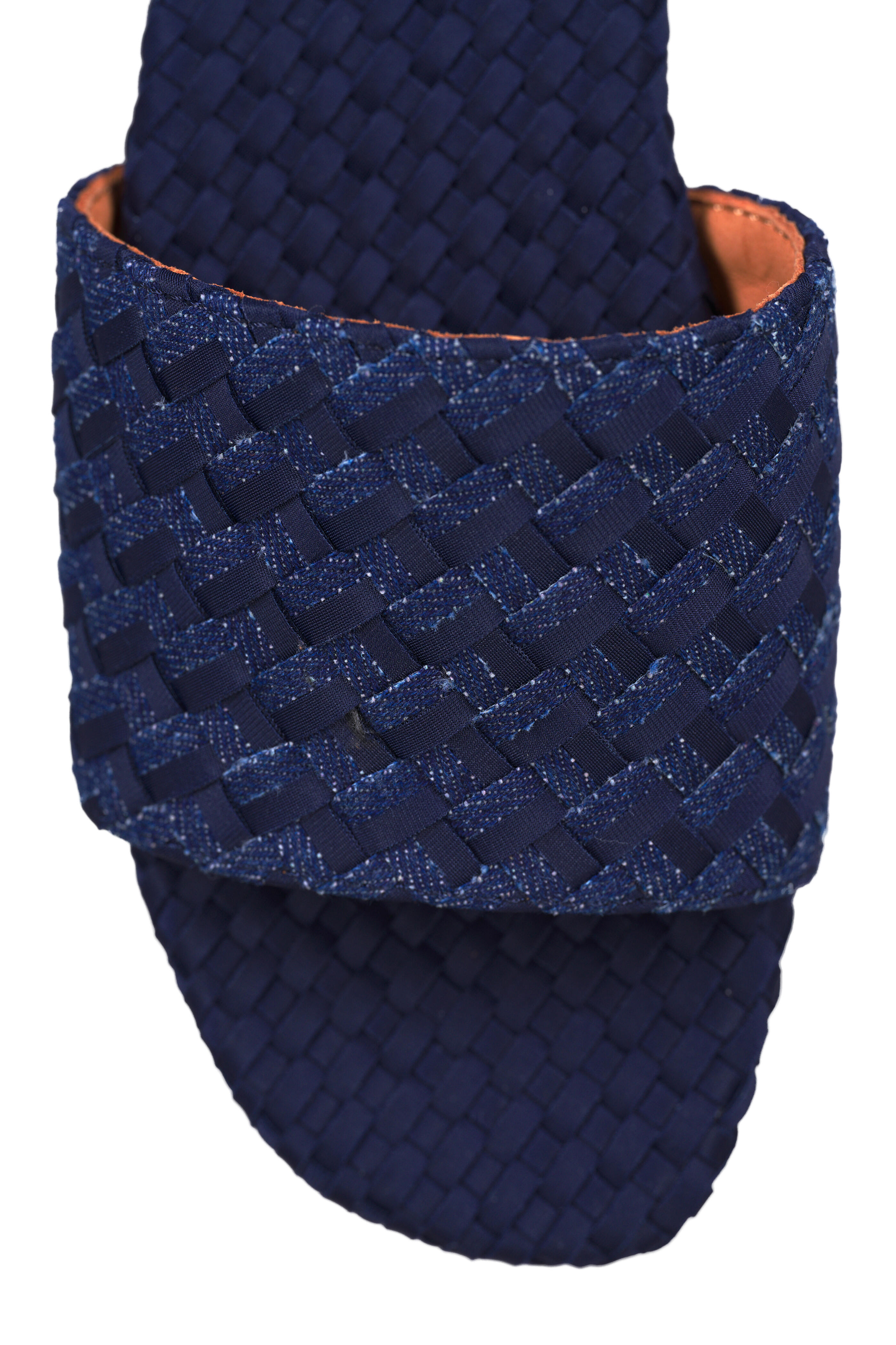 Handwoven denim and neoprene upper. Open toe. Slip on style. Denim and neoprene footbed. Leather sole. Imported.