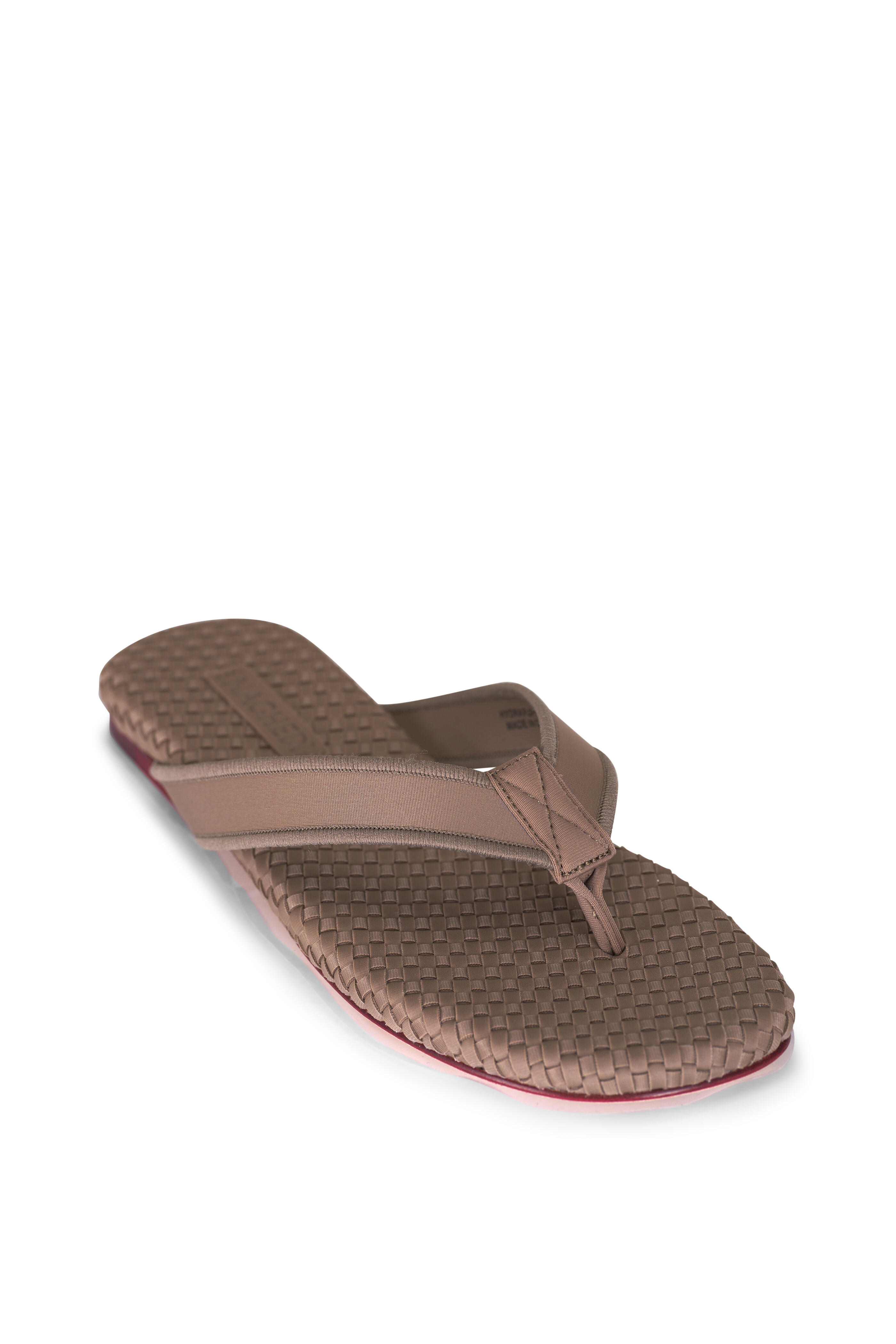 Handwoven neoprene. Open toe; thong strap. Slip on style. Handwoven neoprene insole. Natural buffed leather sole. Imported. True to size.