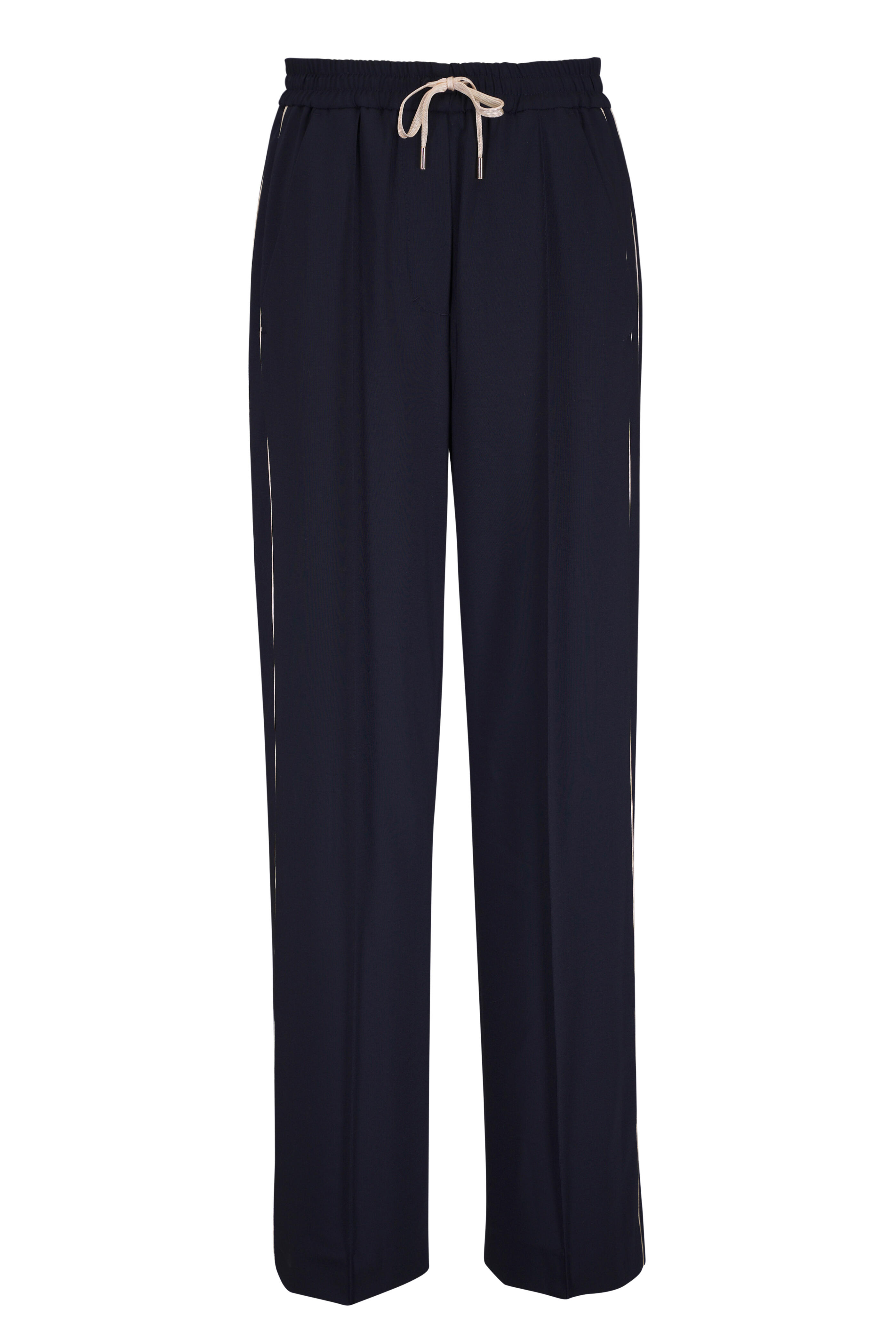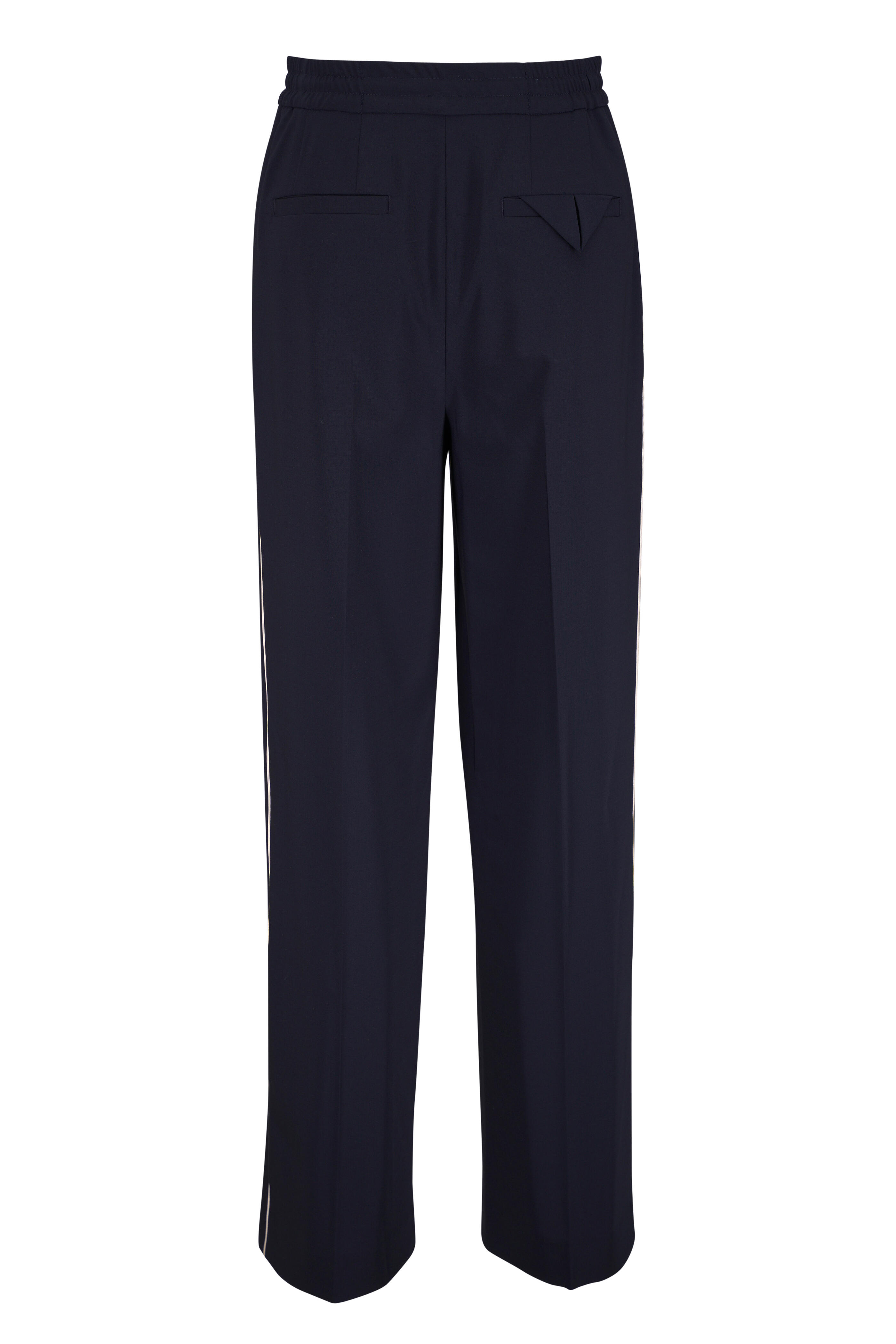 Elasticized waistband with drawstring. Pull-on style. Side slip pockets; back welt pockets. Imported. Inseam: 31". 96% virgin wool, 4% elastane. Dry clean.