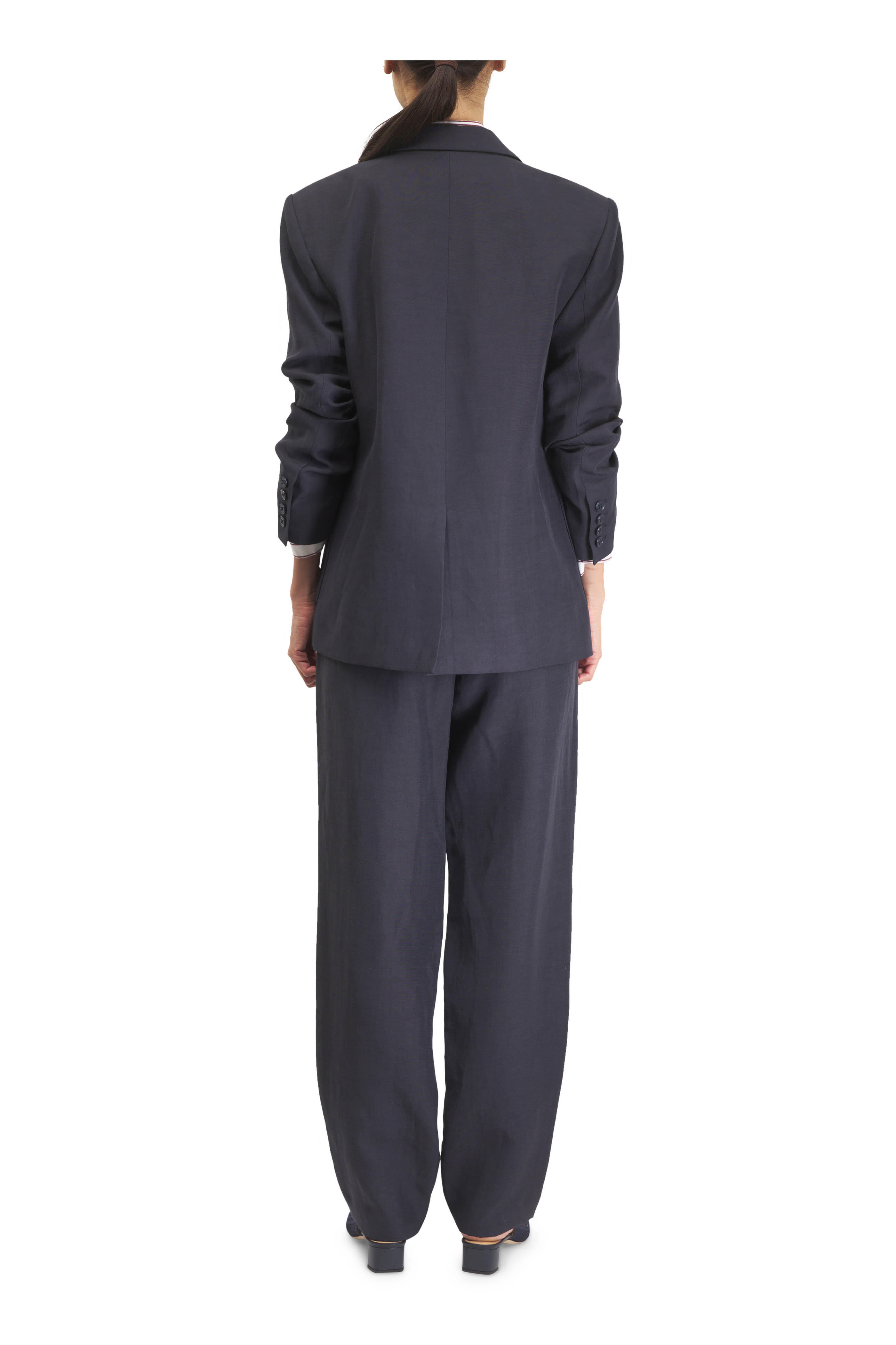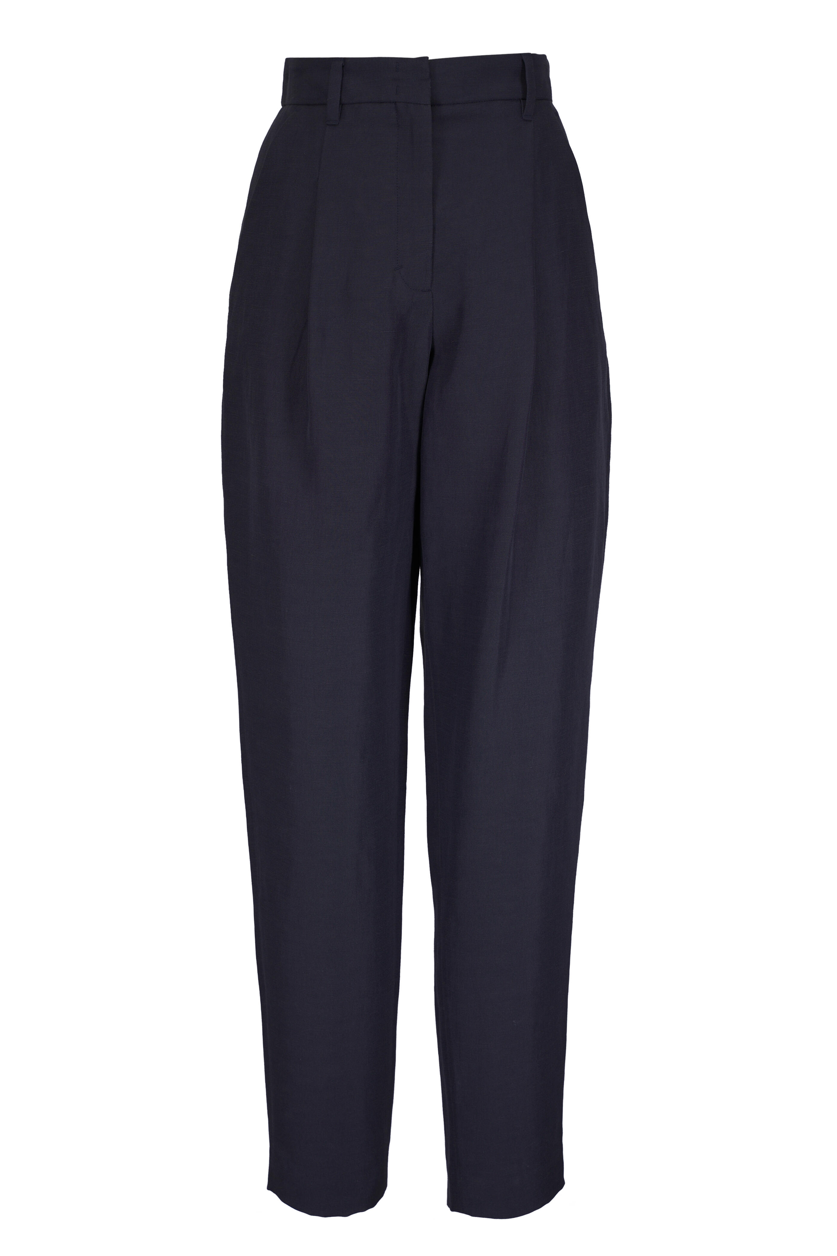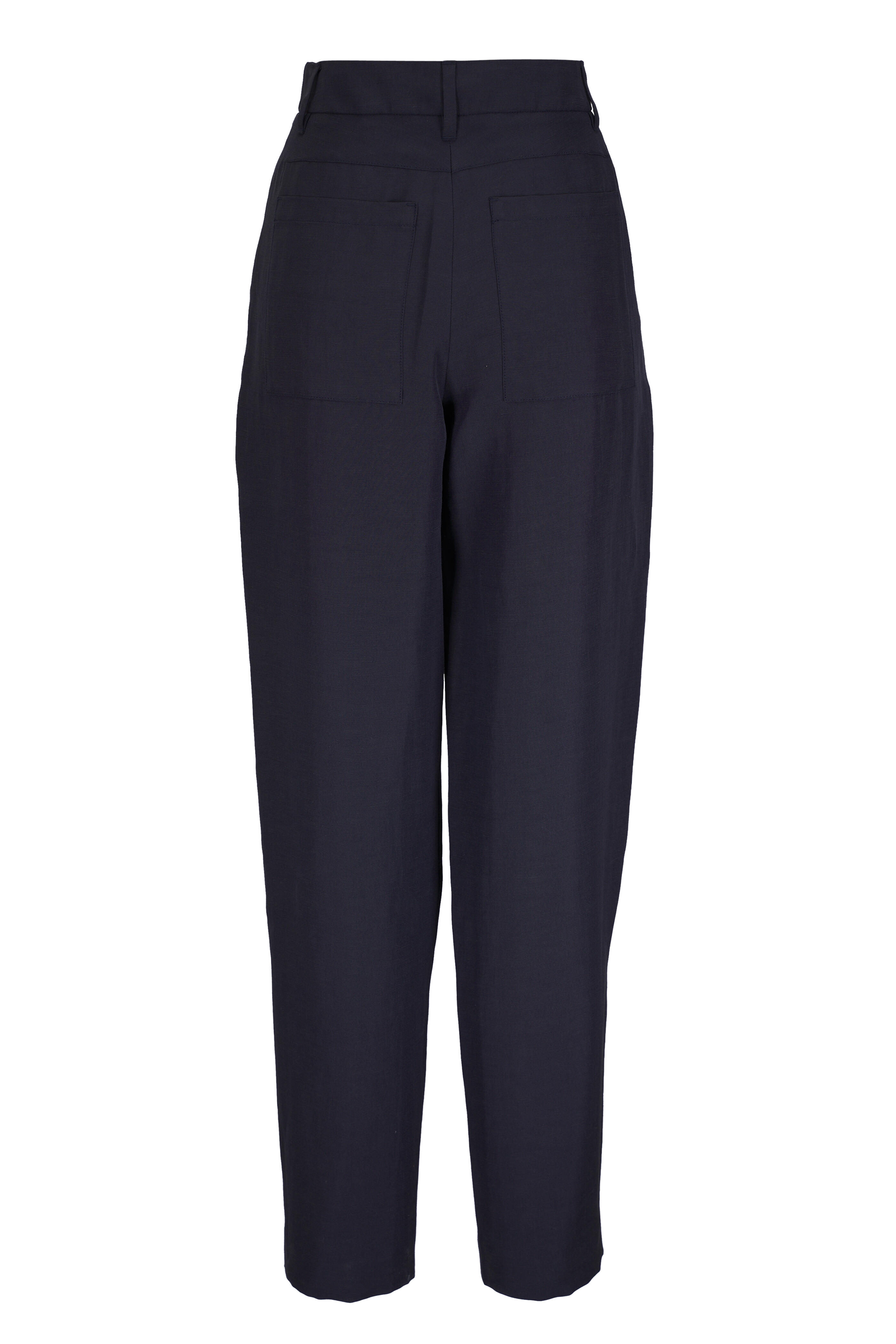 Extended tab closure. Banded waist. Pleated front. Diagonal side pockets. Welted pocket with button closure. Unfinished hem. Imported. Wide leg. 59% polyester, 41% linen. Dry clean.