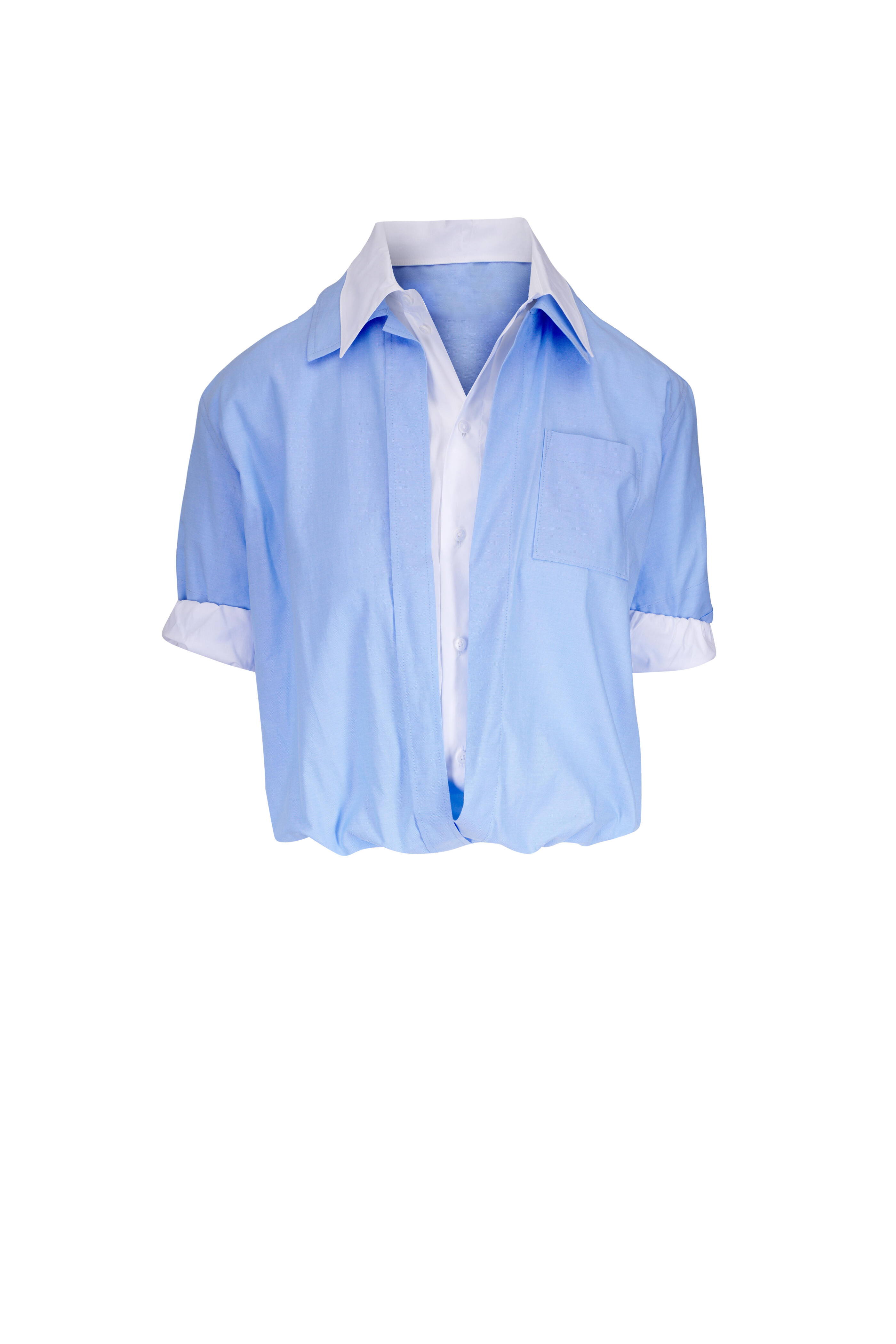 Hidden placket. Top layer with chest pocket and without buttons. Turn up cuffs. Elastic hem. Imported. 100% Cotton. Dry clean.