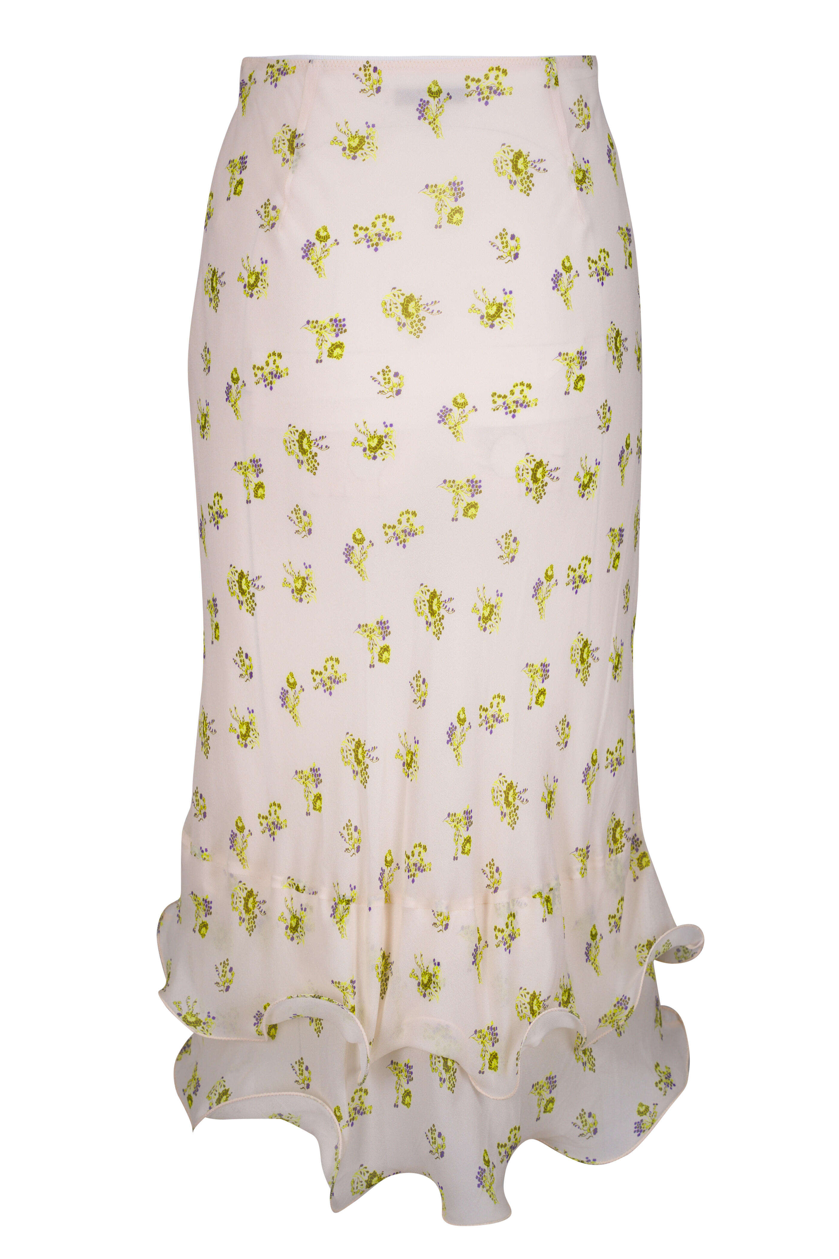 Bias cut. Elastic waist with in-seam side zip closure. Expressive ruffles at the hem. Midi Length. 100% Viscose. Dry clean.