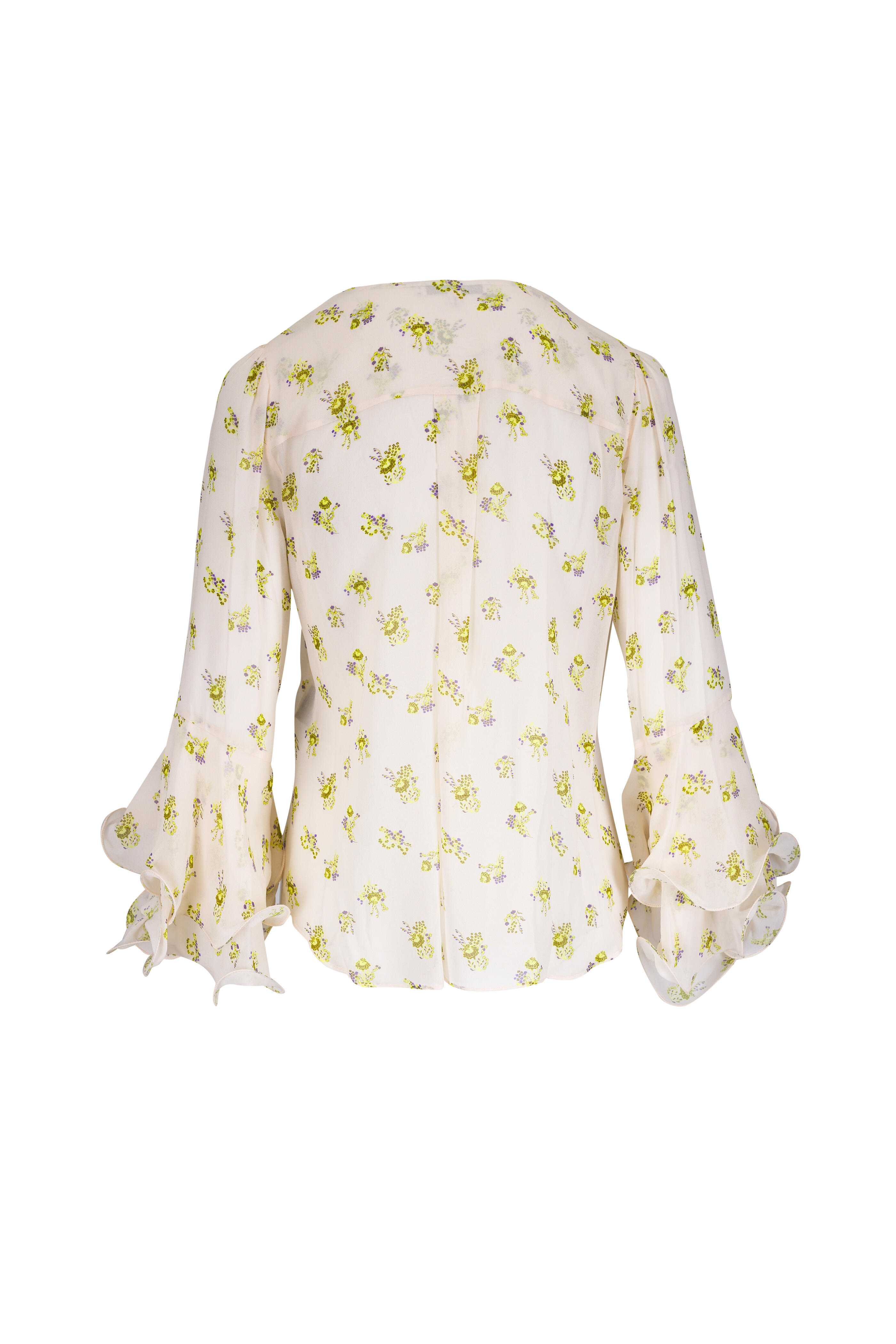 V-neckline with ruffle trim. Ruffle cuffs. Imported. Slim silhouette. 100 % Viscose. Dry clean.