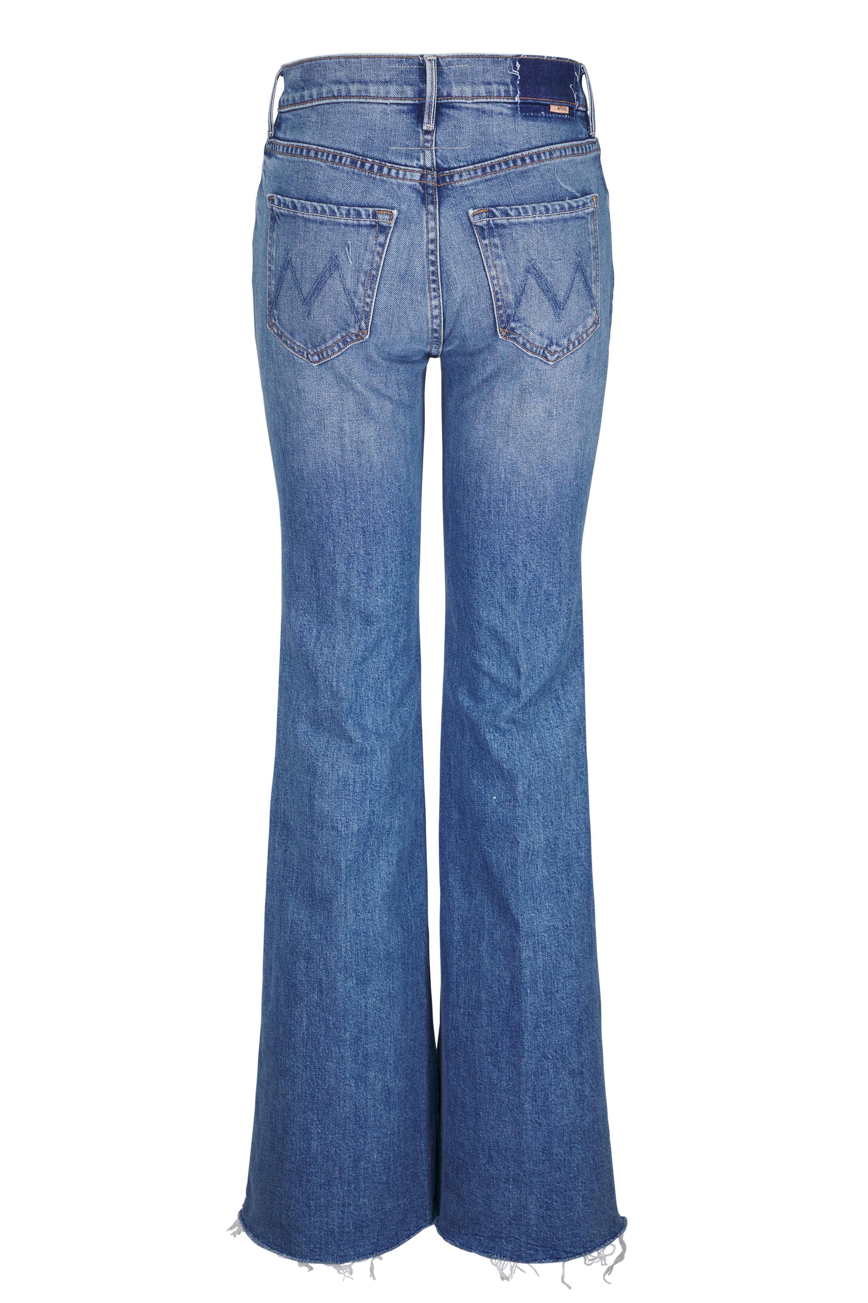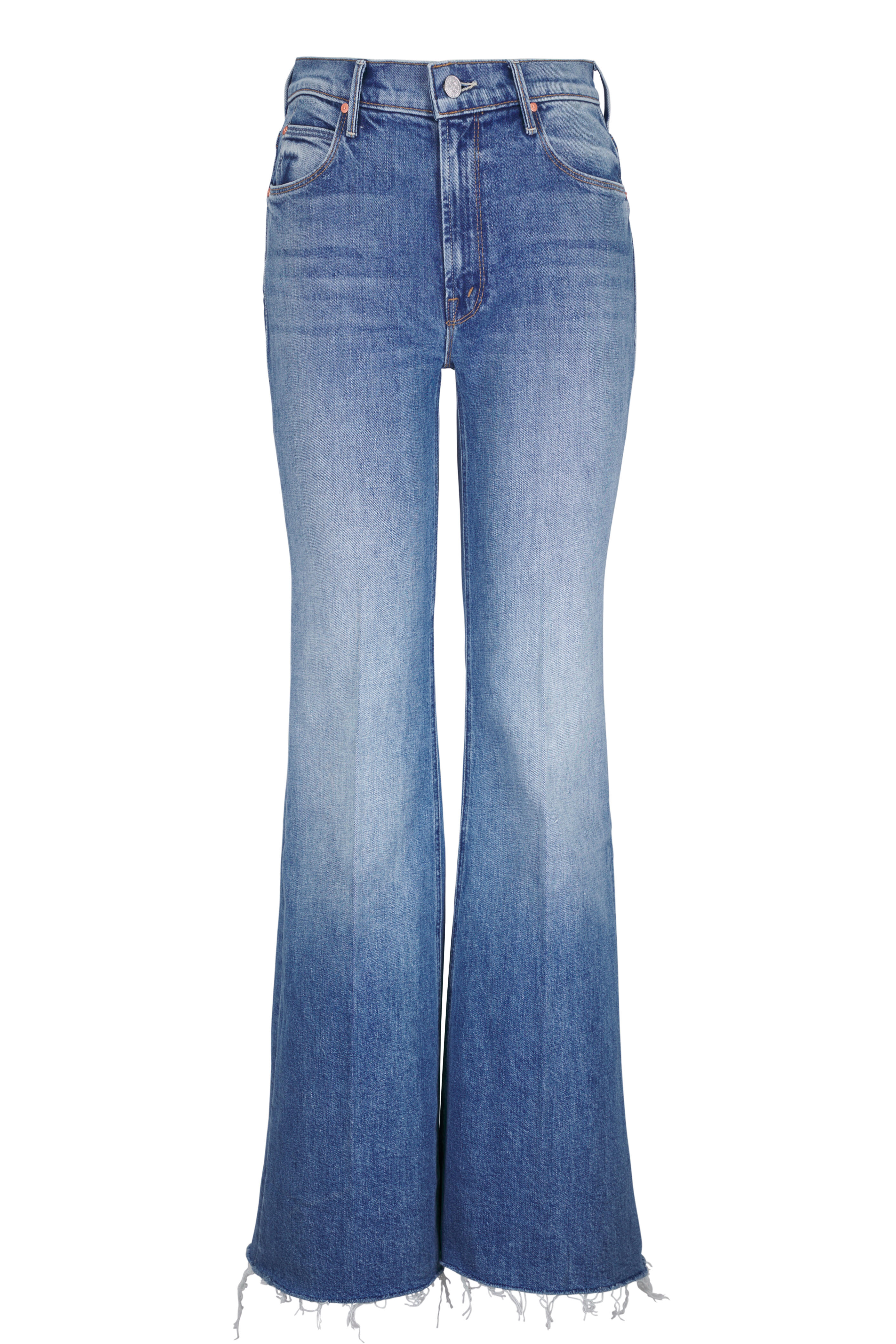 Zip fly. Banded waist; belt loops. Five-pocket styling. Frayed hem. Made in the USA. Color: Heads or Tails. 10" Rise. 34" Inseam. 25" Leg Opening. 98% cotton, 2% elastane. Machine wash.