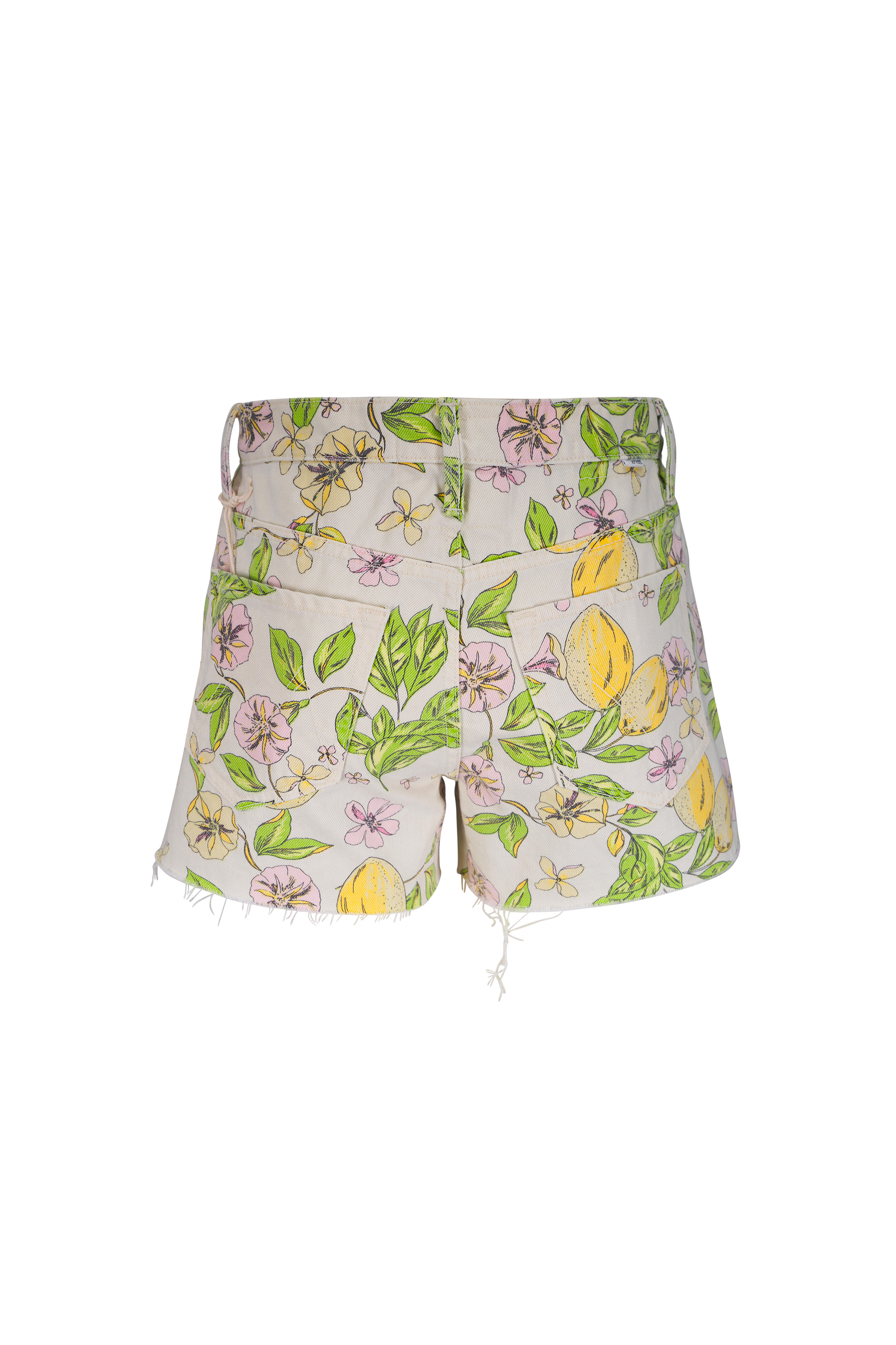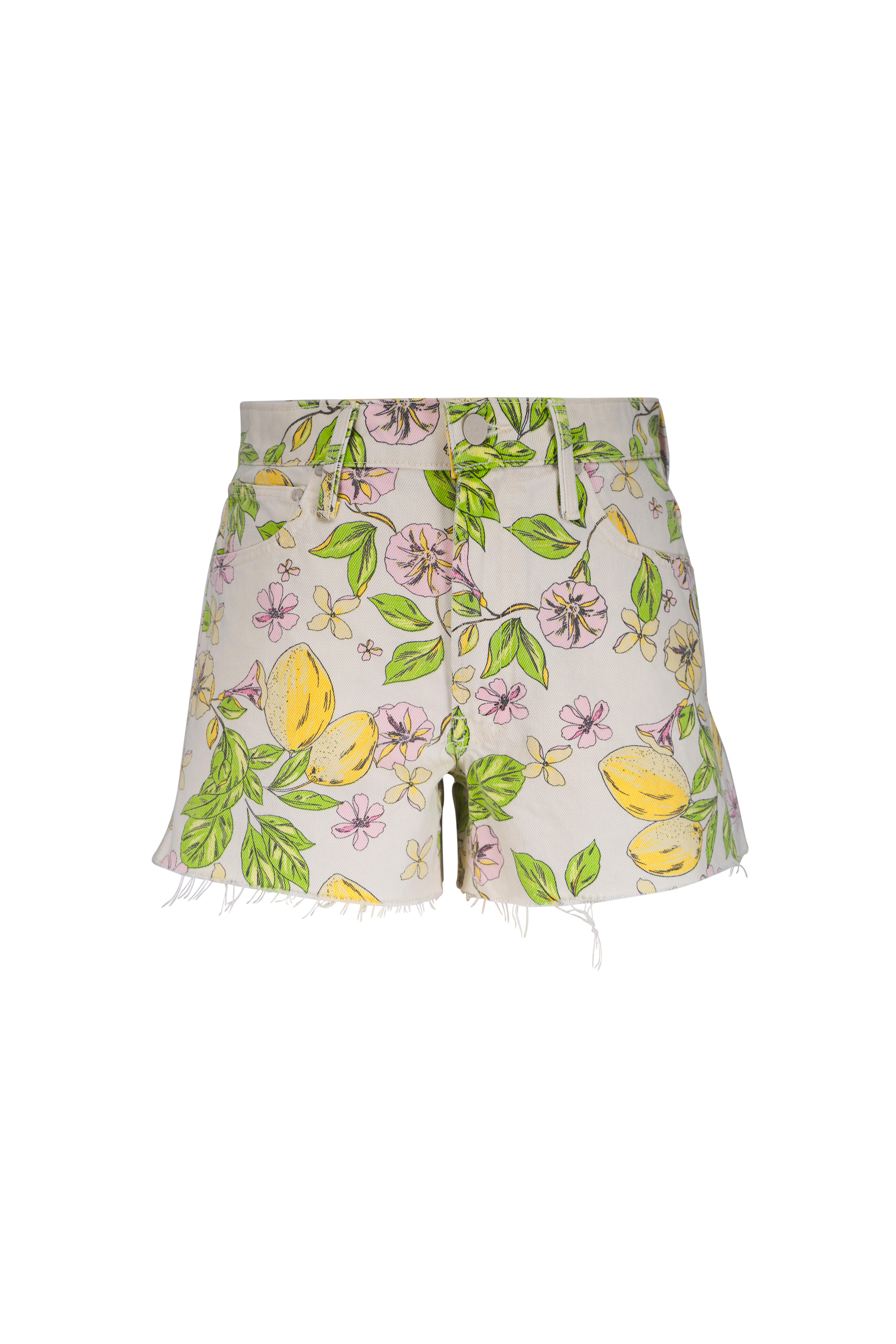 Button; Zip fly. Belt loops. Frayed hem. Made in USA. Color: Lemonade Stand. 10 3/4" Rise. 3 1/2" Inseam. 26" Leg Opening. 100% Cotton. Machine wash.