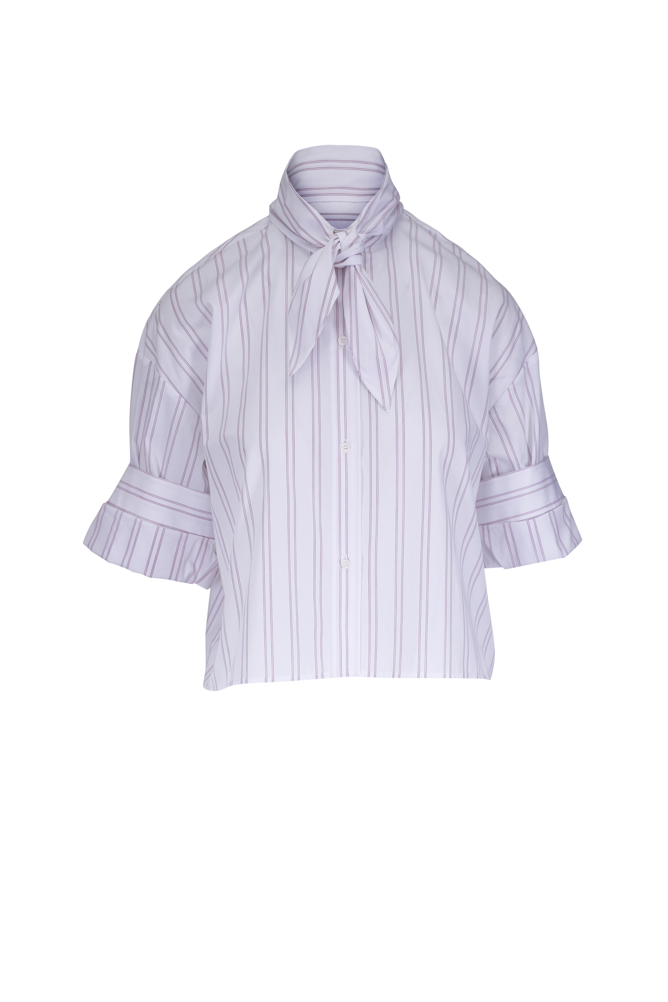 Spread collar. Neck tie at the collar. Front button placket. Chest patch pocket. Three-quarter sleeves; convertible cuffs. Cropped hem. Made in the USA. 100% cotton. Dry clean.