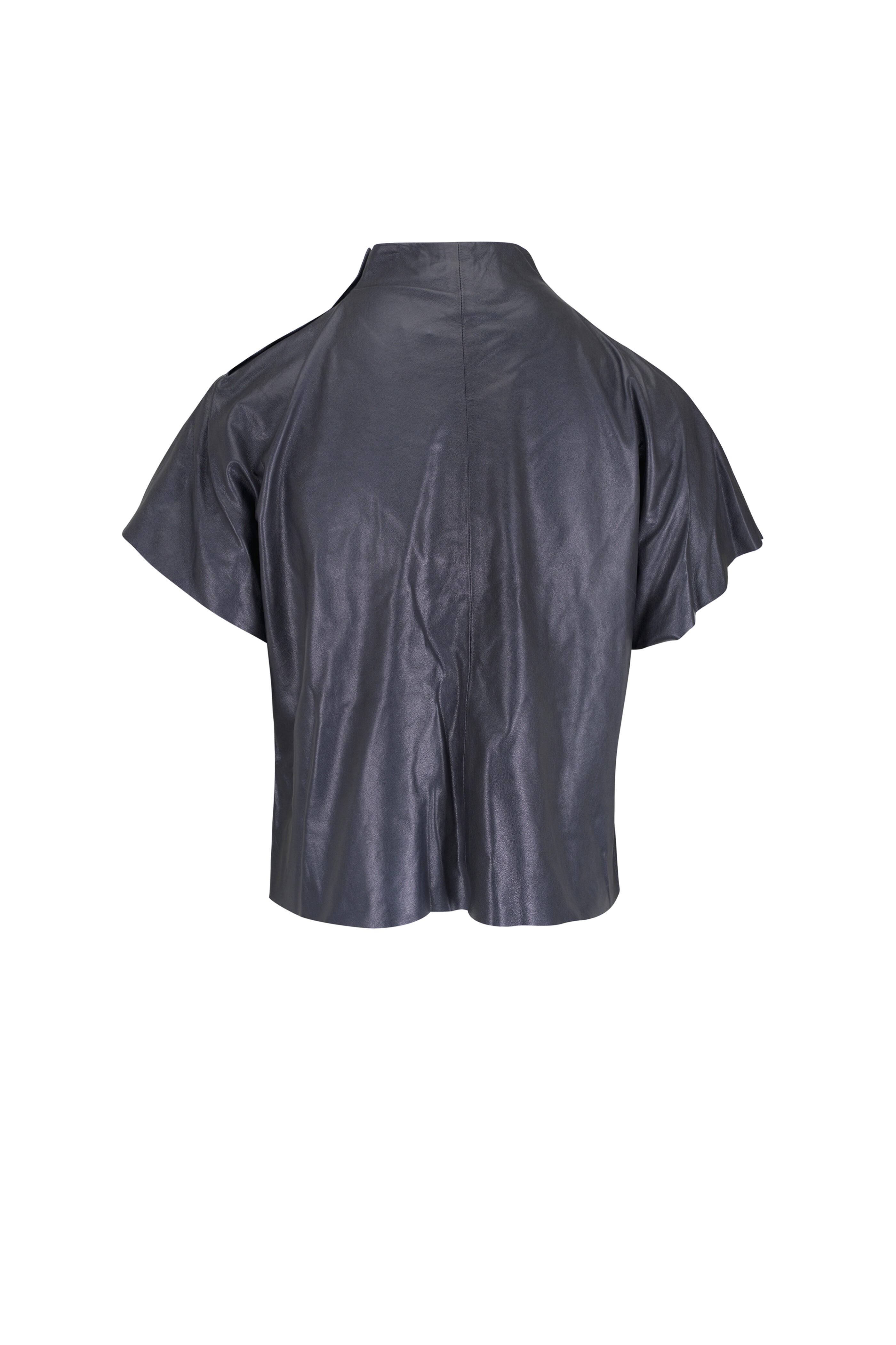 Leather. Specialist clean. Mock neckline. Short sleeves. Imported.