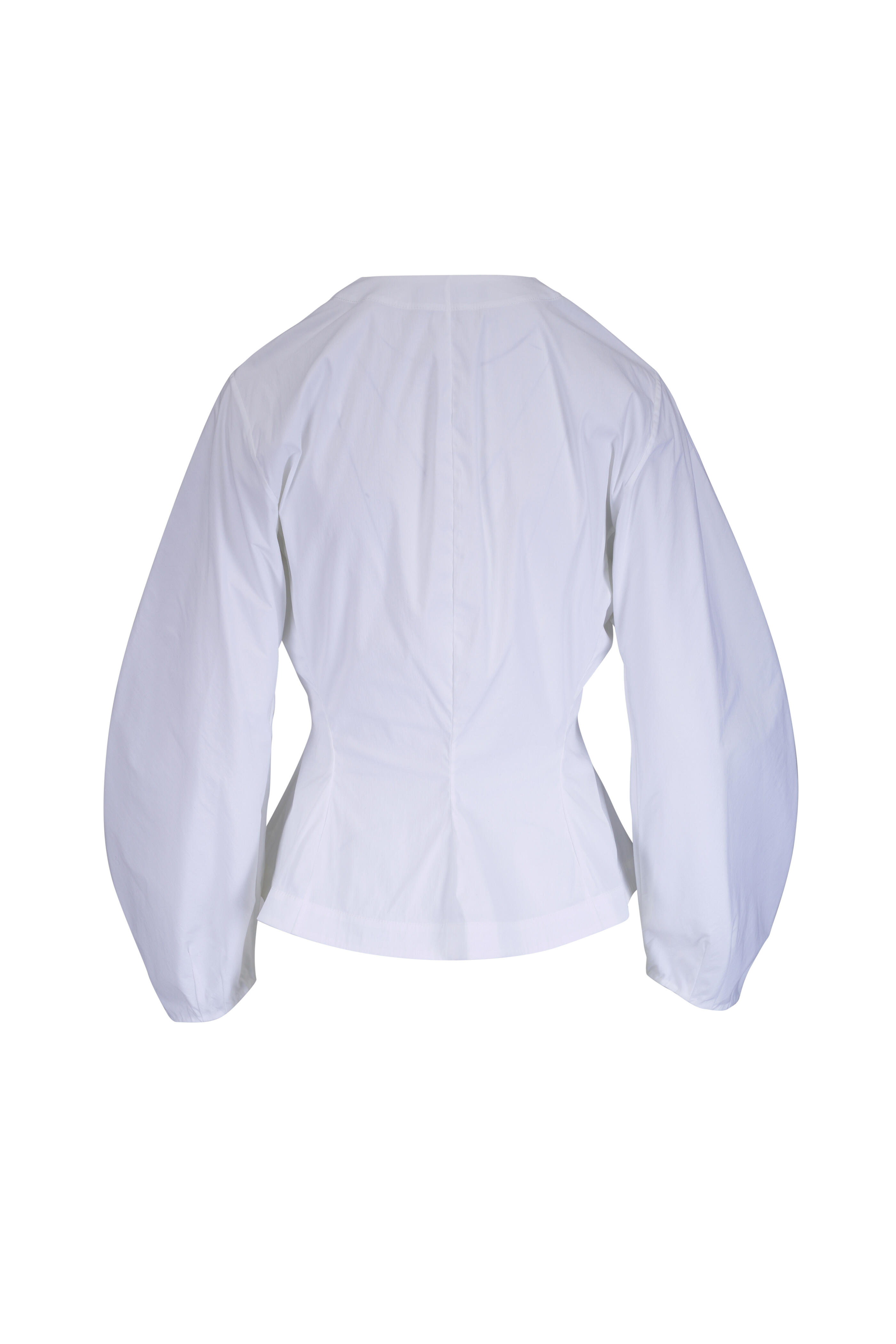 V-neckline. Four button placket. Barrel sleeves. Drop shoulders. Made in USA. 78% cotton, 18% polyester, 4% elastane. Dry clean.