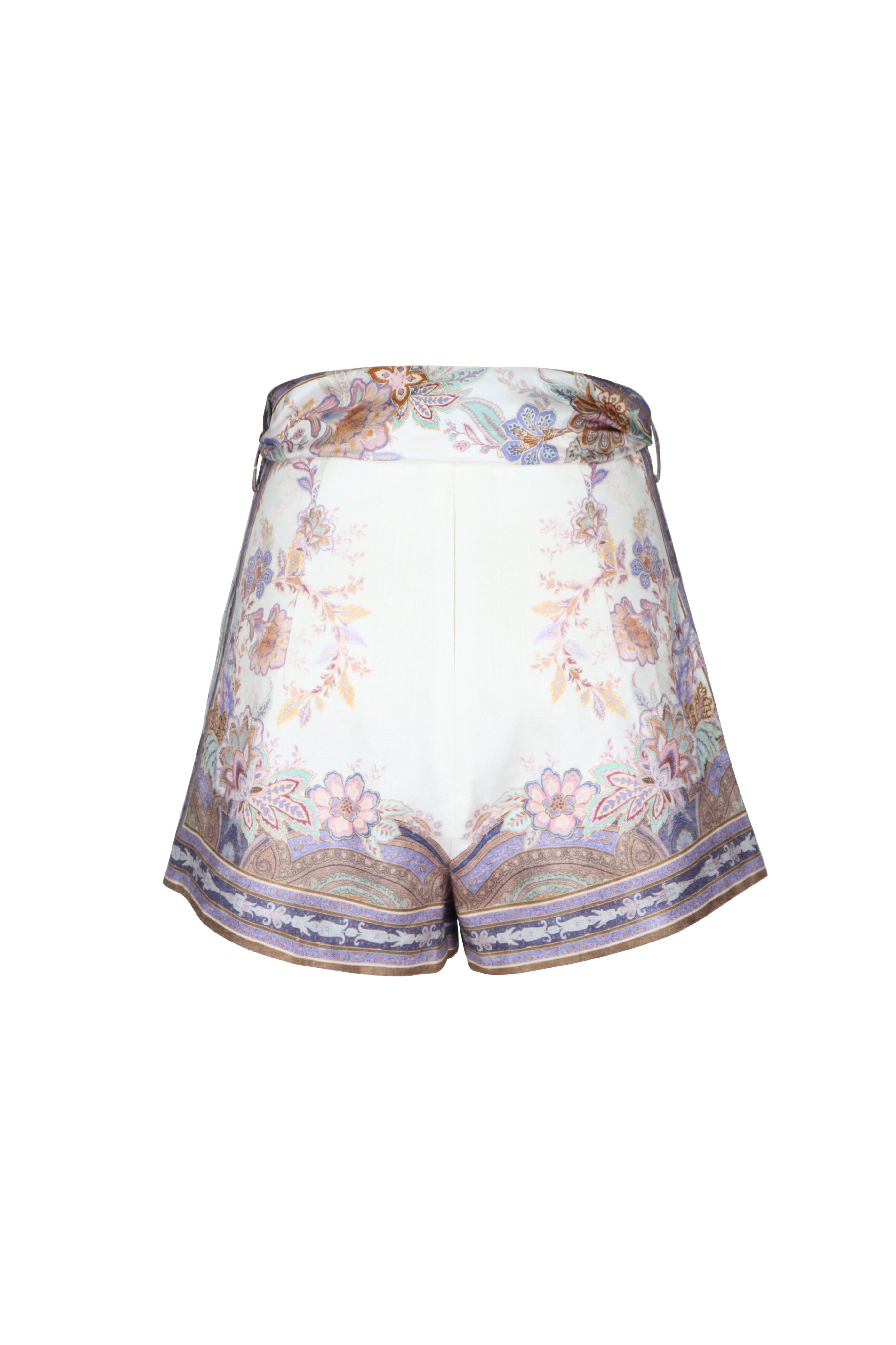 Concealed back zip. Removable self-tie belt. Side slip pockets. Imported. 1.5" inseam. 100% linen; lining: 100% cotton; belt: 100% silk. Dry clean.