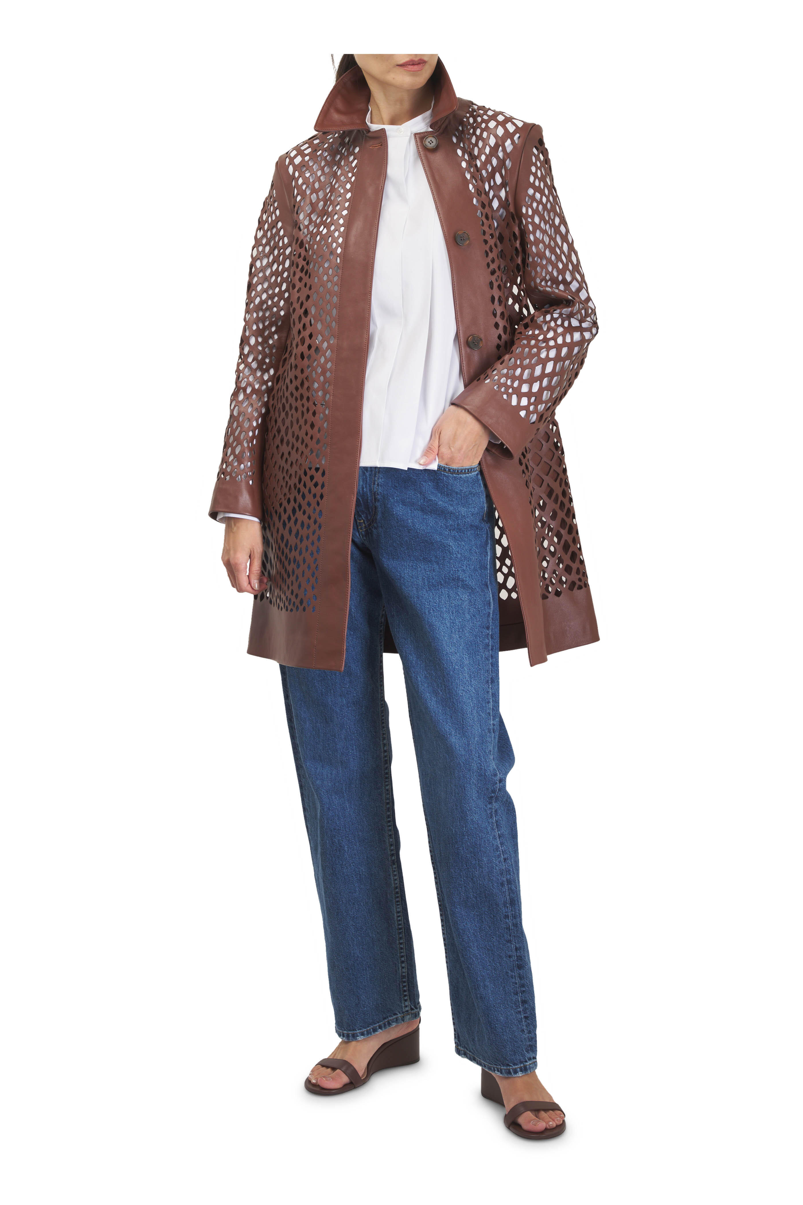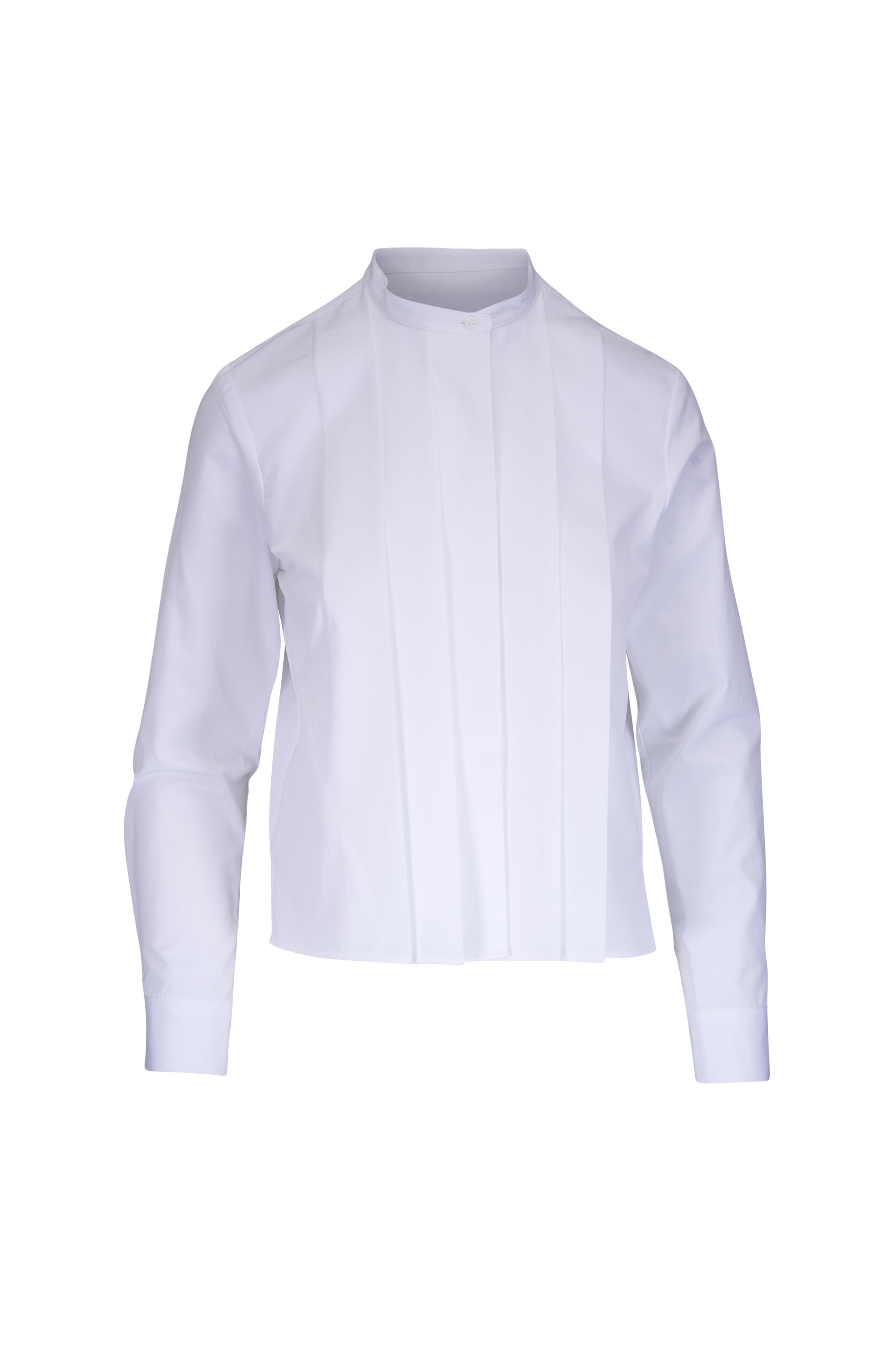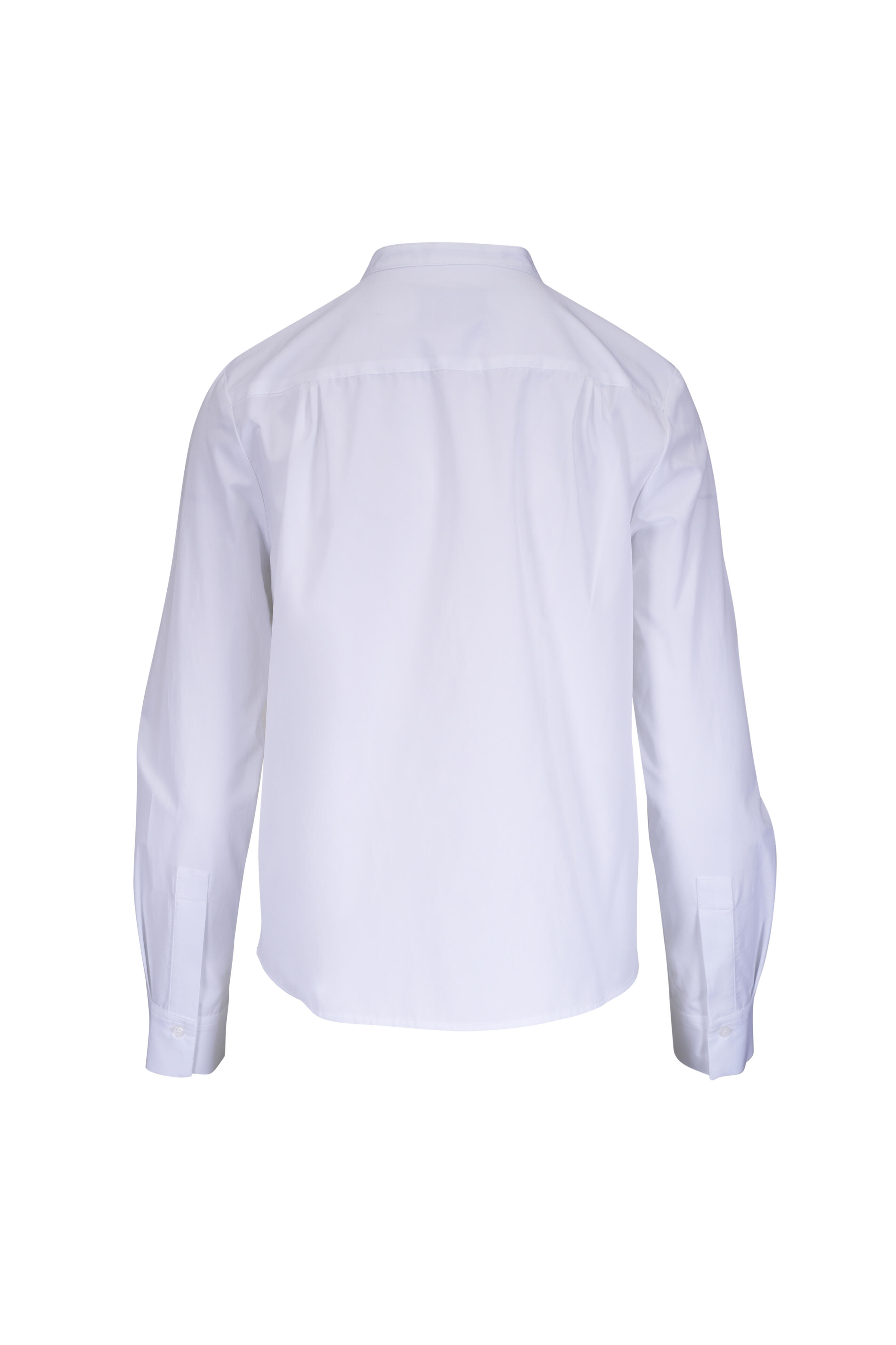 Mandarin collar. Concealed front button placket. Single button square cuffs. Made in USA. 22" shoulder to hem (size XS). 100% cotton. Dry clean.