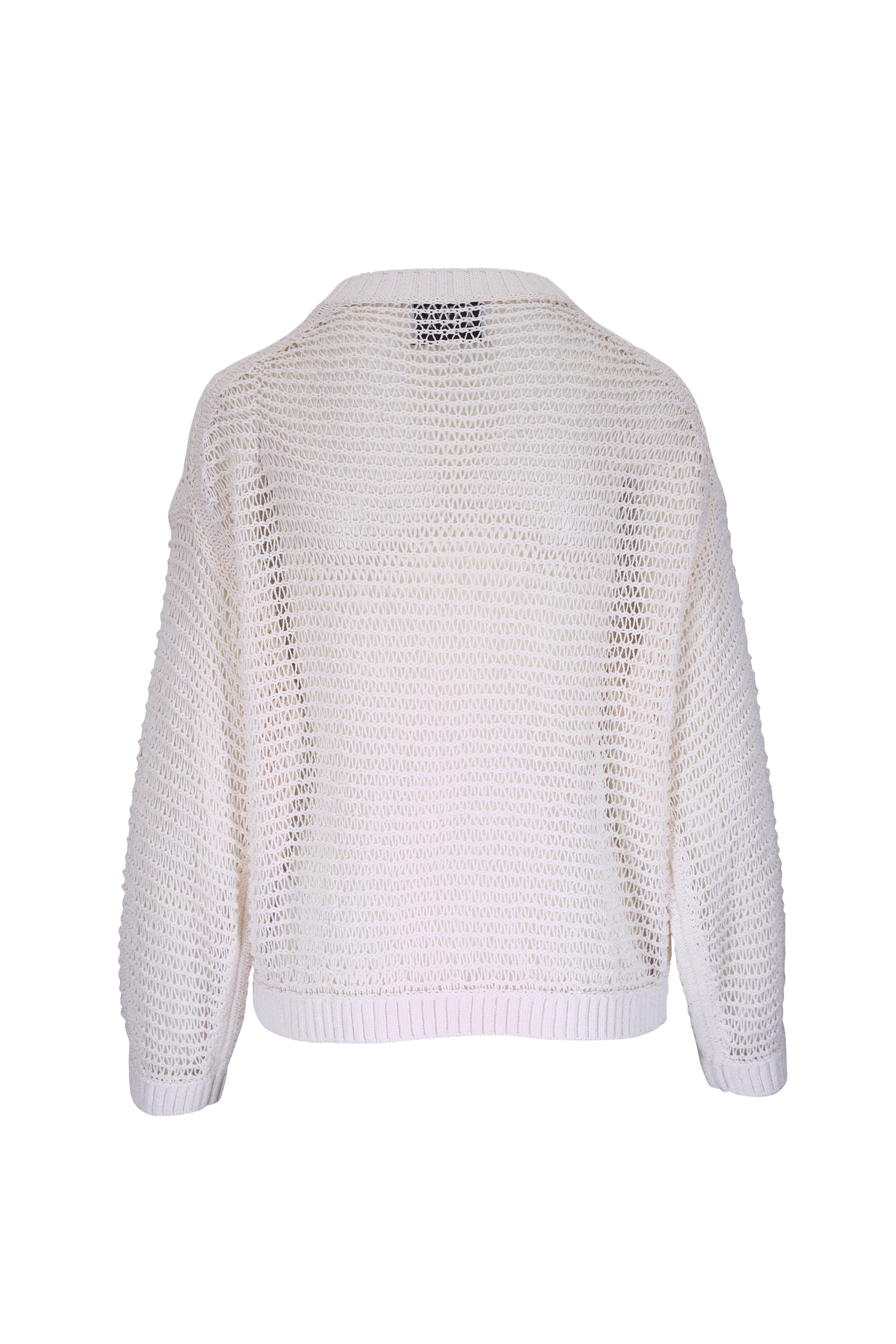 Crew neckline. Open knit. Ribbed trims. Imported. 24" length (size XS). 42% silk, 38% viscose, 20% polyamide. Dry clean.