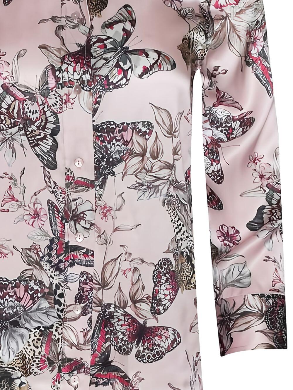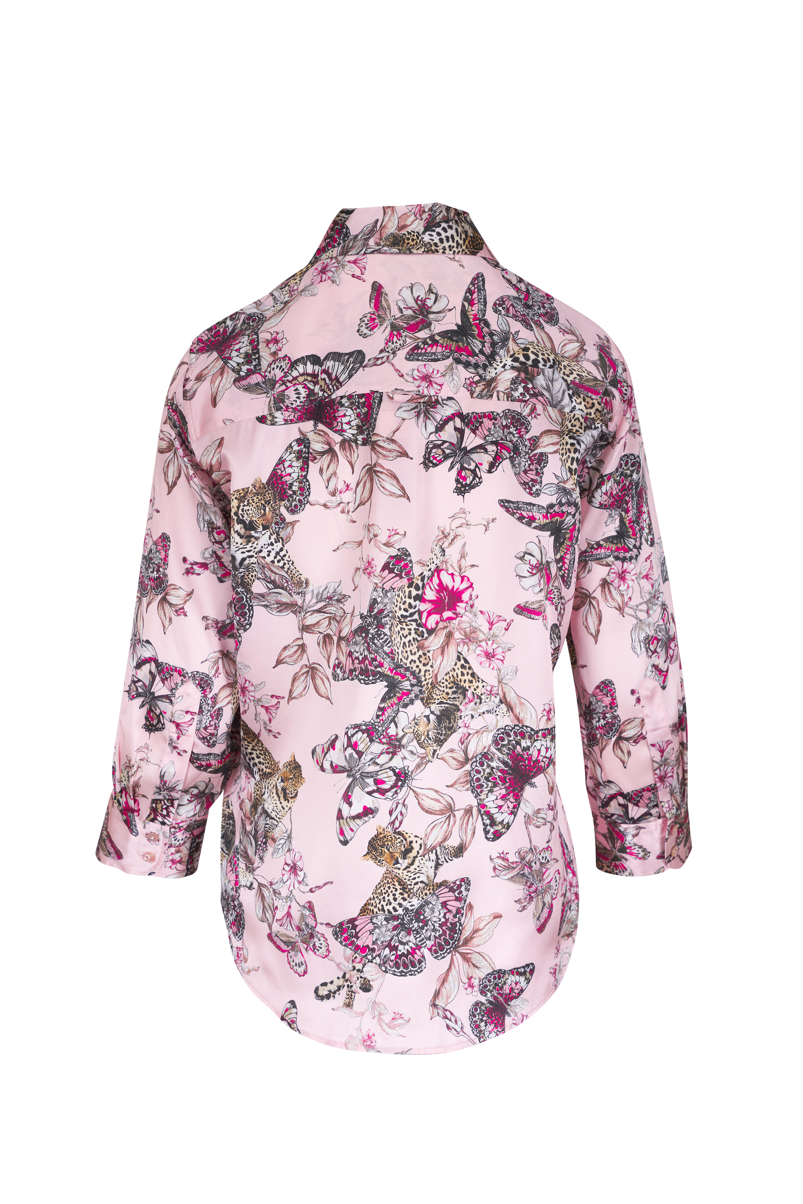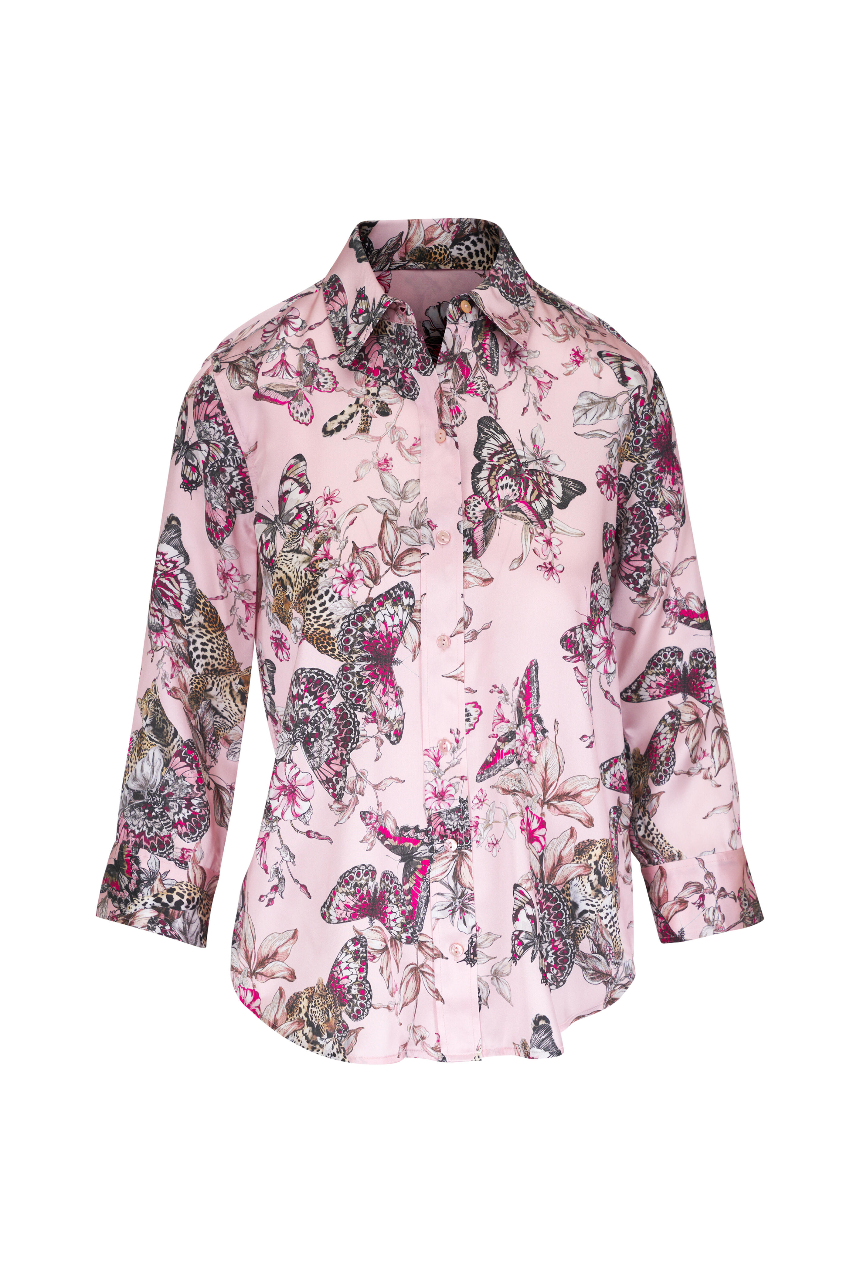 Spread collar. Front button placket. Double button barrel cuffs. Straight hem. Made in USA. 100% Silk. Dry clean.
