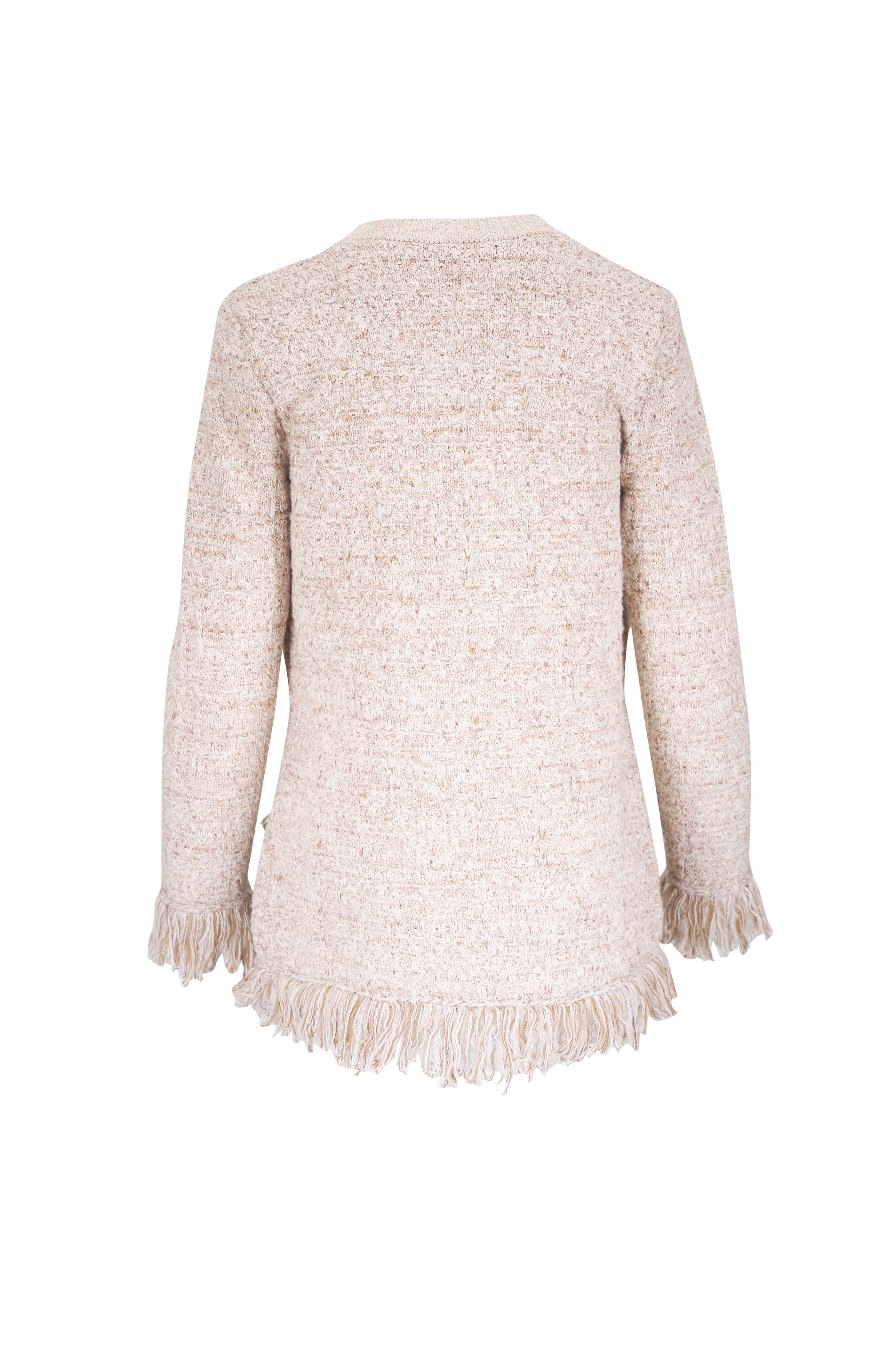 Crew neckline. Front button placket. Lower welt pockets. Fringe trim. Imported. About 25.2" shoulder to hem. 92% cotton 4% polyester 2% acrylic 1% nylon 1% wool. Dry clean.
