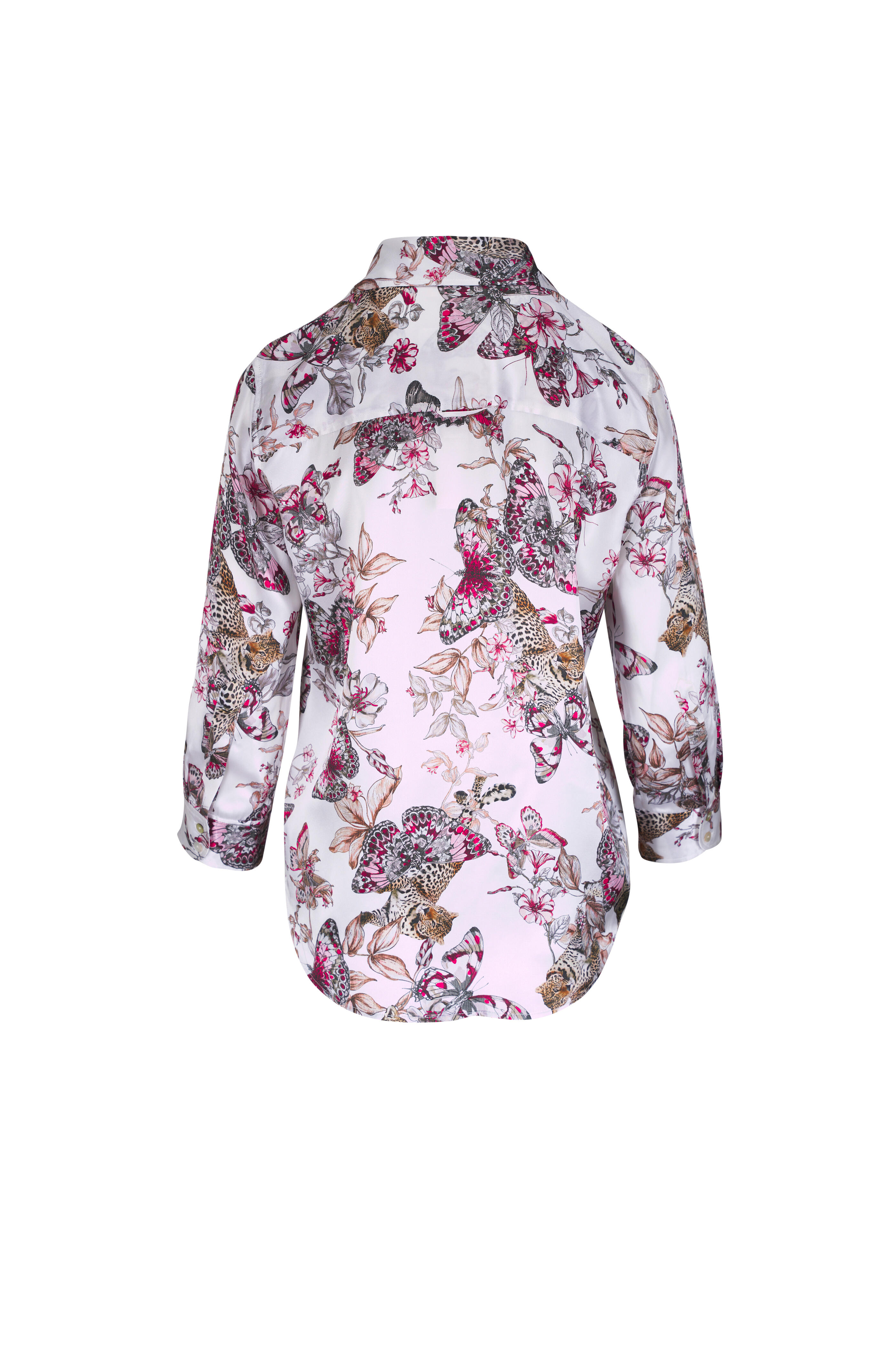 Spread collar. Front button placket. Double button barrel cuffs. Straight hem. Made in USA. Approximately 25" shoulder to hem (measurements taken from size S). 100% silk. Dry clean.