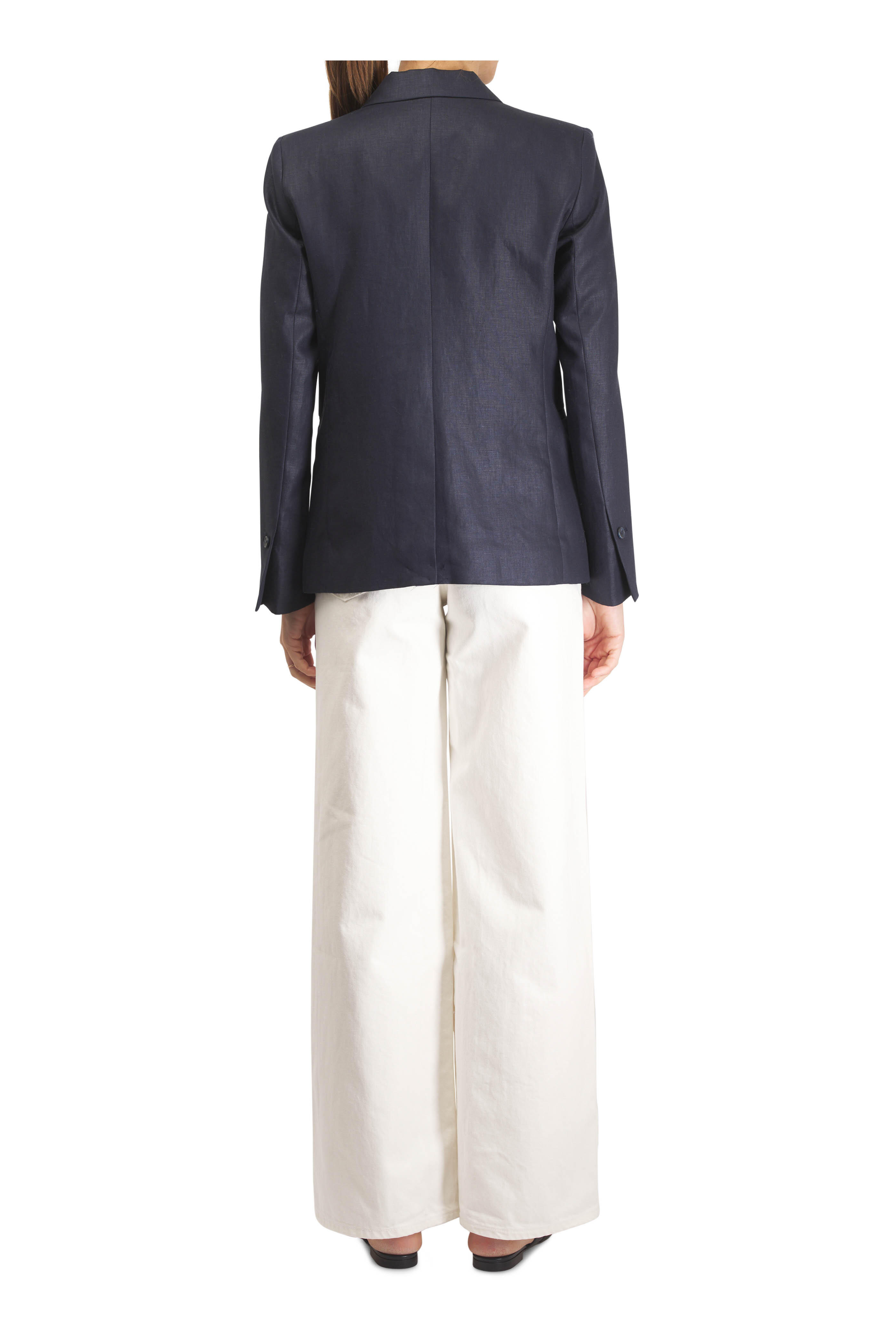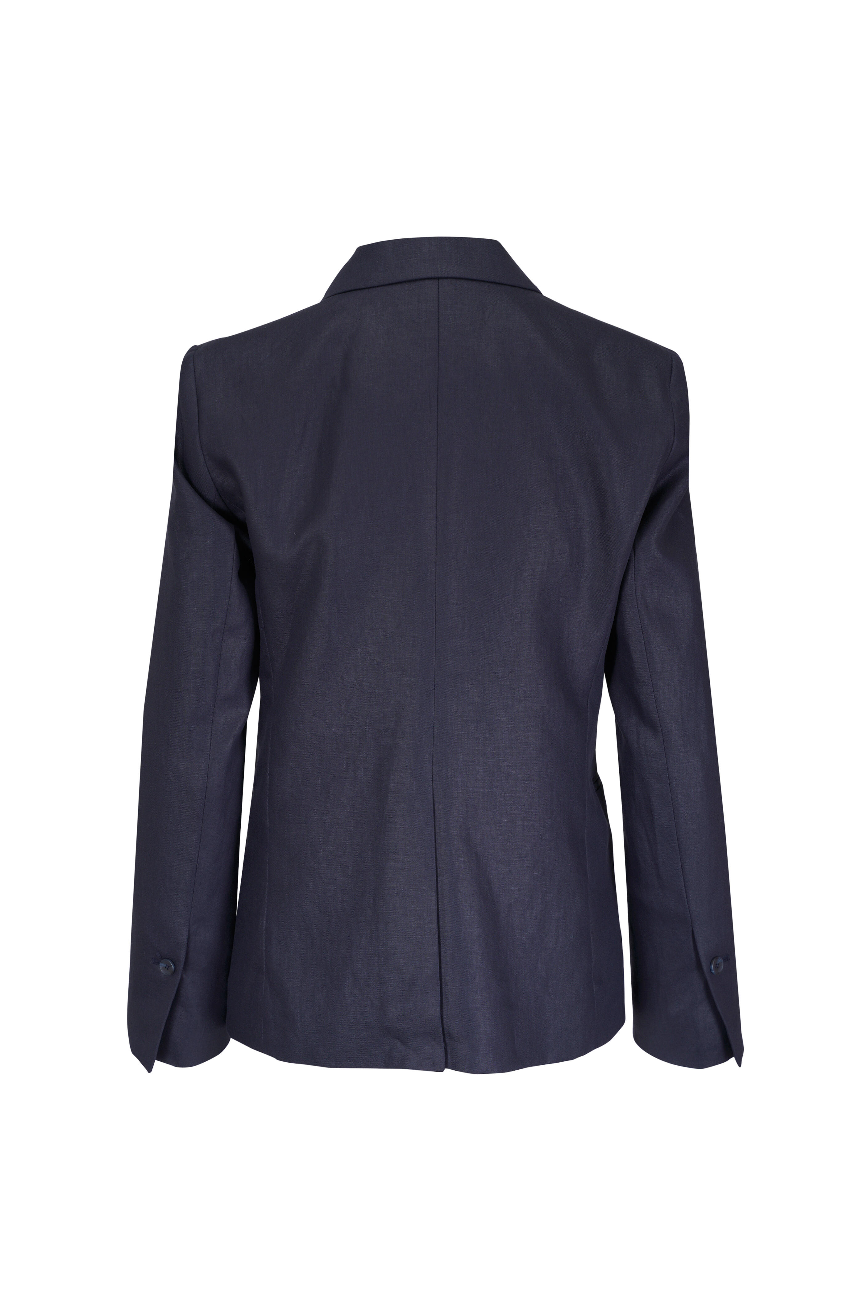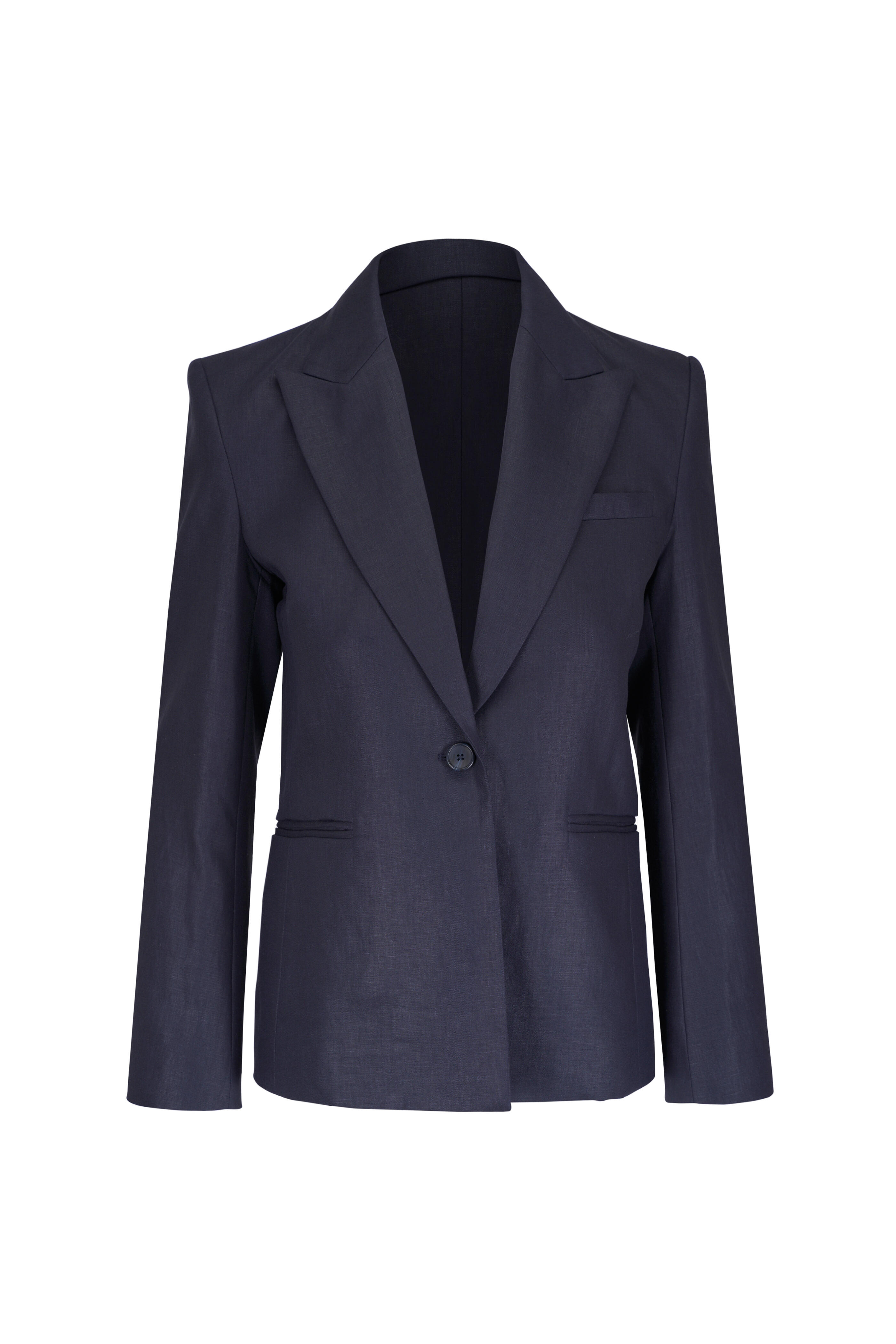 Peak lapels. Shoulder pads. One button closure. Chest & lower welt pockets. Back vent. Made in USA. 100% linen; lined. Dry clean.