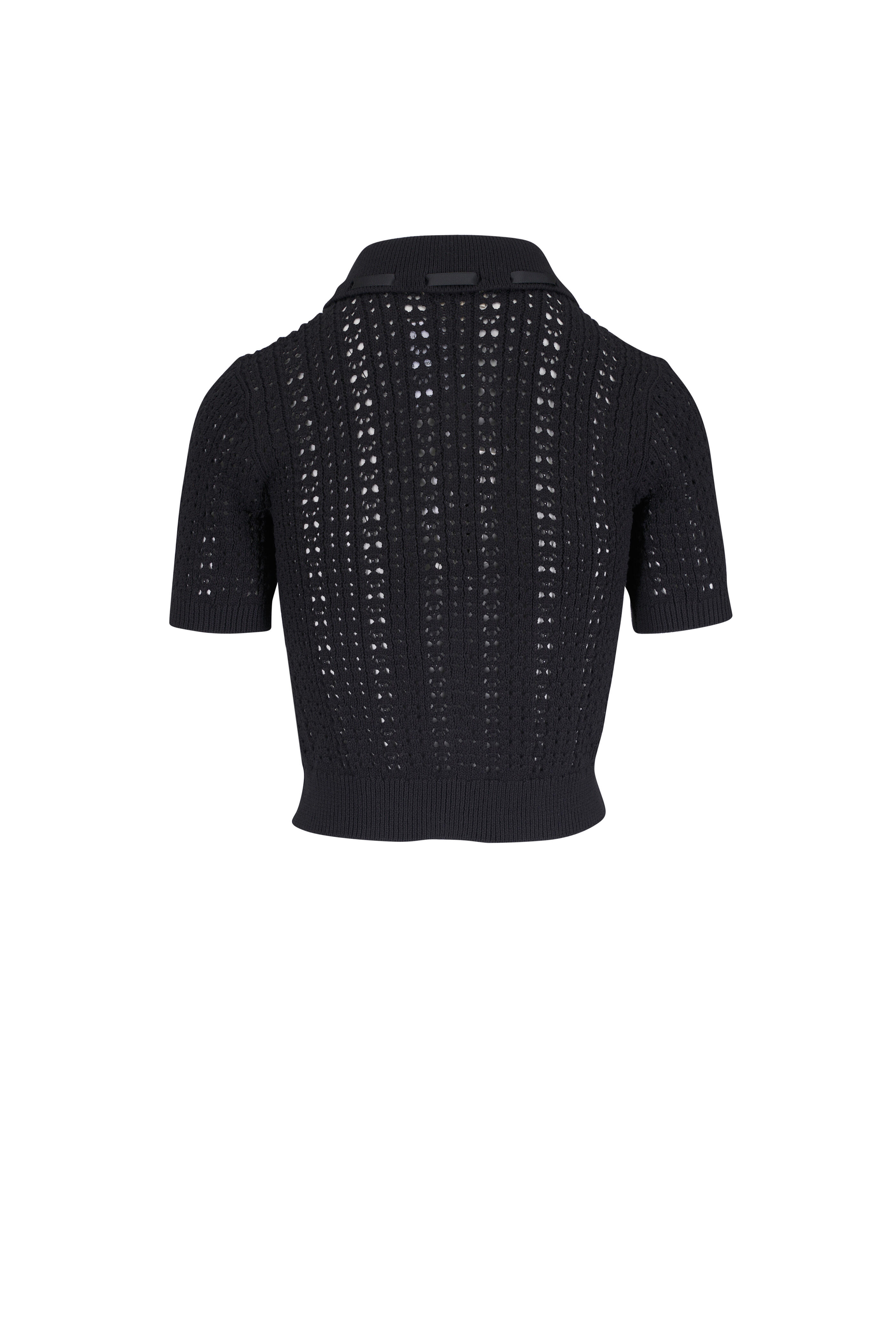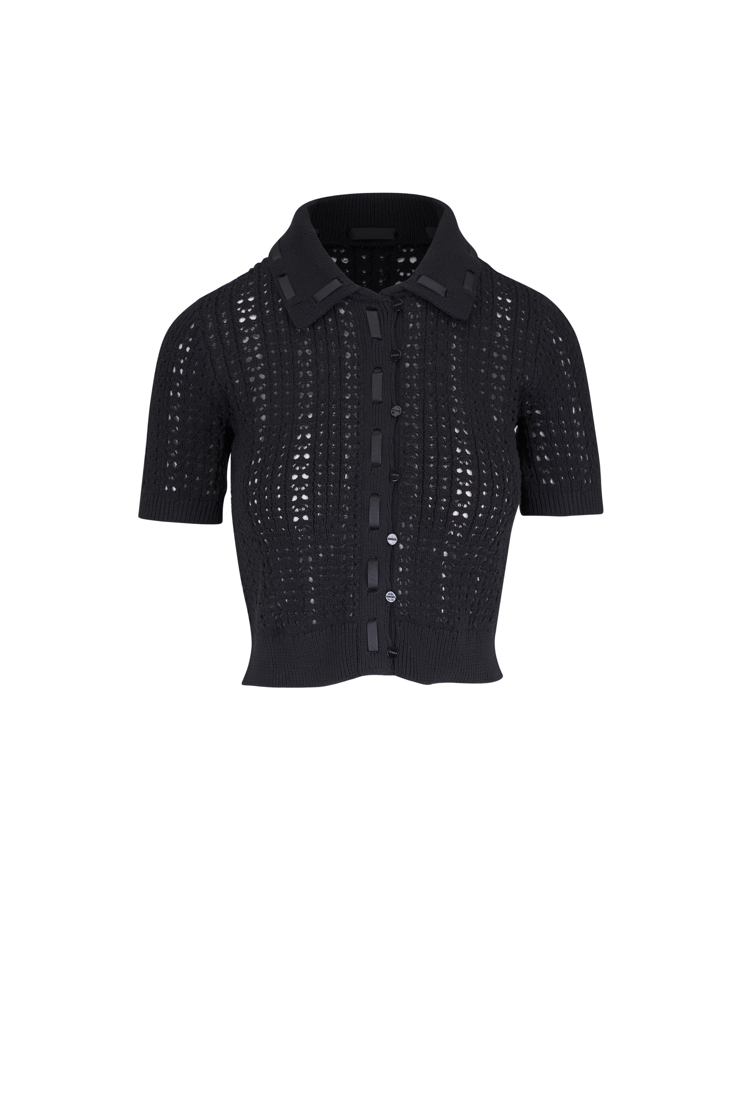 Front button closure. Grosgrain ribbon trim. Pointelle knit. Imported. About 18.2" From Shoulder to Hem. Sleeve Length: 8.25". 57% nylon, 19% polyester, 15% acrylic, 9% wool; unlined. Dry clean.