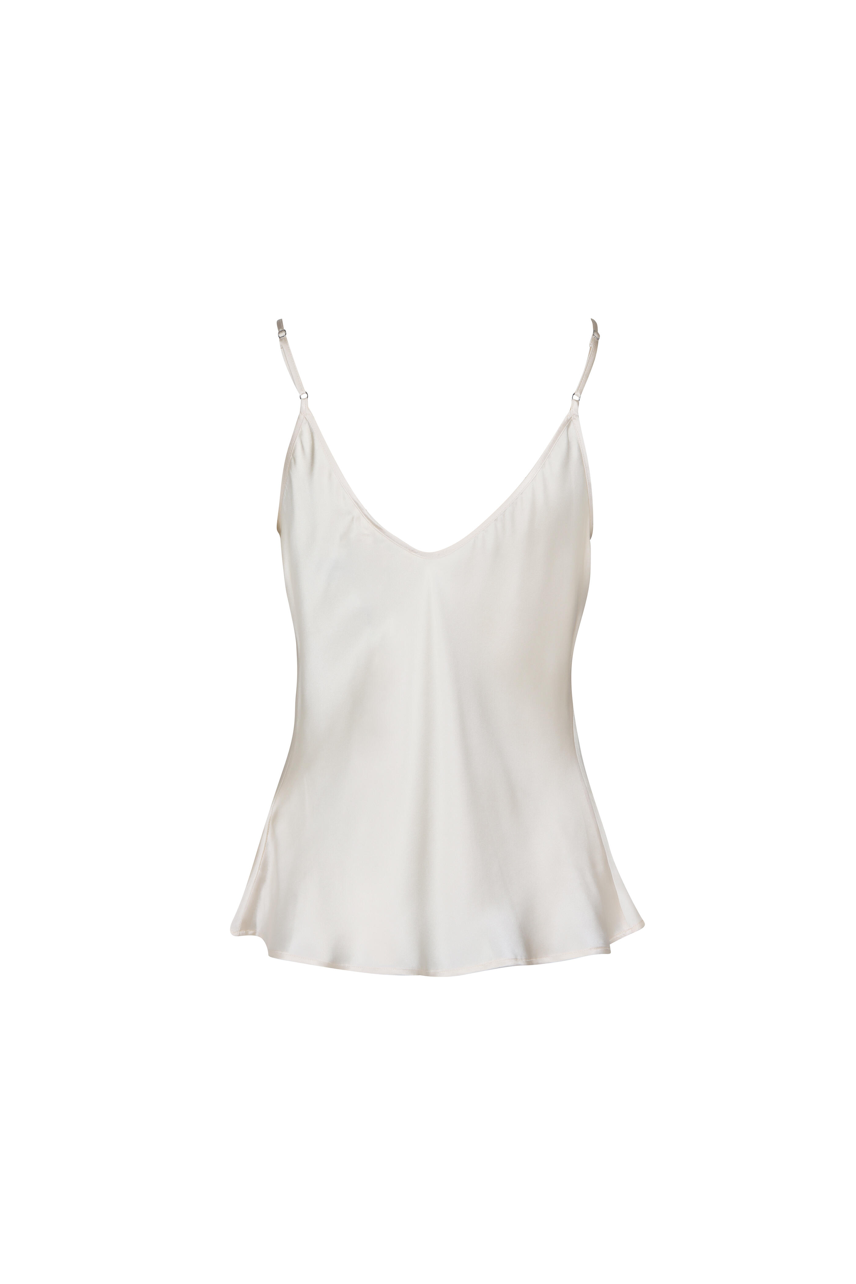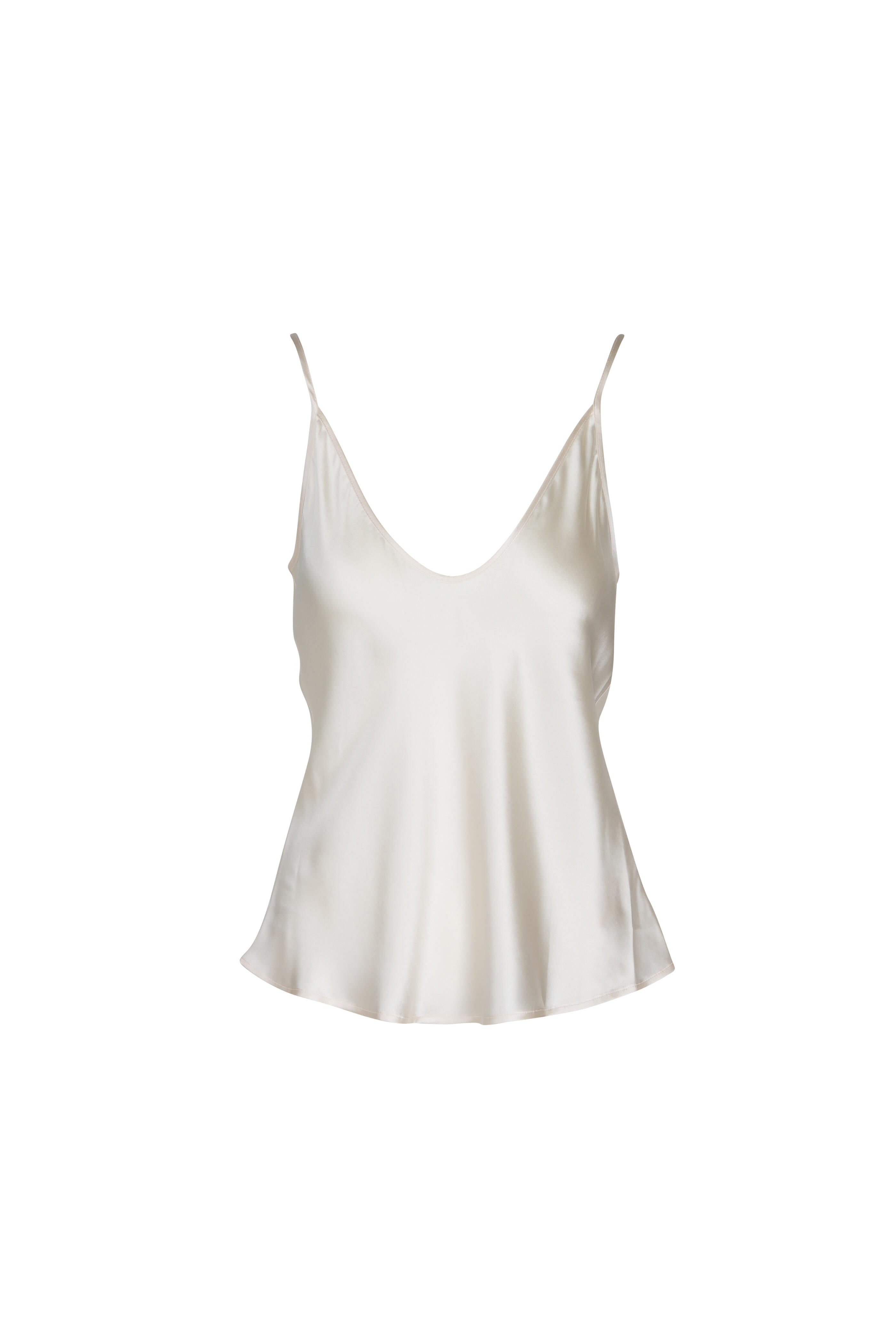 Deep scoop neck. Adjustable spaghetti straps. Bias-cut. Straight hem. Imported. About 18.5" From Shoulder to Hem. 100% Silk charmeuse. Dry clean only.