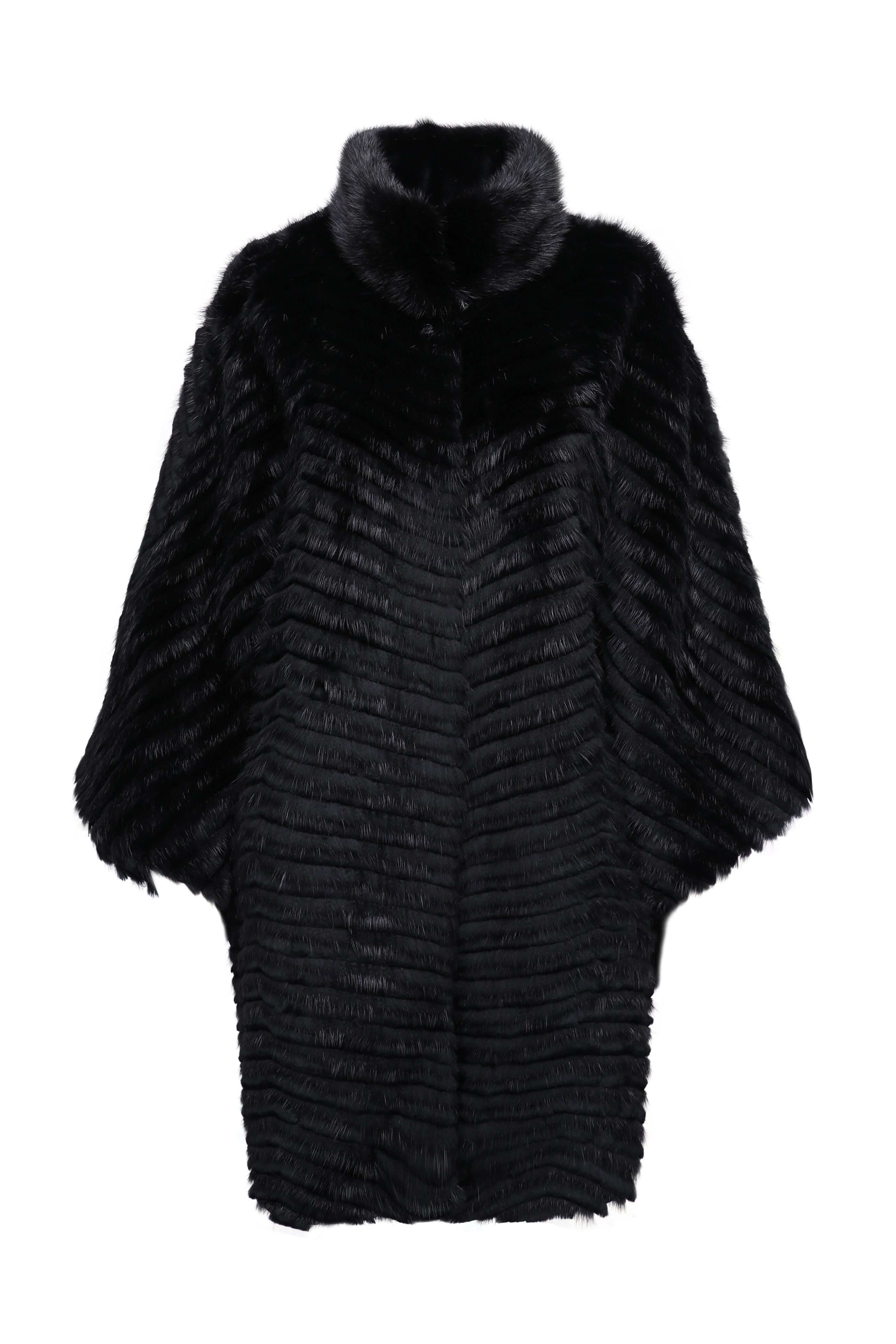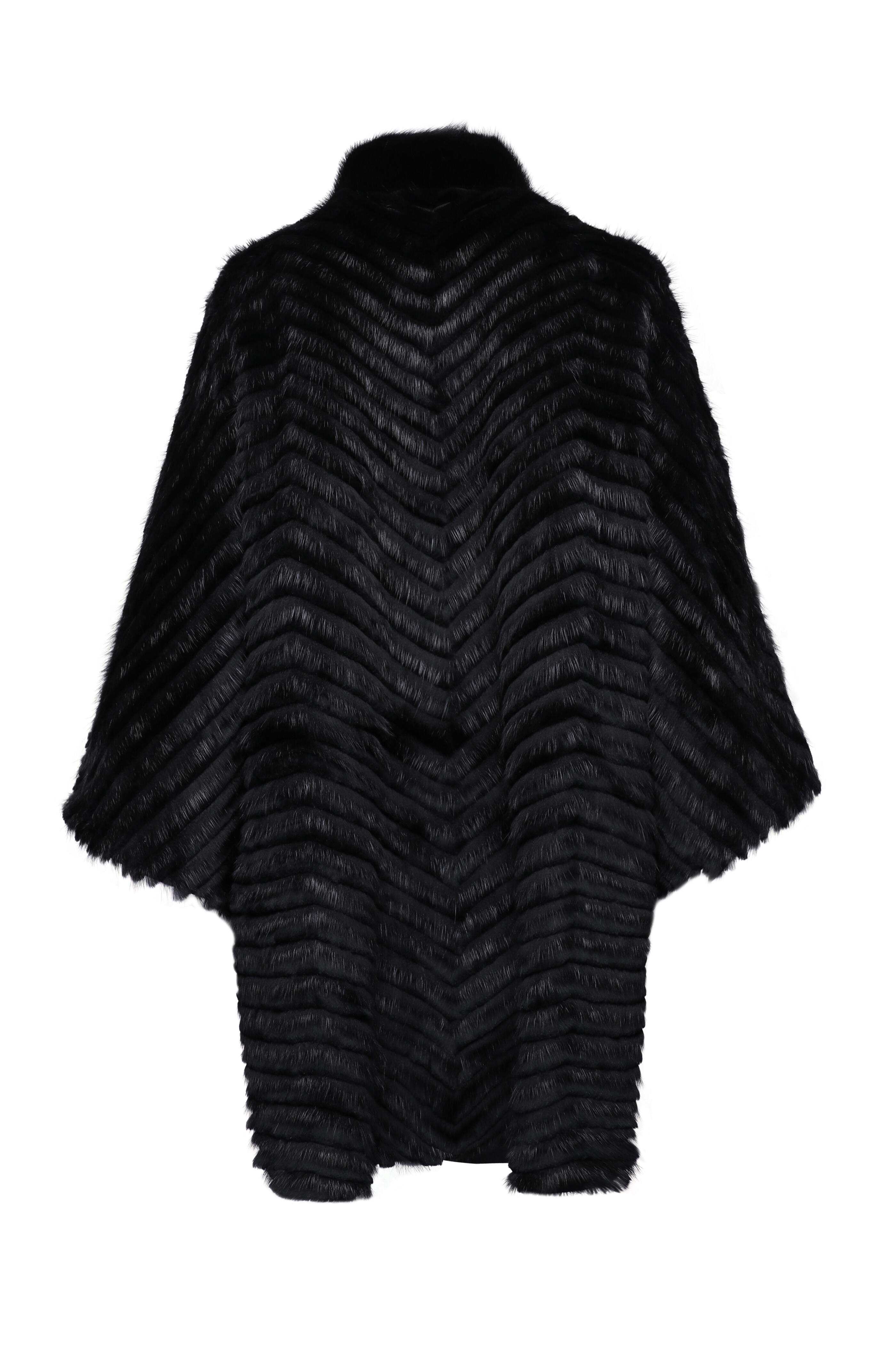 High neck. Snap button closure. Side slip pockets. Three quarter length sleeves. Made in the USA. Fits true to size; looser fitting. 100% mink fur; 100% cashmere blend lining. Dry clean only.