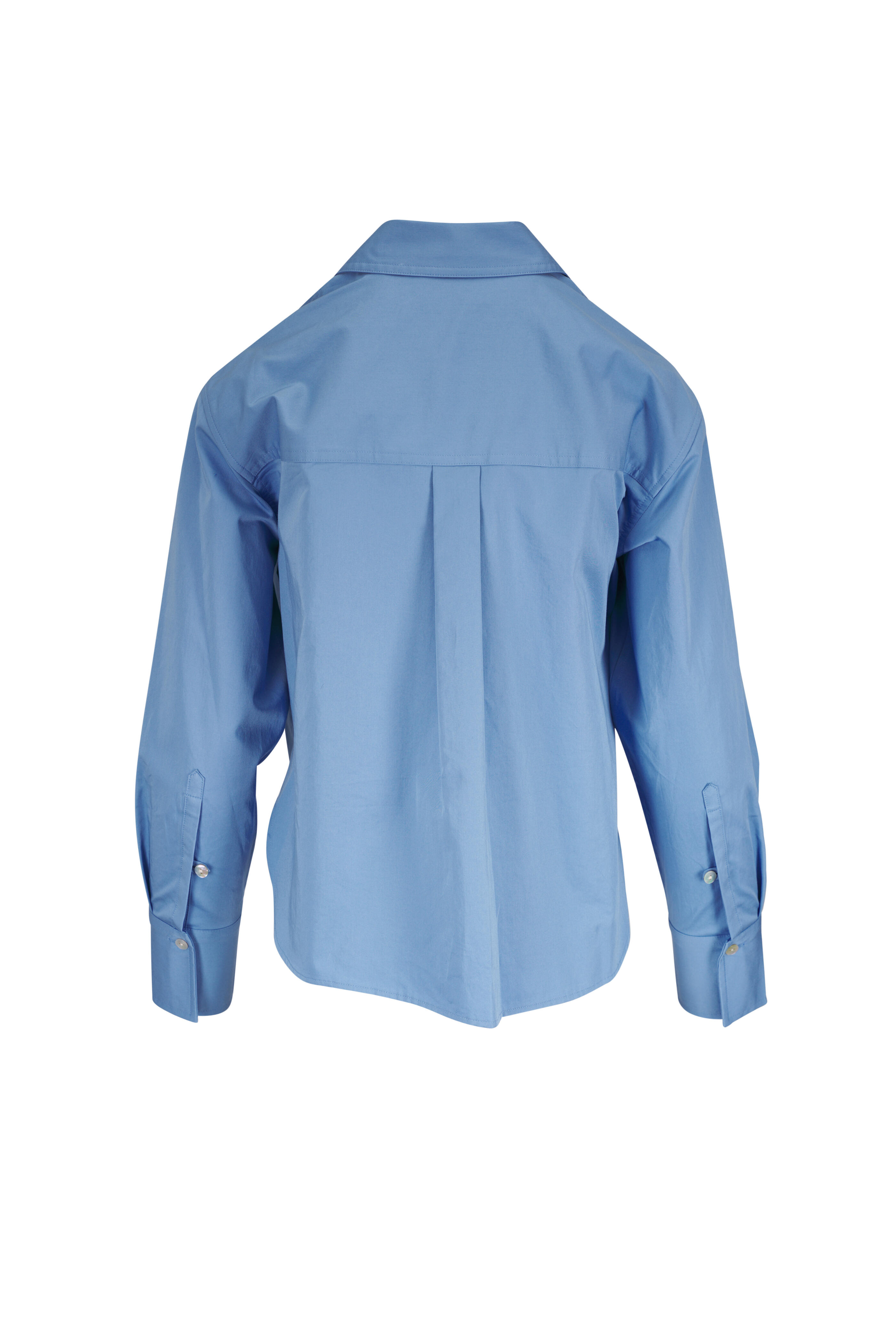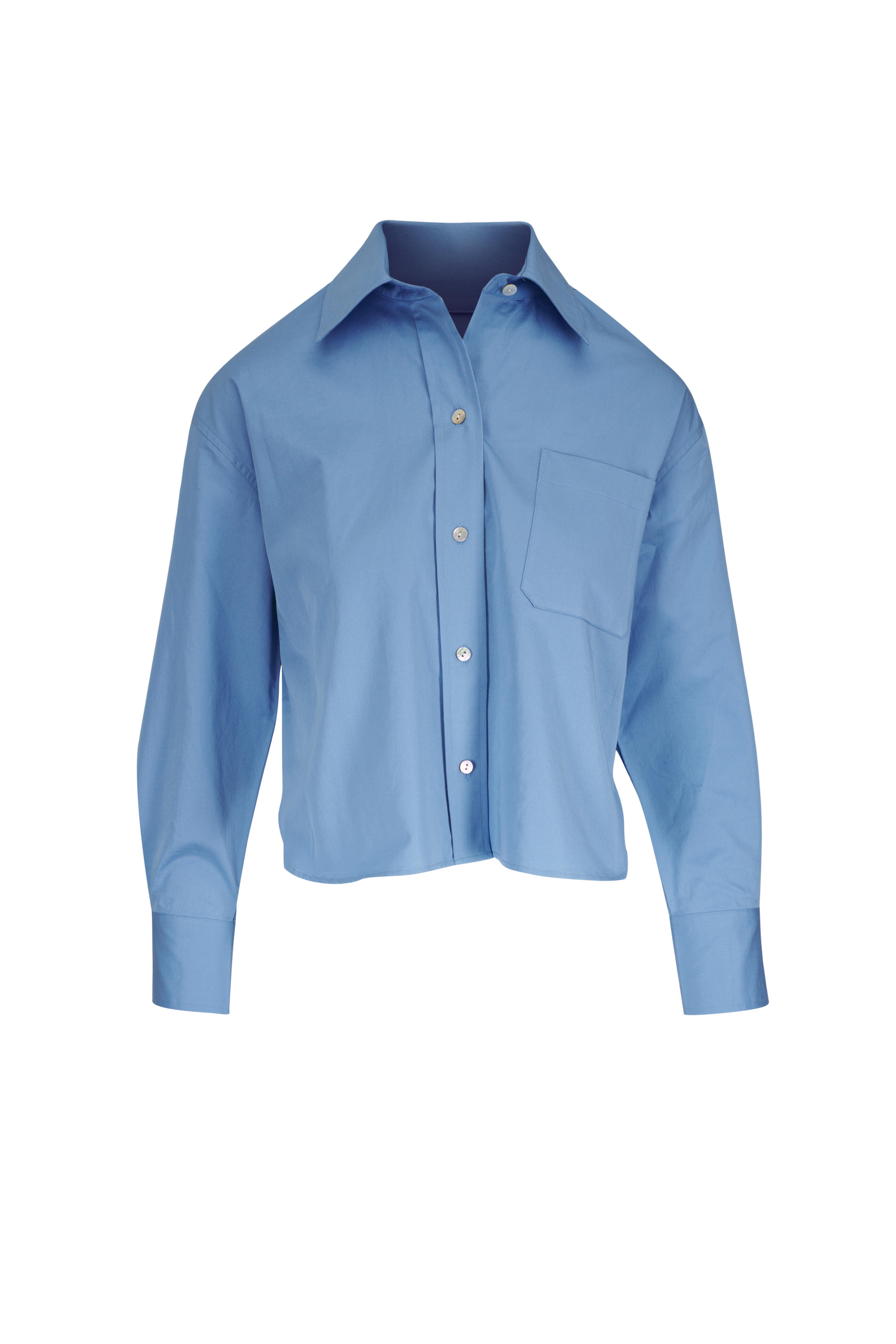 Spread collar. Front button placket. Chest patch pocket. Single button square cuffs. Shirttail cropped hem. Imported. Shoulder to hem 22" (size xxs). 100% Cotton. Machine wash.