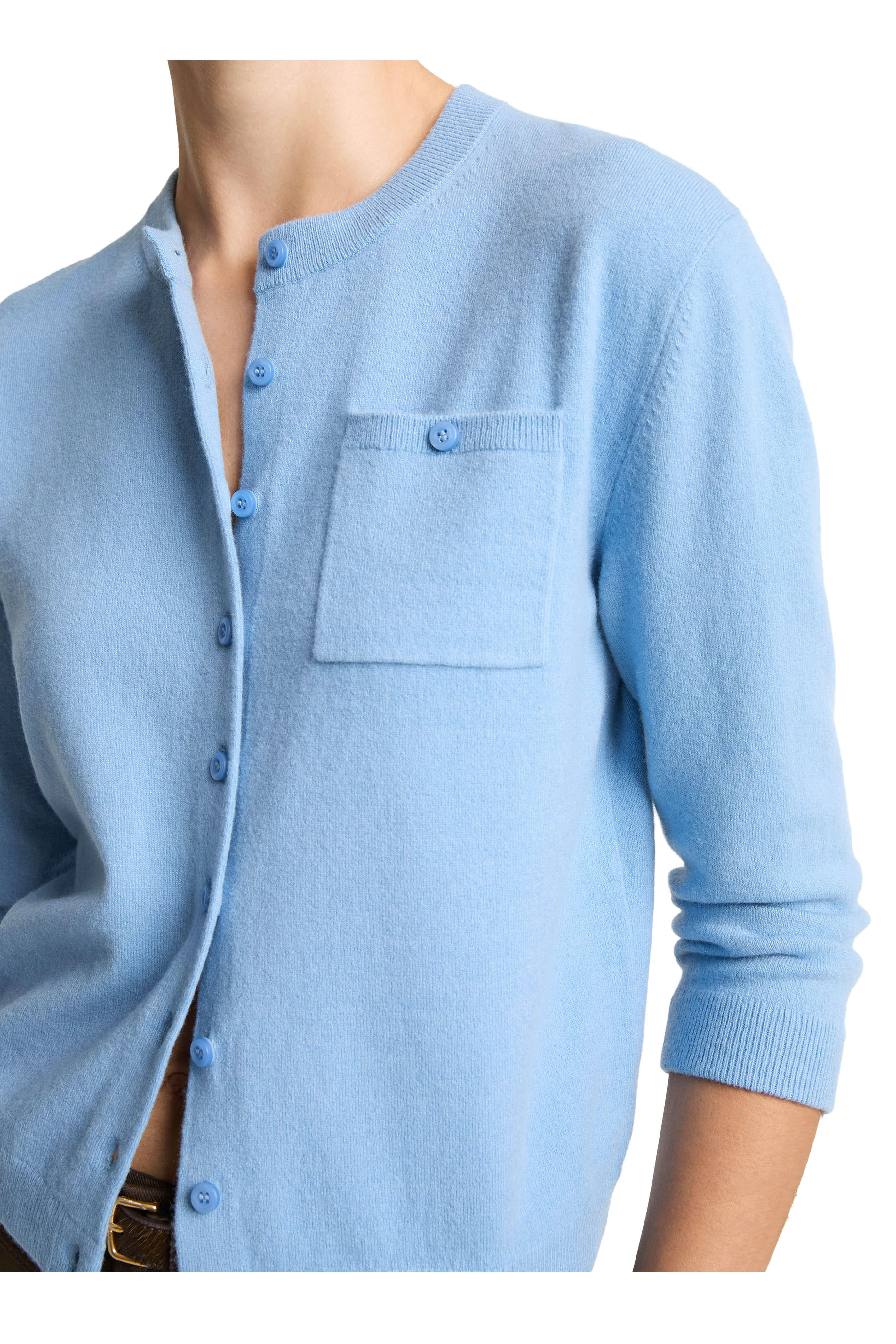 Crew neckline. Front button placket. Button-through patch chest pocket. Ribbed trims. Straight hem. Imported. Shoulder to hem 20" (size xs). 67% Wool, 25% cashmere, 6% nylon, 2% spandex. Hand wash.