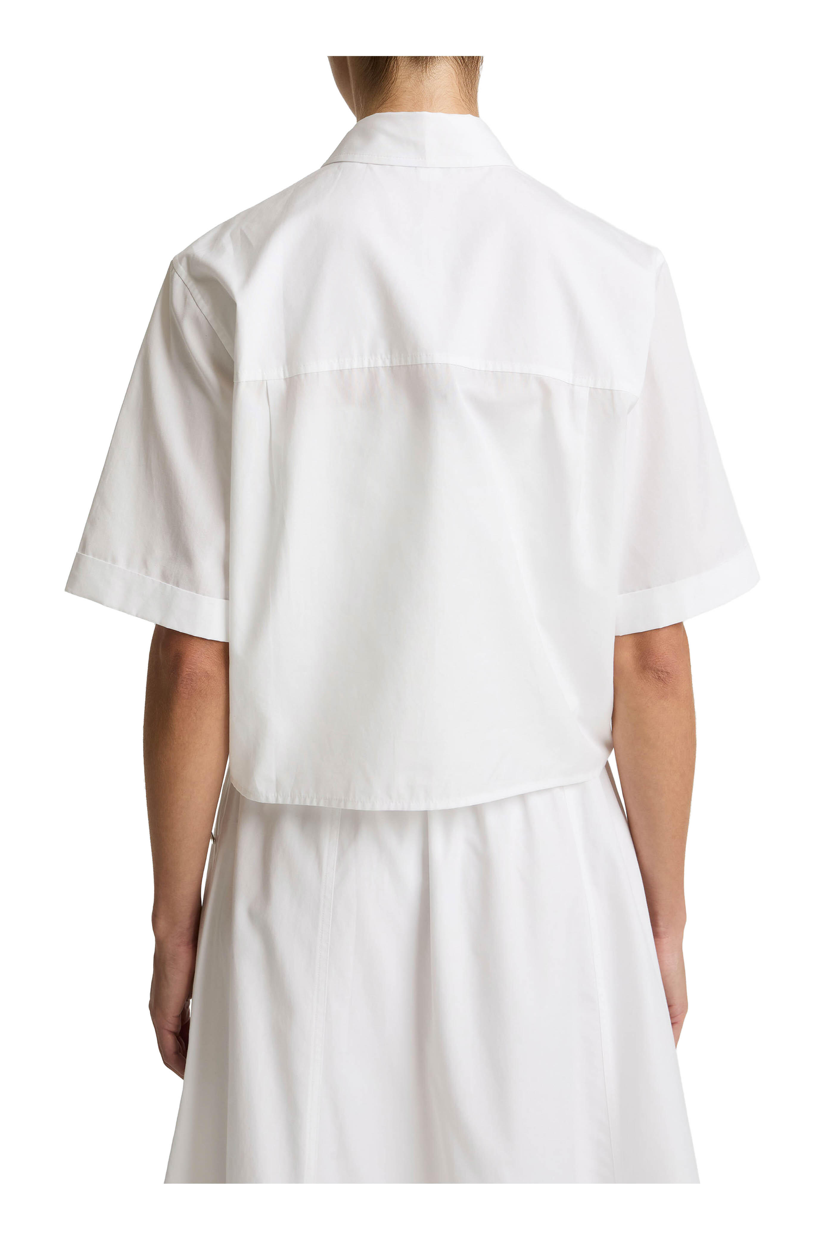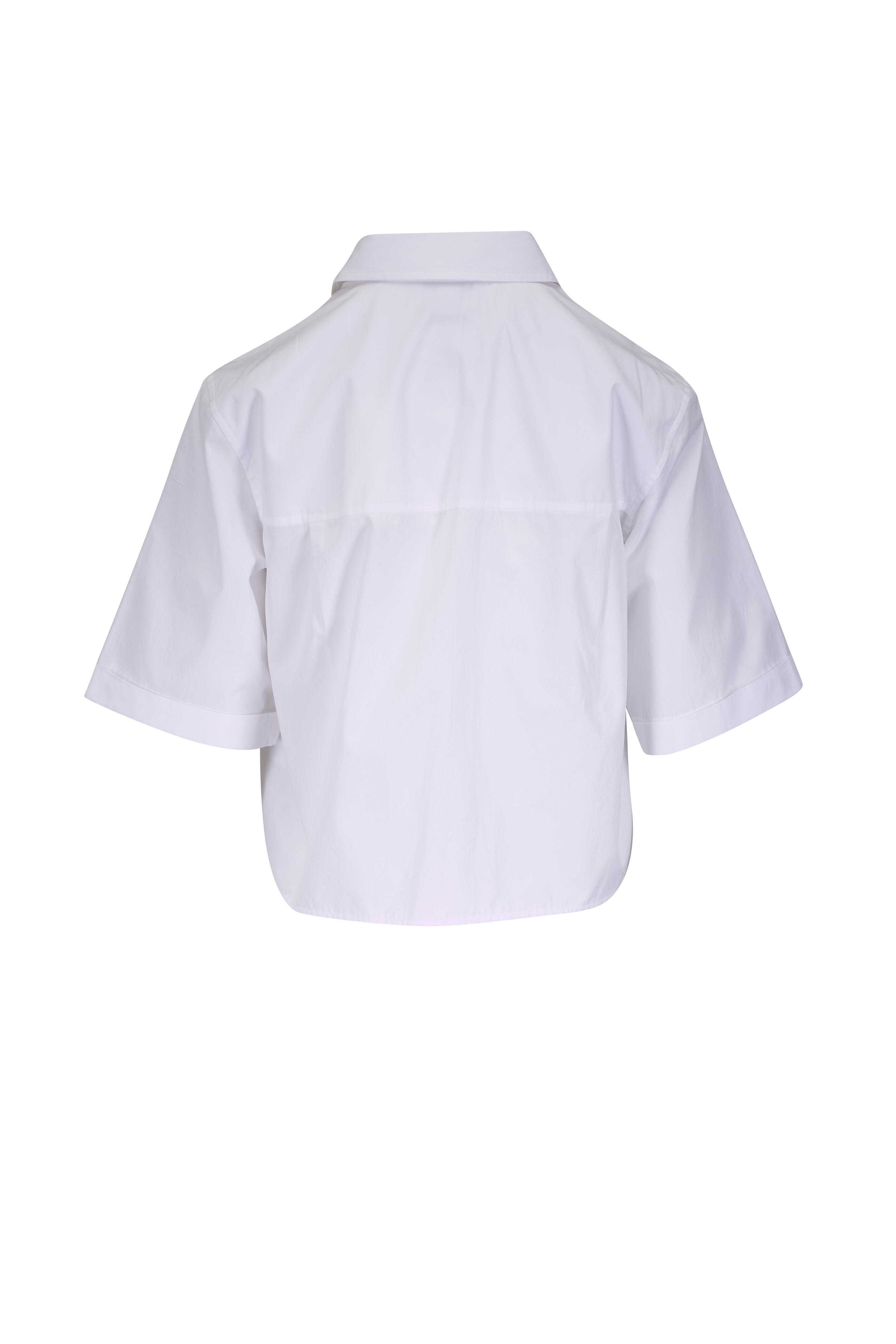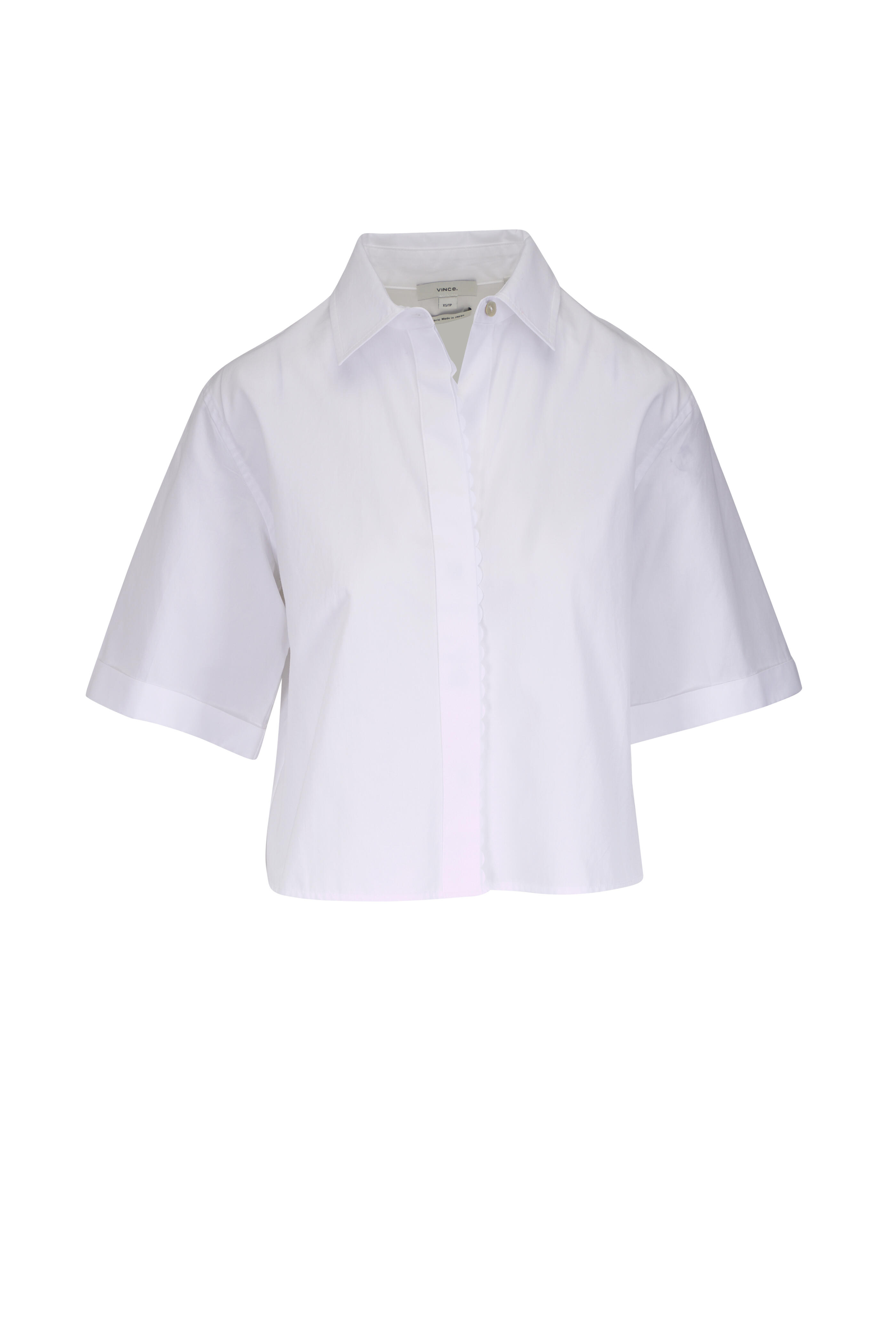 Spread collar. Concealed button-front closure. Cropped fit. Imported. 100% cotton. Dry clean.