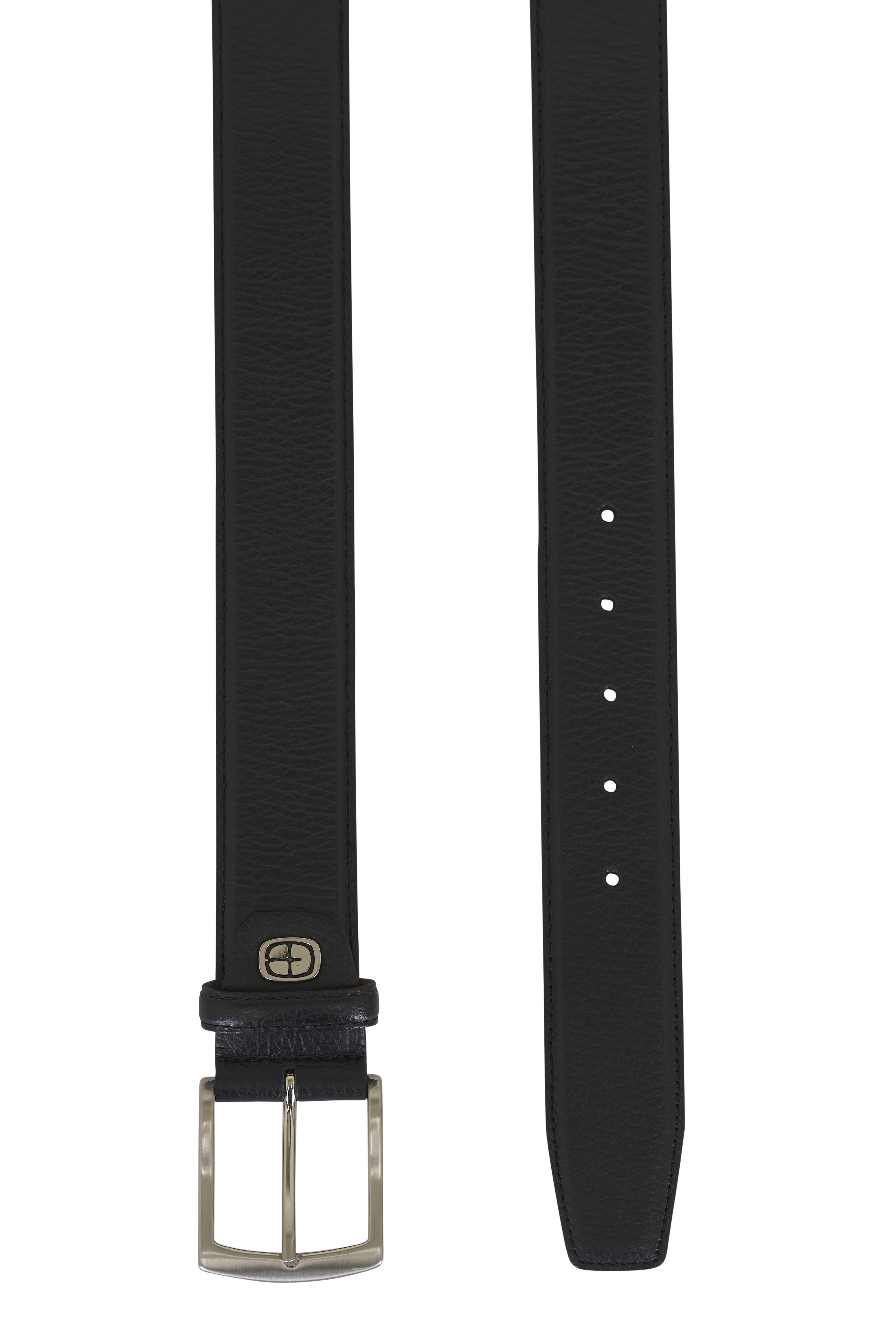 Grain leather. Brushed silver square buckle. Single loop keeper. Tapered tip. Made in Italy. Width: 1 ½".