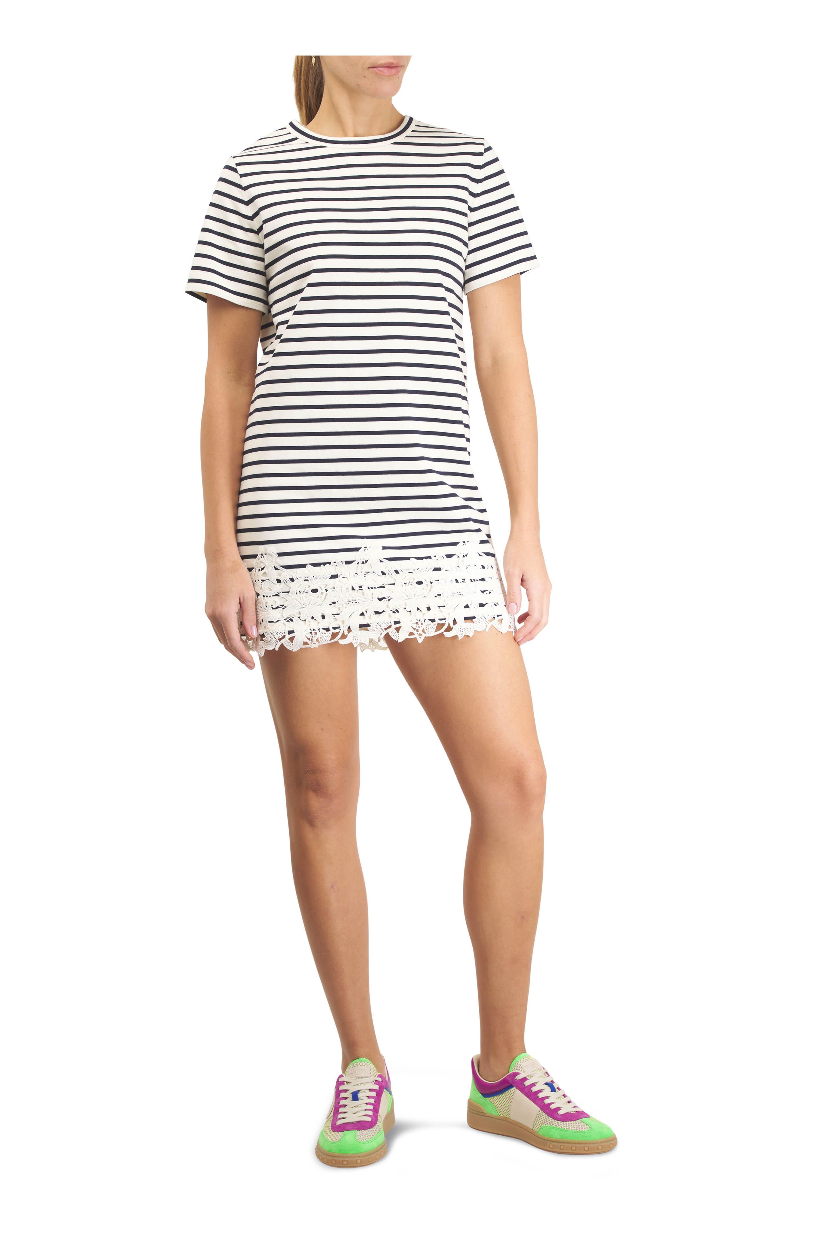 Crew neckline. Pullover style. Floral lace at hem. Straight hem. Imported. Shoulder to hem 31" (size xs). 100% Cotton; lined. Machine wash.