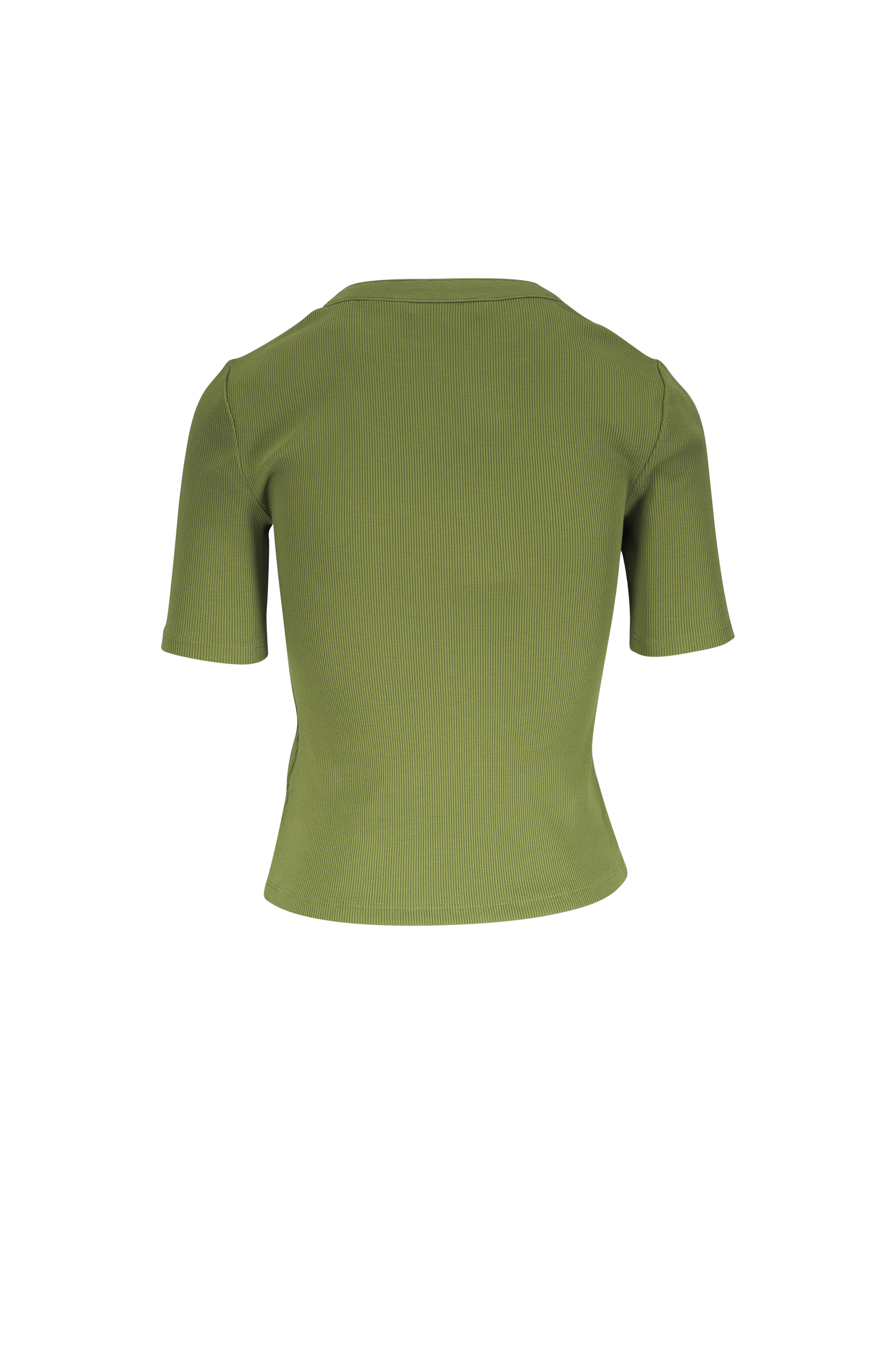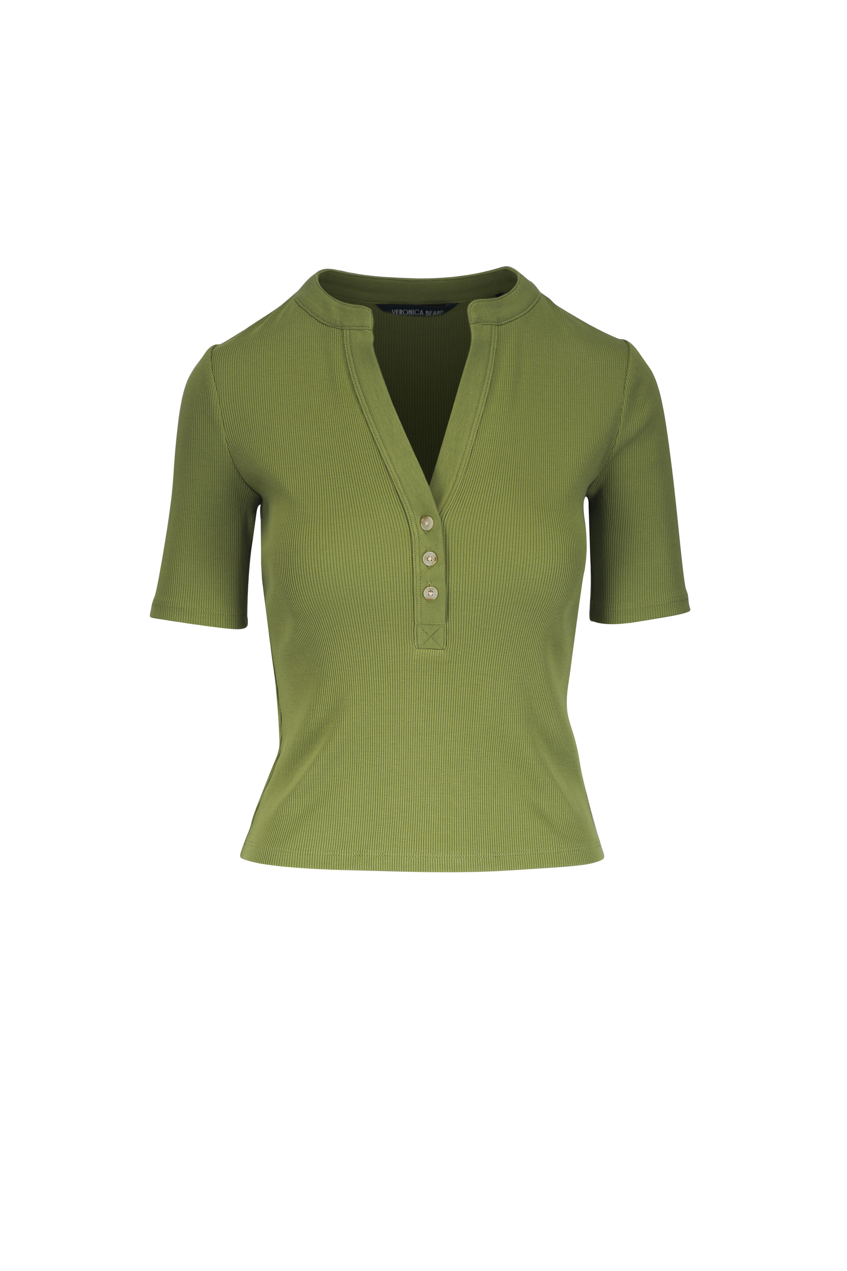 Deep v-neckline. Three button placket. Half sleeves. Ribbed throughout. Imported. 96% cotton, 4% elastane. Machine wash.