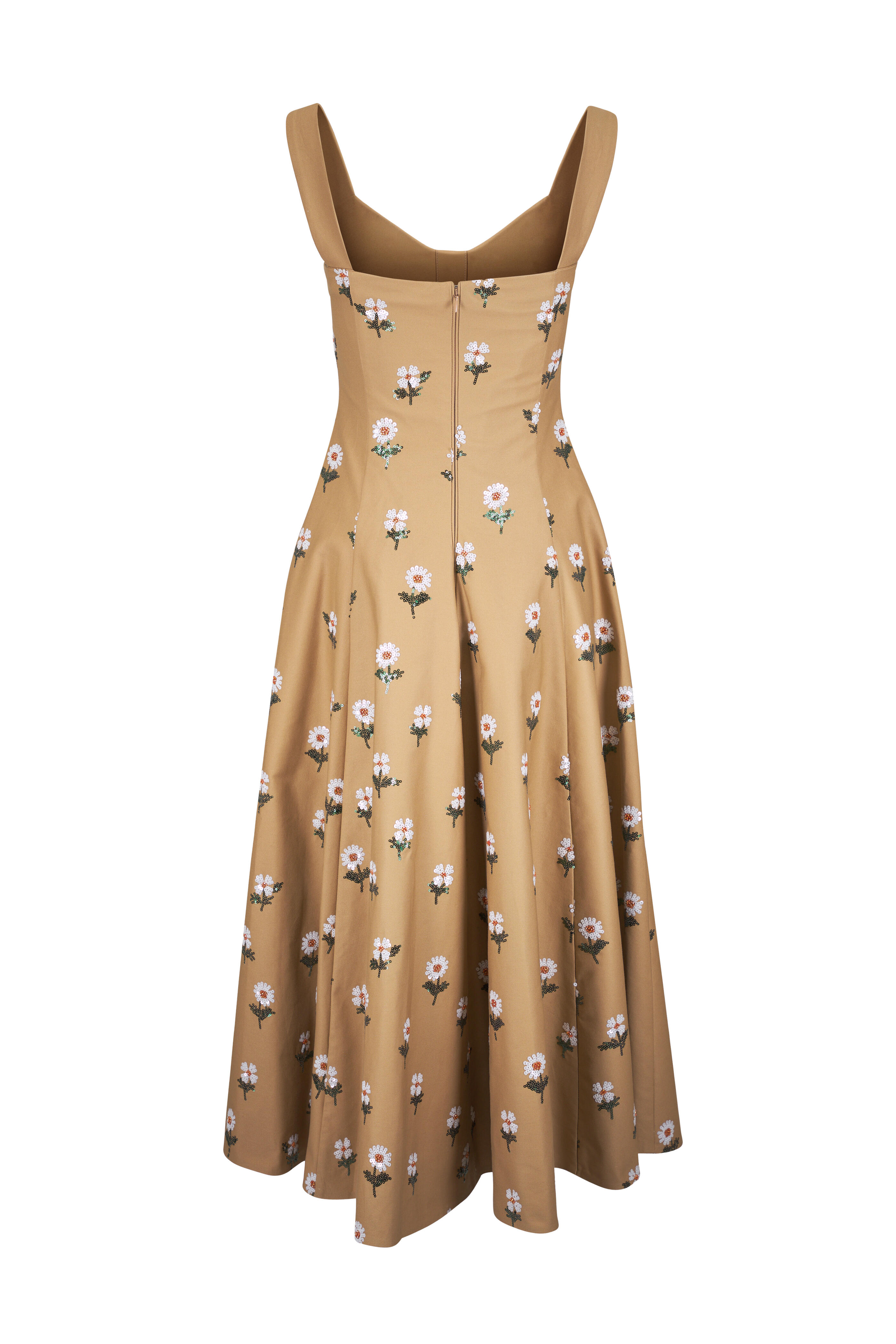 Sweetheart neckline. Concealed back zip. Front pockets. All over floral sequins applique. Imported. 51" shoulder to hem. 100% cotton; lined: 60% acetate, 40% cupro. Dry clean.