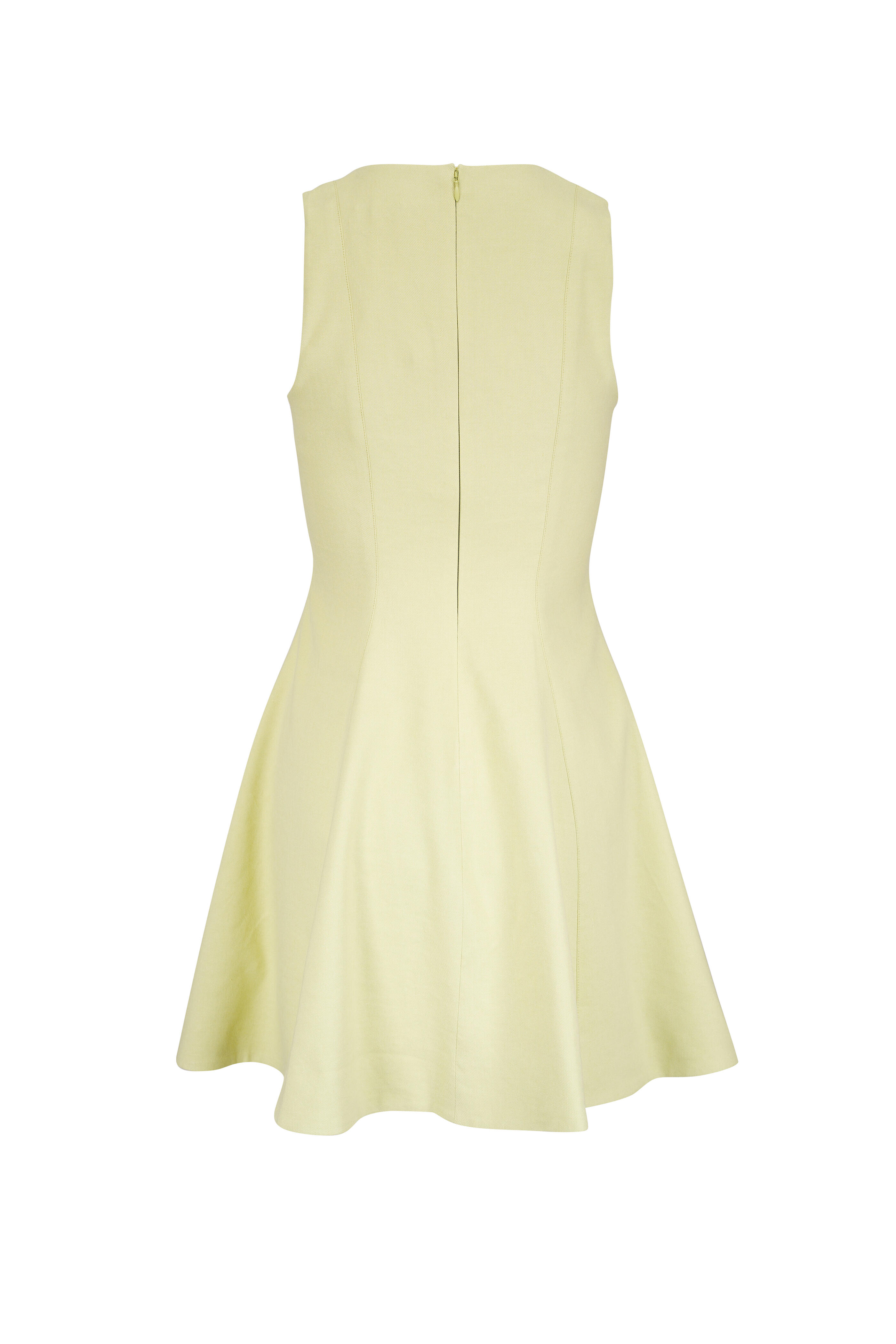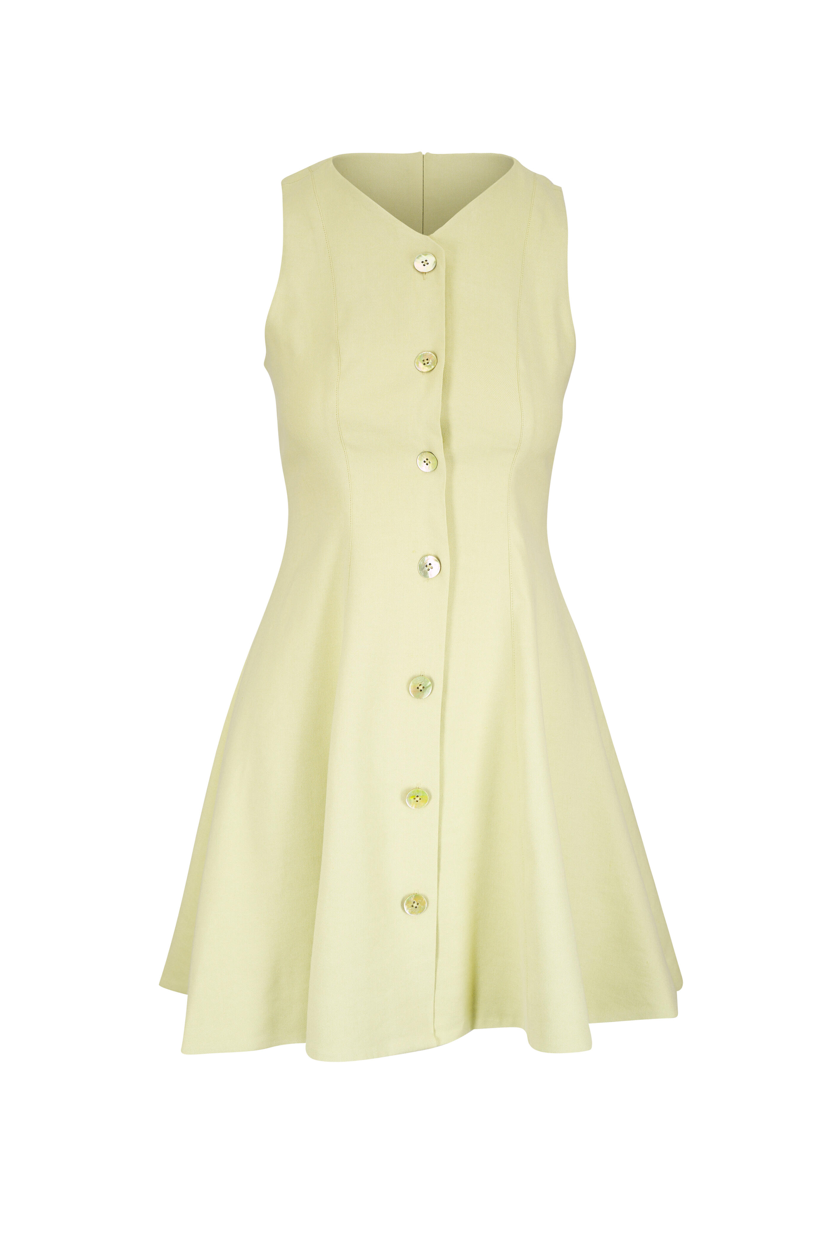Baby v-neckline. Front button placket. Slightly flared hem. Imported. Length: 35 ¼" (measurements from size 2). 55% linen, 44% viscose, 1% elastane; lined. Dry clean.