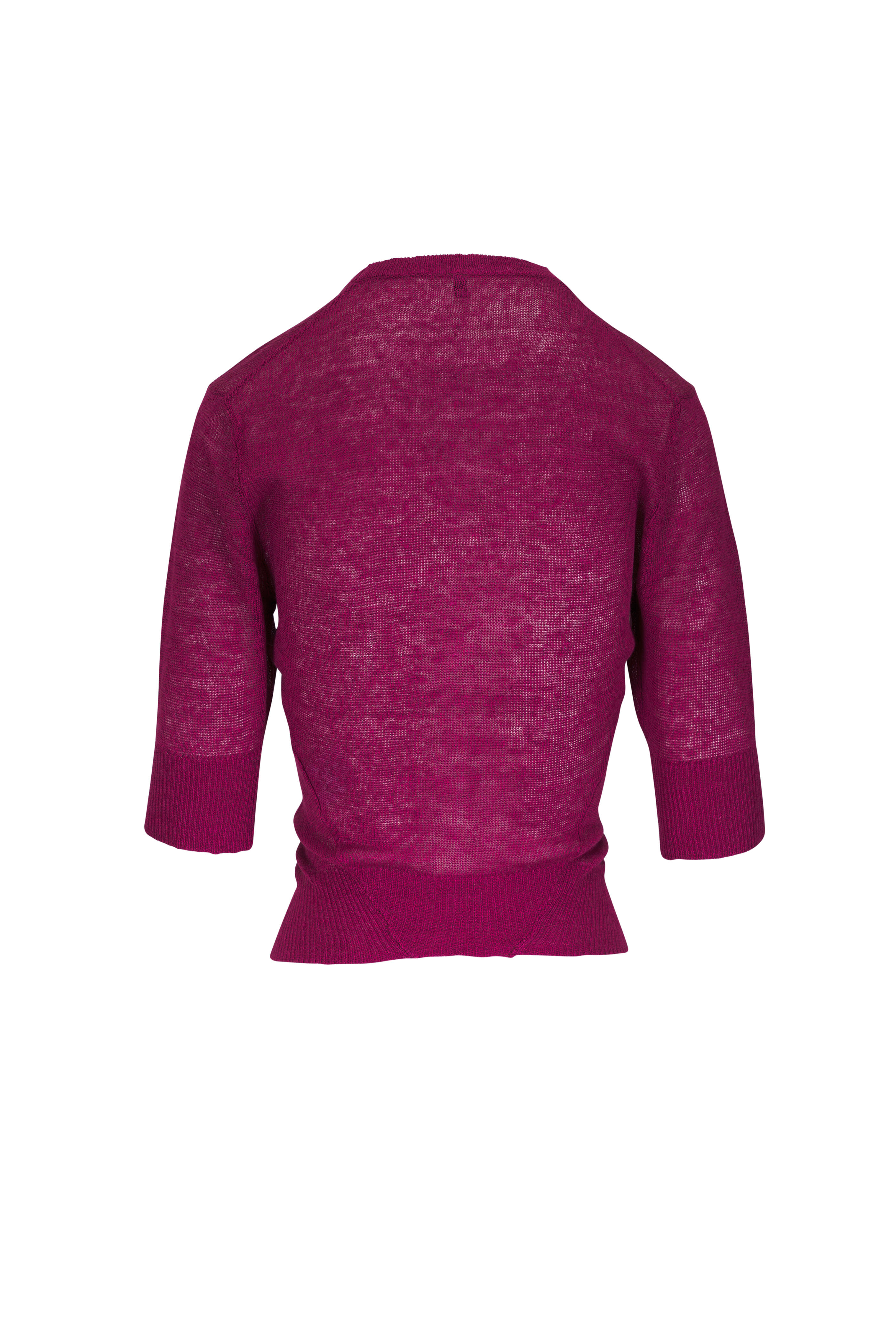 Deep v-neckline. Front button placket. Elbow length sleeves. Ribbed knit trim. Imported. Approx. 22 ½" shoulder to hem (measurements from size XS). 100% linen. Hand wash.