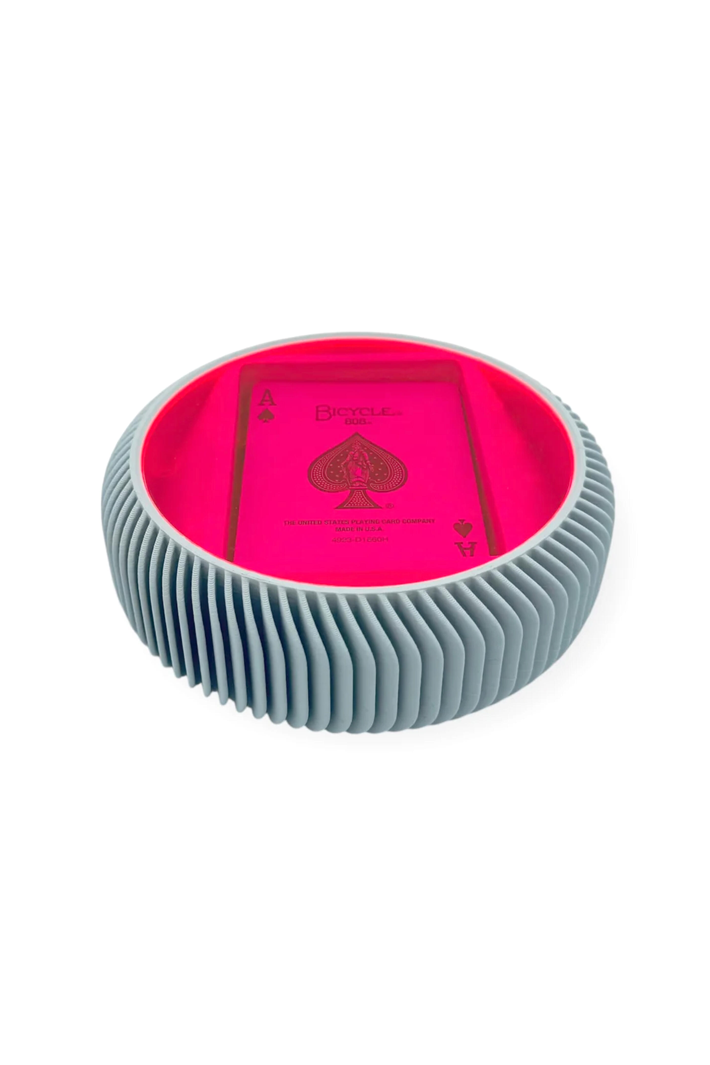 3D printed with sustainable and recyclable filament, its fan shape edge can only be achieved with this technique. To open La Redonda you press down on the side of the lid to lever it open. With the lid off press down on the top or bottom of the cards to make them pop up and remove a single card or the entire deck easily.. Comes with a single standard index deck of playing cards with a red or blue back.. 100% recycled plastic.