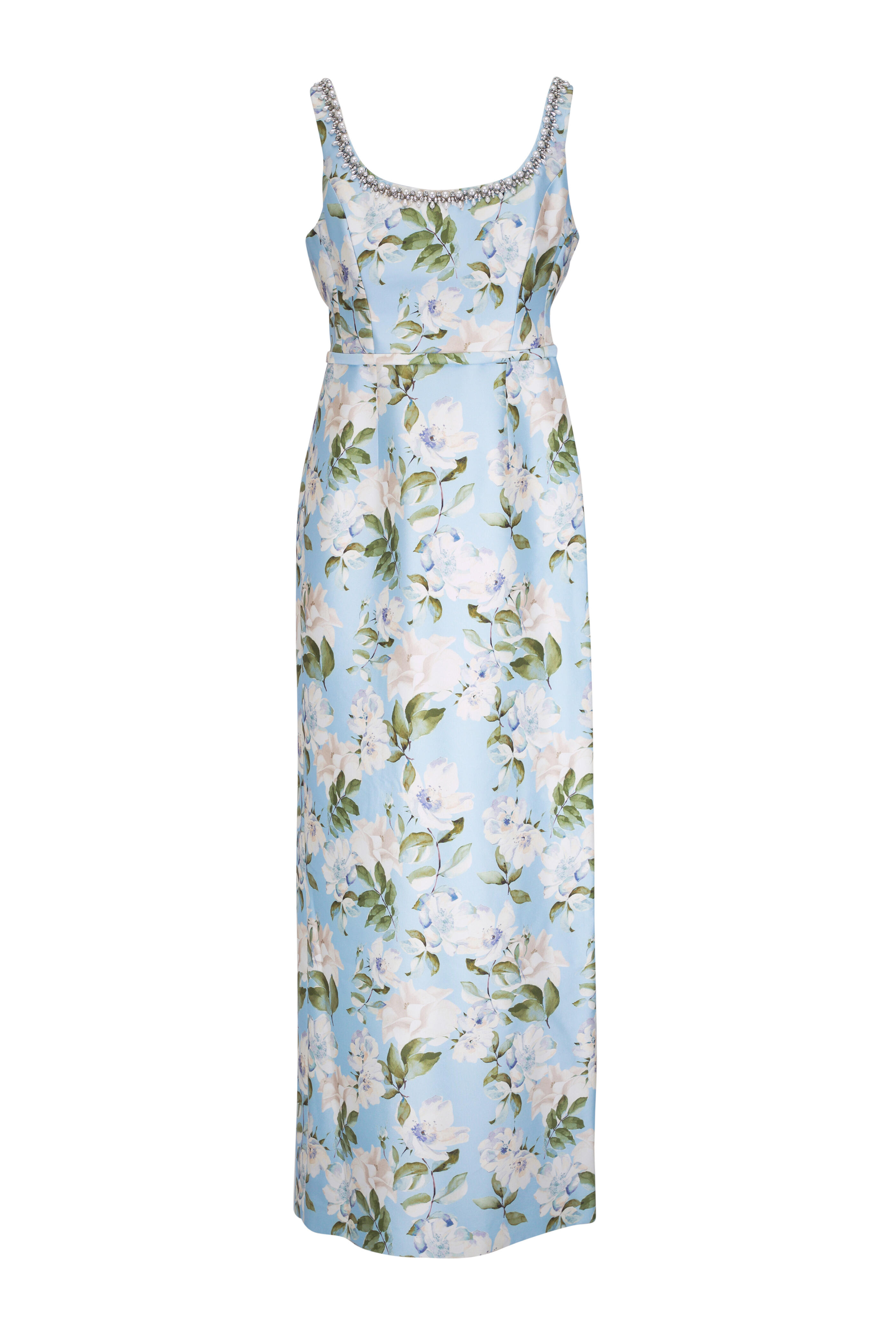 Scoop neckline; beaded. Concealed back zip. Self belt. Back vent. Straight hem. Imported. Shoulder to hem 58" (size 6). 97% polyester, 3% spandex; lined. Dry clean.