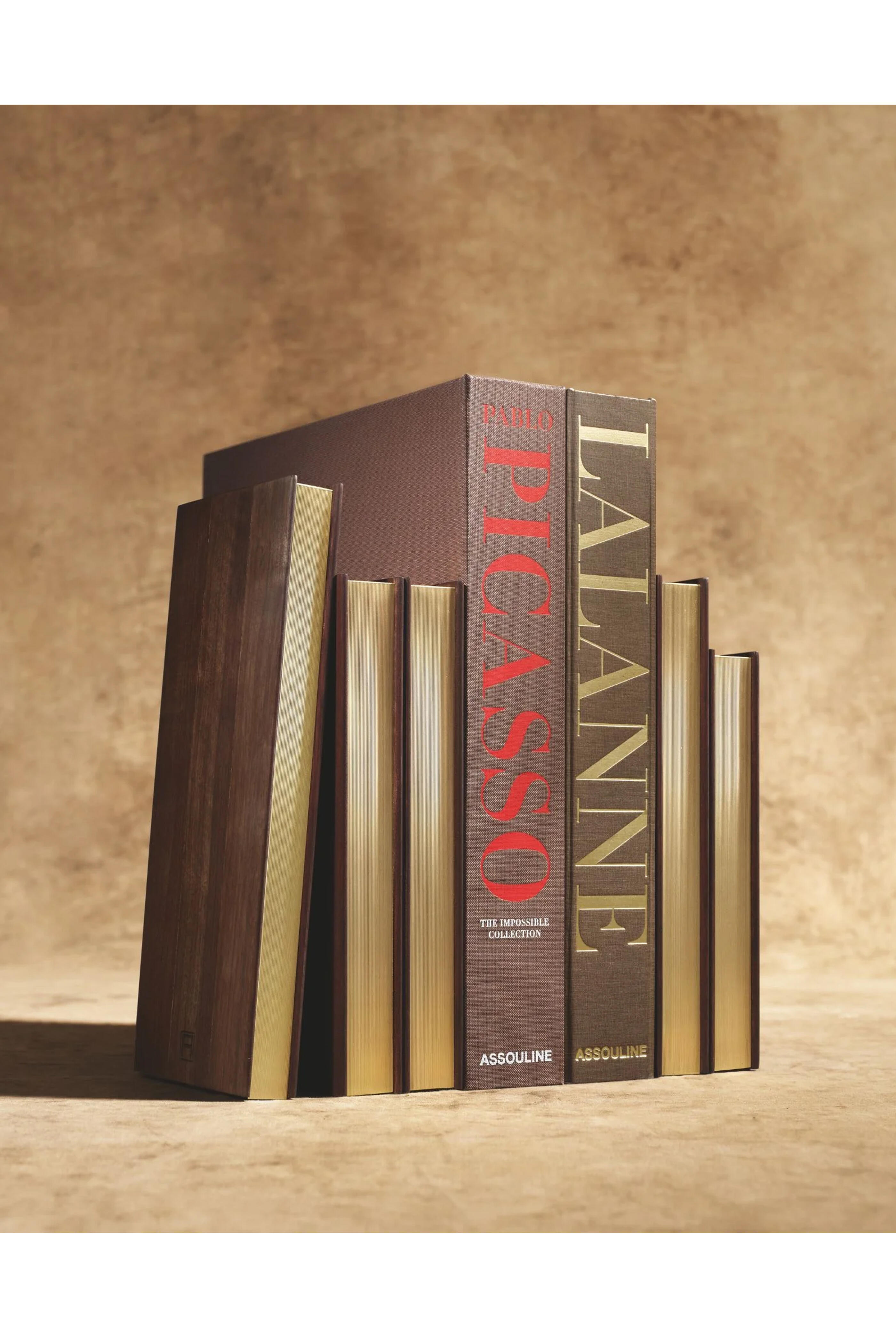 - The Library Bookends master the art of sophistication. Conceived to mimic a stack of rare books, each set includes two book-shaped sculptures, designed in walnut wood with brushed brass pages, providing a refined and functional display to elevate the aesthetic of every collector’s library.