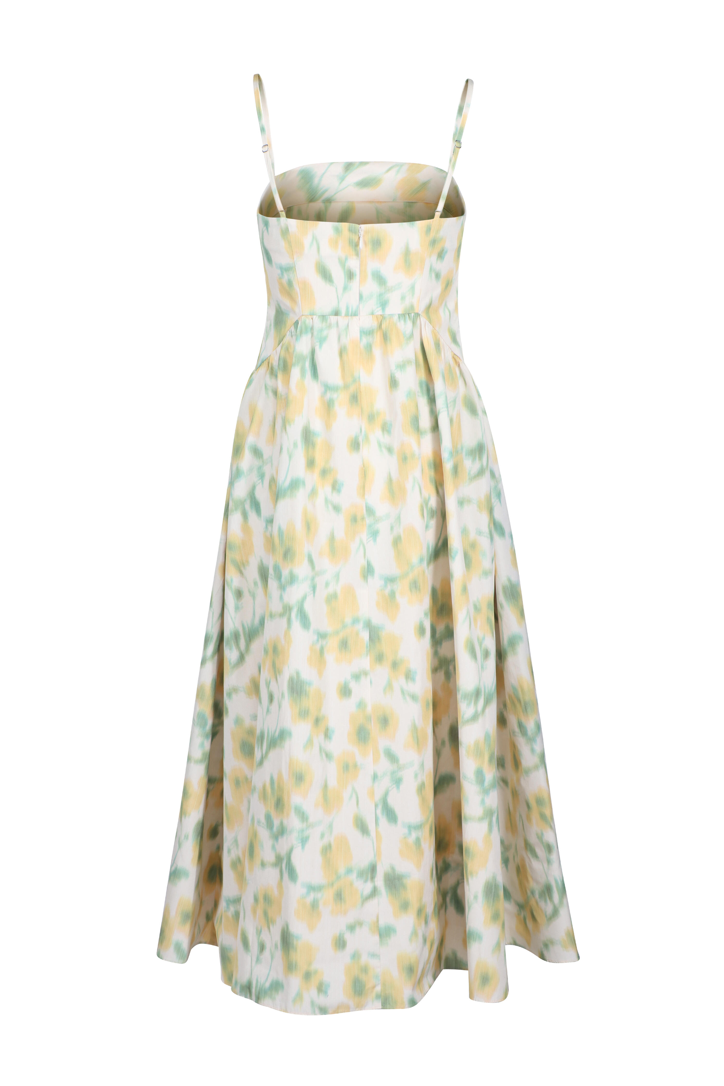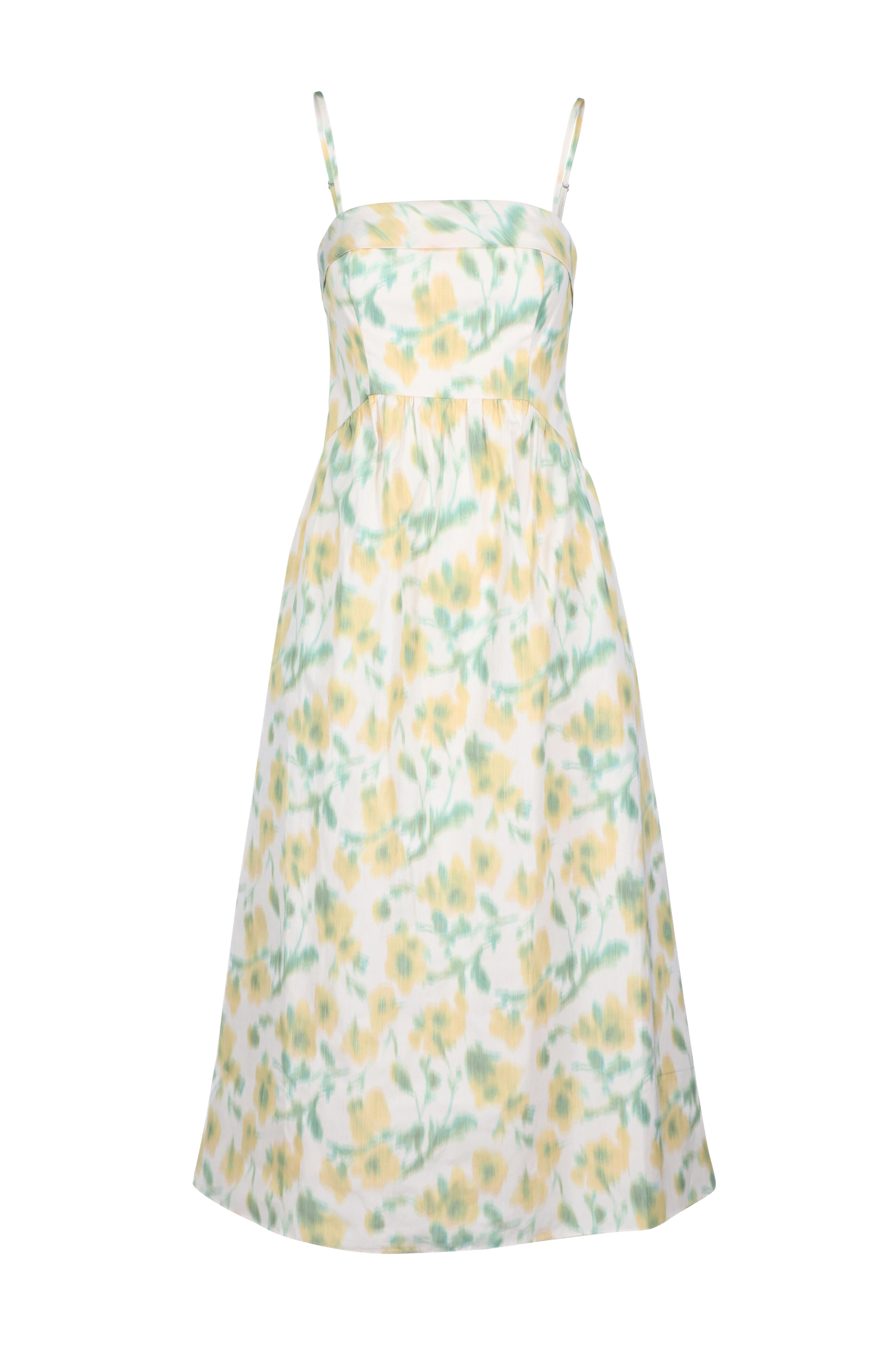 Straight neck. Adjustable straps. Gathered waist. Floral printed taffeta. Hidden side zipper. On seam pockets. Imported. True to size.. 50% Polyester 32% Cotton 18% Linen. Dry clean only.